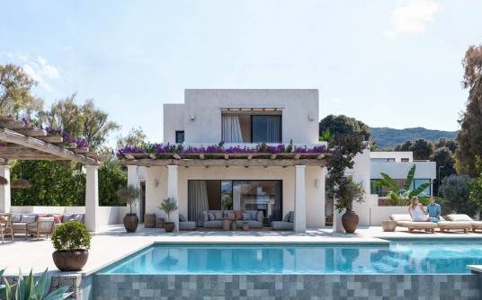 El exterior de la villa cuenta con un amplio jardín con una gran terraza y una gran piscina para disfrutar de maravillosos momentos al aire libre y disfrutar de las magníficas vistas, además tiene espacio para varios coches.