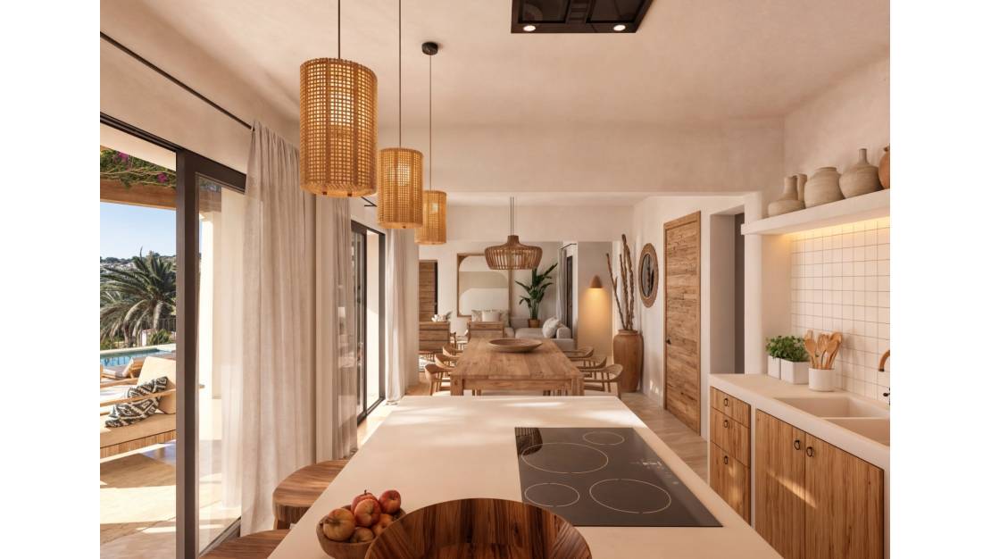 Junto con la moderna cocina abierta equipada con aparatos de alta calidad, el luminoso y espacioso salón forma el corazón de la casa. Desde el salón se accede sin esfuerzo a la terraza y la naya, donde la piscina privada, cómodas zonas de estar y una atractiva cocina exterior invitan a relajarse. La propiedad también cuenta con cuatro amplios dormitorios, todos con baño en suite.