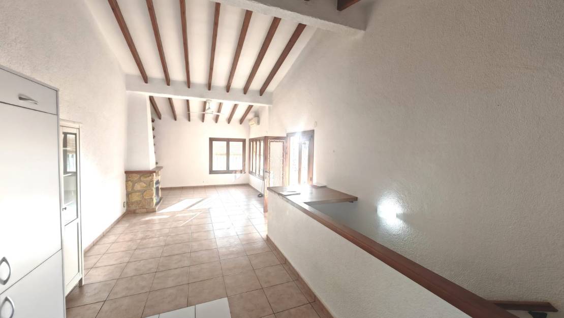 Al entrar, le recibe una espaciosa cocina abierta y totalmente equipada que se integra a la perfección con el comedor y un amplio salón. El salón cuenta con una acogedora chimenea central, ventilador de techo y aire acondicionado, lo que garantiza un ambiente confortable durante todo el año. Desde el salón, se accede a una encantadora terraza con un parasol que cubre todo el espacio, ofreciendo vistas despejadas y un refugio al aire libre perfecto.
