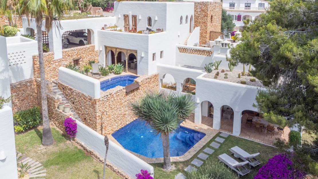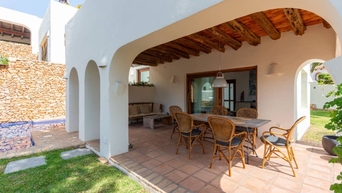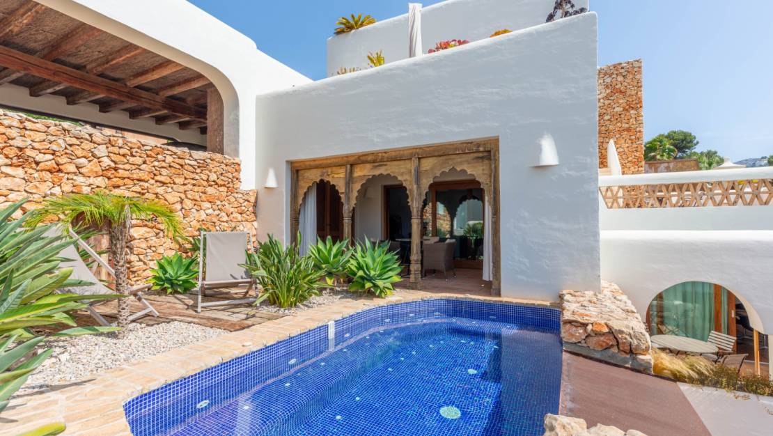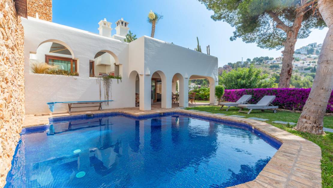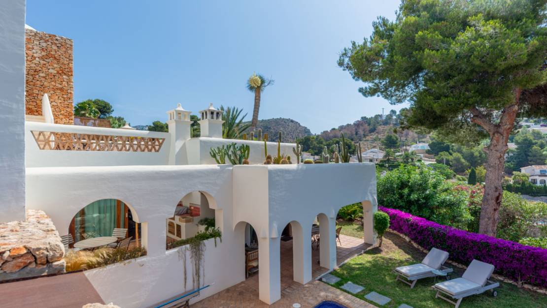 Villa de estilo ibicenco en El Portet Moraira. Esta hermosa villa, construida en 2007 y completamente renovada en 2024, está a la venta. Una casa acogedora y elegante a solo 1 km de la playa de El Portet. Accedemos al recibidor con servicio de cortesía y encontramos un amplio salón con dos porches con vistas al mar, que bordean la piscina, el jacuzzi en la misma planta y el jardín. Desde el salón, accedemos a un amplio salón-comedor junto a la cocina con lavadero. En la planta superior se encuentra el dormitorio principal con baño y vestidor. También encontramos en esta planta una amplia terraza con preciosas vistas al mar y a la montaña. En la planta inferior, encontramos dos dormitorios y un amplio baño. Es posible añadir un segundo baño. Una preciosa bodega y un cuarto técnico. Villa de estilo ibicenco en El Portet Moraira. La casa cuenta con calefacción por suelo radiante y aire acondicionado. Los electrodomésticos son nuevos. Se incluyen muebles de calidad, sistema de alarma y wifi. El jardín cuenta con riego automático. Las ventanas de doble acristalamiento son nuevas. Se ha puesto mucho empeño en crear un ambiente especial con hermosas vigas y detalles. La villa se encuentra en perfecto estado. Hay un aparcamiento cubierto y cerrado para dos coches y otra entrada peatonal. Iluminación en toda la casa y el jardín. Una casa lista para entrar a vivir.