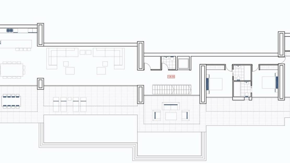 Esta villa de alta calidad tiene 4 plantas que están conectadas por un ascensor y una escalera interior. La planta principal tiene un amplio salón-comedor-cocina de planta abierta. La cocina está totalmente equipada y tiene una isla para cocinar. Las puertas correderas a la altura del techo dan acceso directo a varias terrazas. Además, hay 3 habitaciones dobles, todas con su propio baño y un aseo de invitados. Un nivel más alto hay 2 habitaciones dobles más. Cada uno con baño privado.
