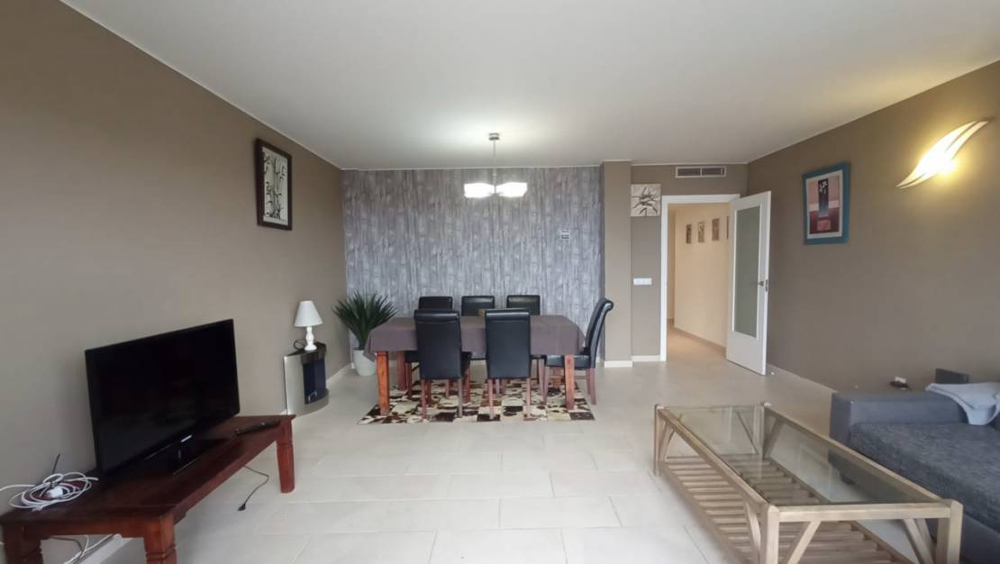 Un salón-comedor con salida a la terraza con vistas al mar. La propiedad tiene aire acondicionado por conductos y una plaza de aparcamiento.