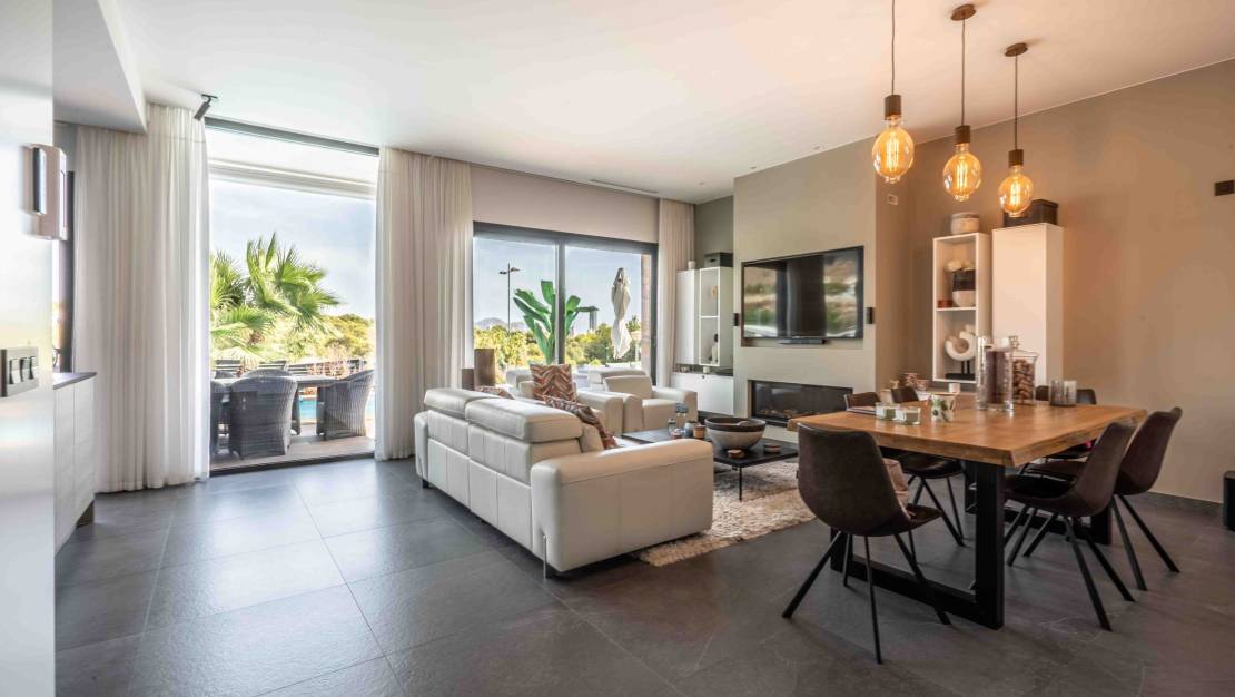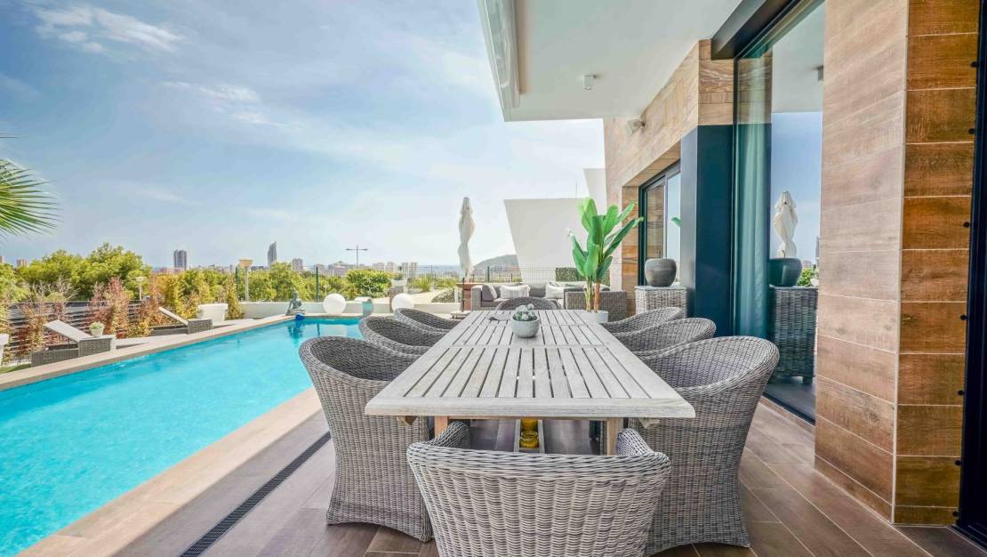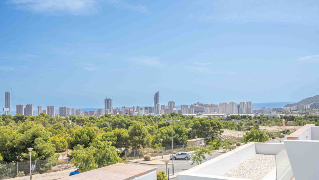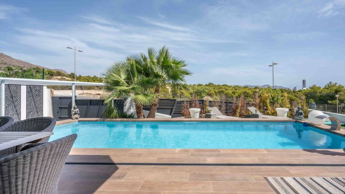 Este precioso chalet está situado en una bonita y moderna zona residencial a 10 minutos del centro de Benidorm. A 5 minutos hay un centro comercial con varios supermercados grandes, a 10 minutos se puede llegar a todos los demás servicios, como hospital, polideportivo, golf, colegios, playa, etc. Está situada en una parcela llana y rodeada de un bonito jardín. El chalet consta de un amplio salón-comedor con cocina abierta, un lavadero, un aseo y 2 amplios dormitorios dobles, cada uno con baño en suite. Desde la cocina y el salón puedes acceder a la terraza junto a la piscina a través de las grandes ventanas correderas. La terraza está orientada al sureste, por lo que puedes disfrutar del sol aquí todo el día; también hay un toldo para dar sombra. También hay una gran terraza en la azotea con vistas al horizonte de Benidorm y al azulado mar Mediterráneo. El chalet se construyó en 2019, pero en los últimos años se ha instalado una cocina de alta calidad completamente nueva, también se han actualizado los 2 baños y a ambos se les ha dotado de duchas sin mampara. Además, esta propiedad tiene extras, como elementos decorativos colocados contra la pared exterior que proporcionan iluminación ambiental por la noche, también hay un cenador, una ducha exterior, una barbacoa y una pérgola. Tanto las cortinas como los muebles están incluidos en el precio.