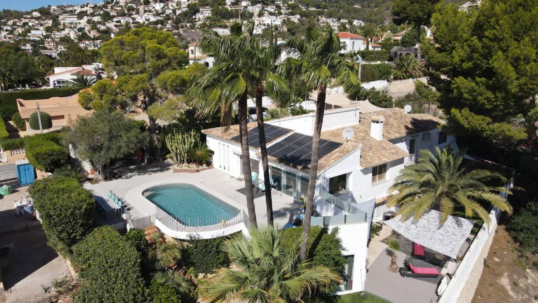 Villa de lujo reformada en el campo de golf de San Jaime, cerca de Moraira. Esta villa recientemente renovada se encuentra en la pintoresca primera línea del famoso campo de golf de San Jaime, Benissa. Con cinco dormitorios y tres baños, es una casa familiar ideal. En la planta baja la villa se abre a un amplio y luminoso salón - comedor con grandes puertas que se abren a una piscina de 9 x 4,5 my una gran terraza con vistas al mar y al Peñón de Ifach. En esta terraza encontramos también una acogedora cocina de verano. La moderna cocina adyacente al salón está equipada con electrodomésticos y acabados de calidad. La primera planta está dedicada a la relajación y la privacidad, donde también se encuentra el dormitorio principal. Aquí encontrará un aseo de invitados y un baño generosamente grande con ducha y bañera que se comparte con el dormitorio doble. Ambos dormitorios tienen puertas de terraza. La villa tiene paneles solares con un sistema de almacenamiento de batería. Además encontramos aire acondicionado, calefacción por suelo radiante, doble acristalamiento y un sistema de riego en el jardín. La zona exterior se complementa con una barbacoa y una amplia zona de aparcamiento junto con una acogedora casa de invitados. Todo está rodeado por un hermoso y cuidado jardín mediterráneo. El sótano ofrece varios trasteros. Allí también se encuentra el apartamento con su cocina abierta al salón y dos habitaciones individuales, que comparten un baño.