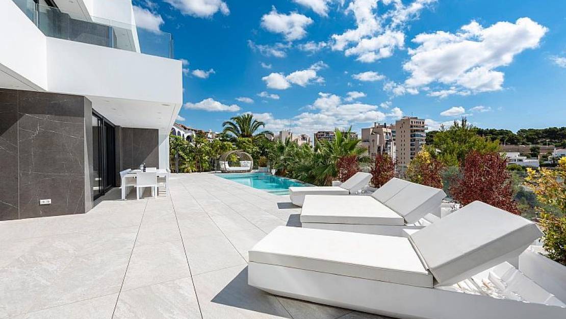 El exterior de la villa está diseñado para maximizar el disfrute del clima mediterráneo. Cuenta con un jardín privado que ofrece un espacio verde perfecto para relajarse o disfrutar de actividades al aire libre. La terraza es un lugar ideal para disfrutar de comidas al aire libre o simplemente contemplar las vistas. Además, la propiedad incluye un solárium, perfecto para tomar el sol en privacidad. La piscina privada es un verdadero oasis, ofreciendo un lugar refrescante para nadar y relajarse durante los cálidos días de verano.