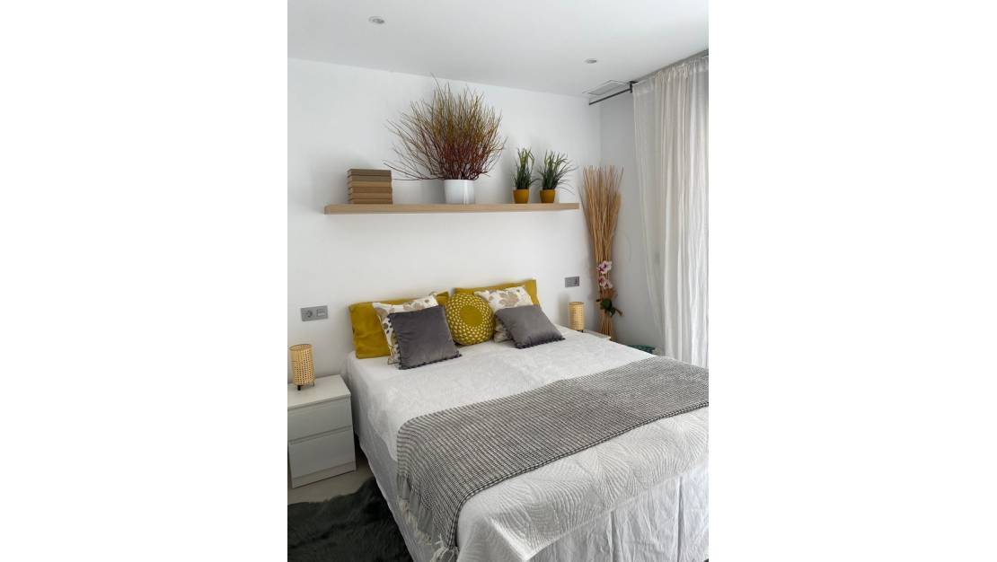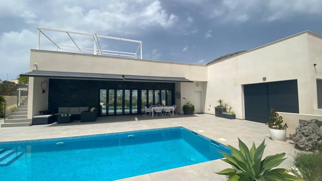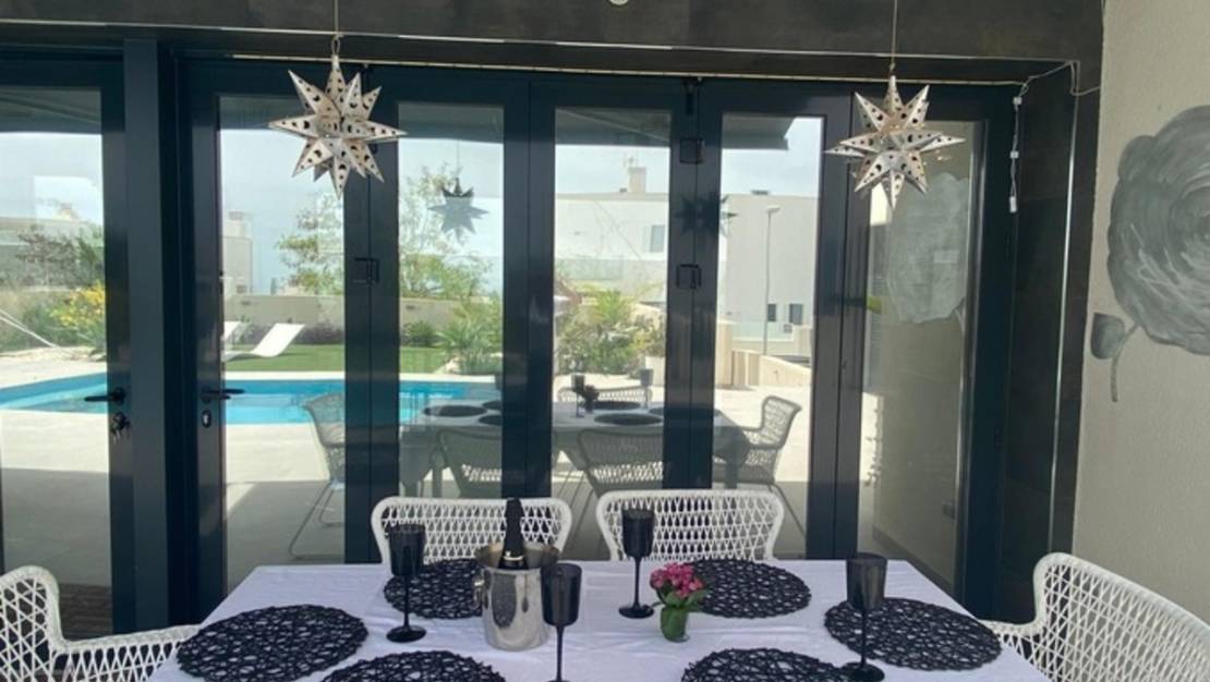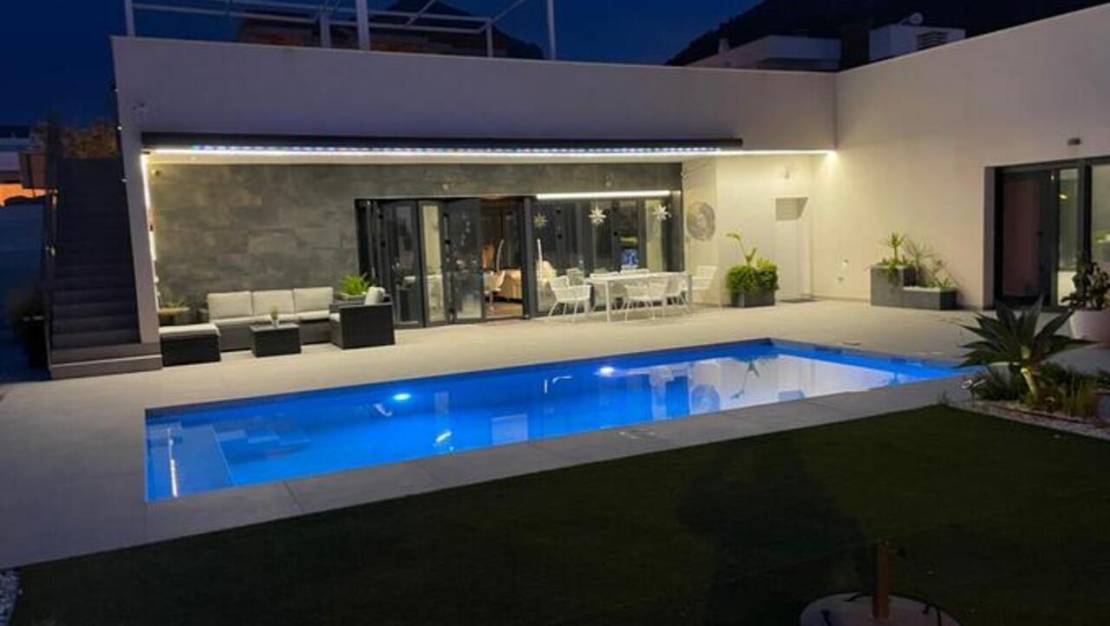 Villa moderna de 3 dormitorios con apartamento independiente de 2 dormitorios, vistas al mar y piscina privada – Construida en 2022. Nos complace presentar esta impresionante villa moderna independiente, distribuida en dos plantas, con un diseño luminoso y contemporáneo. La propiedad cuenta con una vivienda principal de 3 dormitorios y un apartamento independiente de 2 dormitorios, construido en 2022. Ubicada en una tranquila y cotizada zona residencial, ofrece fácil acceso a tiendas, restaurantes, playas y senderos naturales, combinando privacidad, comodidad y conveniencia. Características principales: Distribuida en dos plantas con alojamiento independiente para invitados; piscina privada de 30 m²; jardín con un hermoso diseño paisajístico y amplias terrazas; vistas panorámicas al mar y a la montaña; amplio solárium de 121 m² con vistas de 360° y pérgola; garaje y amplio aparcamiento en la entrada. Planta principal: El vestíbulo con armarios empotrados conduce a una luminosa sala de estar de planta abierta con una moderna cocina totalmente equipada y puertas plegables de cristal que se abren a la terraza delantera. El interior se inunda de luz natural gracias a sus ventanales de suelo a techo, creando una fluida conexión entre los espacios interiores y exteriores. Esta planta también incluye: una lujosa suite principal con puertas correderas que dan a la terraza de la piscina, vistas al mar y al jardín, vestidor y un amplio baño privado; un segundo dormitorio doble con armarios empotrados y acceso a la terraza; un tercer dormitorio, un segundo baño y una zona de lavandería. Apartamento de invitados (planta baja): La planta baja cuenta con un apartamento independiente de dos dormitorios con entrada privada, ideal para invitados, familiares o para alquilar. Incluye: Dos luminosos dormitorios con armarios empotrados y acceso a la terraza. Un salón-comedor de planta abierta con cocina integrada. Terraza privada y amplio garaje. Espacios exteriores: La villa ofrece amplias terrazas que rodean la propiedad, una zona de barbacoa con tomas de agua y electricidad (ideal para una cocina exterior), un comedor y salón cubiertos, además de un aseo independiente y trastero. El solárium de 121 m² en la azotea abarca toda la superficie de la vivienda y ofrece espectaculares vistas panorámicas de 360°, incluyendo el mar Mediterráneo, el Peñón de Calpe, las colinas de Altea y las sierras de Bernia y Aitana. Con tomas de agua y electricidad, es perfecto para comer al aire libre, recibir invitados o relajarse. Características adicionales: Cocina moderna totalmente equipada con electrodomésticos. Acabados de alta calidad en toda la vivienda. Baños completamente alicatados. Aire acondicionado centralizado. Armarios empotrados. Ubicación: Situada en una tranquila zona residencial, pero cerca de pueblos, colegios noruegos y británicos, campos de golf y el centro deportivo La Nucía, esta villa goza de una ubicación ideal. Las localidades costeras de Albir, Altea y Benidorm se encuentran a poca distancia en coche, y el aeropuerto de Alicante está a unos 30 minutos. Resumen: Esta moderna villa de 5 dormitorios, distribuida en dos plantas, ofrece una vivienda versátil con un apartamento independiente para invitados, una gran piscina e impresionantes vistas al mar. Perfecta como residencia familiar de lujo o refugio vacacional, combina un diseño elegante, acabados de alta calidad y magníficos espacios exteriores en una de las ubicaciones más exclusivas de la Costa Blanca. Se recomienda concertar una visita cuanto antes.