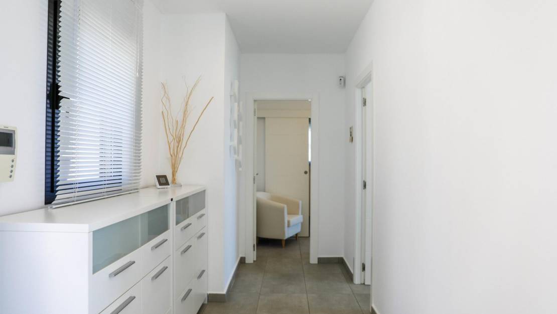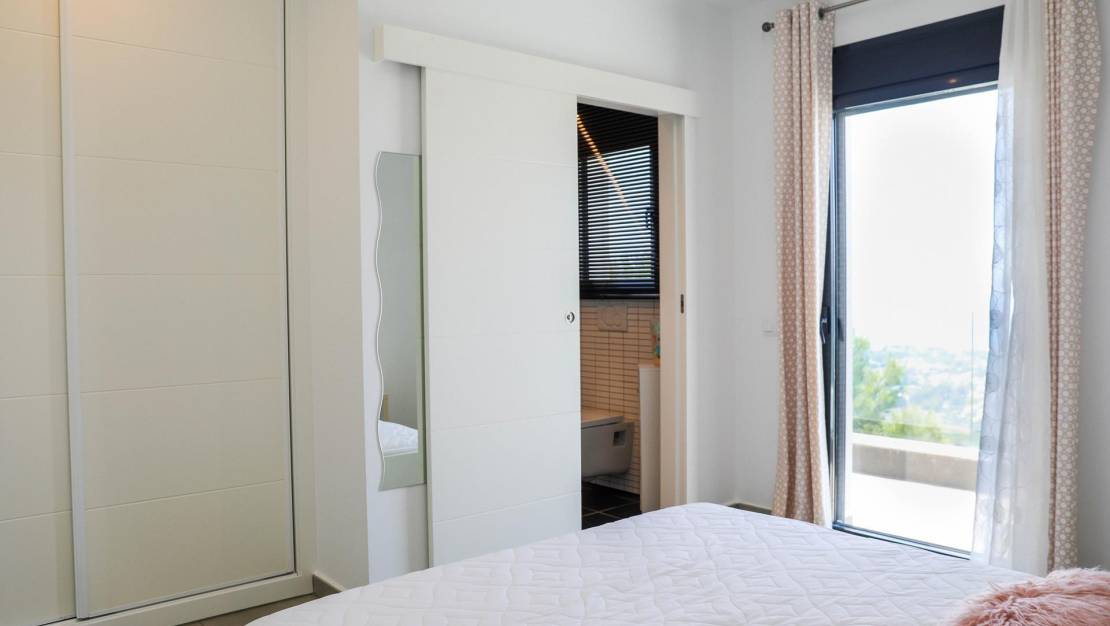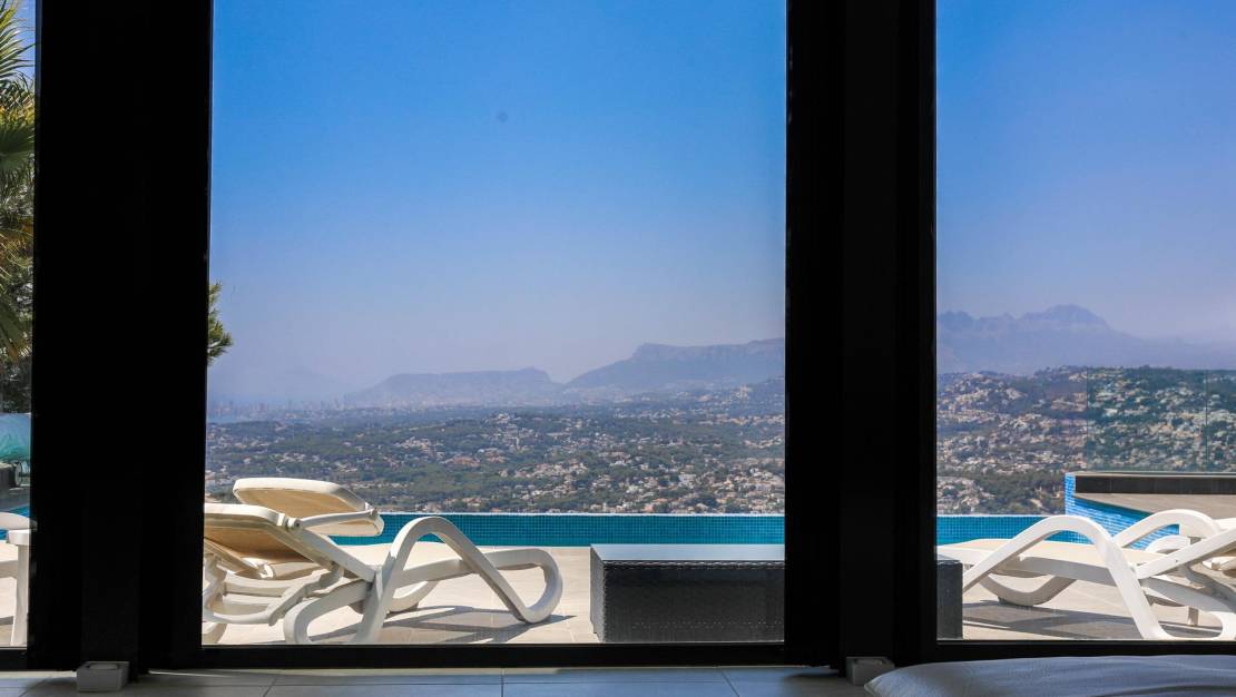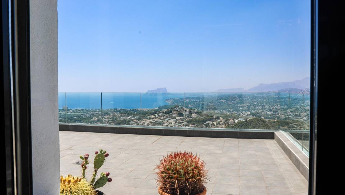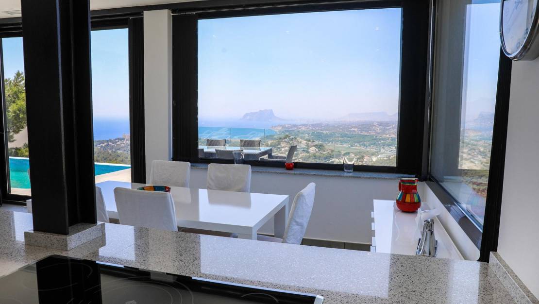 Villa de estilo moderno con impresionantes vistas al mar en la zona residencial Kalmias de la urbanización Cumbre del Sol ubicada entre Jávea y Moraira. La dispone de una superficie total construida de 430 M2 (200m2 de vivienda principal, 90 M2 apartamento de invitados y 140 M2 de terrazas) todo ello construido en una parcela de 1025 M2.  En total disponemos de 5 dormitorios dobles todos con su cuarto de baño privado. Así mismo la villa está equipada con calefacción por suelo radiante y aire acondicionado en toda la vivienda. La villa esta construido en varios niveles. Accedemos con el coche por una amplia y cómoda rampa de acceso accediendo a la zona de aparcamiento con una zona cubierta y con el acceso a la villa por la planta superior, en la planta superior disponemos de tres dormitorios dobles cada uno con su propio cuarto de baño y acceso directo a la terraza exterior con espectaculares vistas al mar y la montaña.  Por una escalera interior bajamos a la planta principal de la villa dónde tenemos el salón comedor y la cocina en concepto abierto además de el cuarto de lavado y un aseo de cortesía, tanto desde la zona de la cocina como del salón podemos acceder a la terraza exterior con la piscina privada.  Desde la terraza podemos acceder a la zona de la barbacoa que esta ubicado en un lateral de la villa.  Desde esta terraza podemos bordear la piscina y llegar al apartamento de invitados que también es accesible mediante una escalera exterior directamente desde la zona de aparcamiento de la villa.  El apartamento de invitados goza de muy bonitas vistas desde la terraza exterior y el salón. Mediante una escalera interior subimos media planta para acceder a los dos dormitorios dobles y los dos cuartos de baño. La zona residencial Kalmias es una promoción de villas que consta de 189 parcelas de 750 a 1200M2 ubicada en la urbanización cumbre del sol en Benitachell (alicante). Casi todas las parcelas disfrutan de hermosas vistas al mar, al valle de Moraira con Calpe al fondo y las montañas con la sierra de bernia al fondo, la orientación de las parcelas puede ser Sur y Suroeste. Residencial Kalmias se ubica en la urbanización Cumbre del sol en la entrada sur lindando con la zona residencial Jazmines y Lirios. Distancias a servicios: De 1 a 3 Km se encuentra el Dreamsea Mediterranean camp con bar y restaurante y el acceso a la playa Morach, la cala de los tiestos y la cala Llebeig, La escuela internacional Lady Elisabeth, el supermercado Mercadona y la hípica. De 4 a 5 Km; el centro comercial Adelfas con el supermercado Pepe la sal, peluquería, agencia de servicios de mantenimiento y alquileres, bar cafetería, el restaurante la cumbre, la farmacia, El centro deportivo con pádel, tenis, bar, el supermercado Mas y Mas y el centro urbano de Benitachell De 6 a 7 Km; el centro urbano y la playa del Portet de Moraira y el campo de golf de Jávea. A 12 km se encuentra la playa del arenal de Jávea.