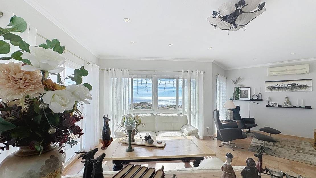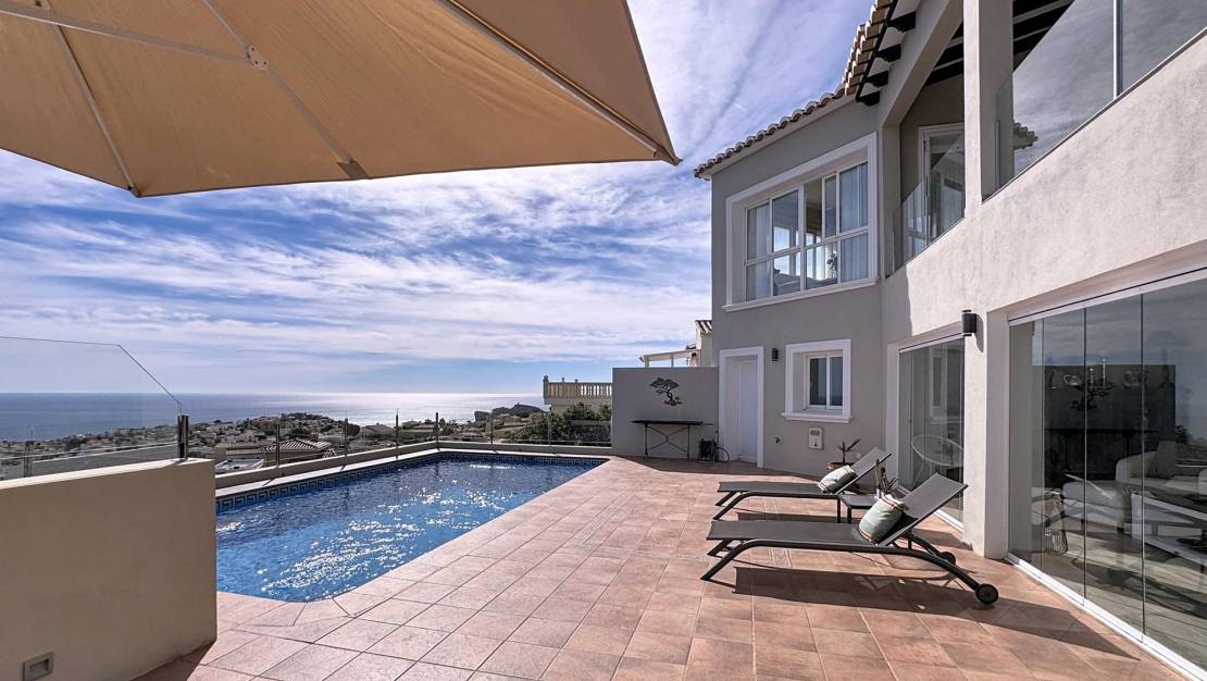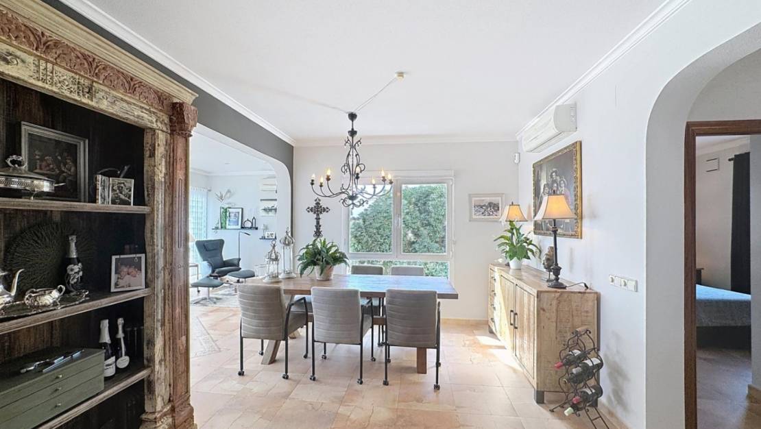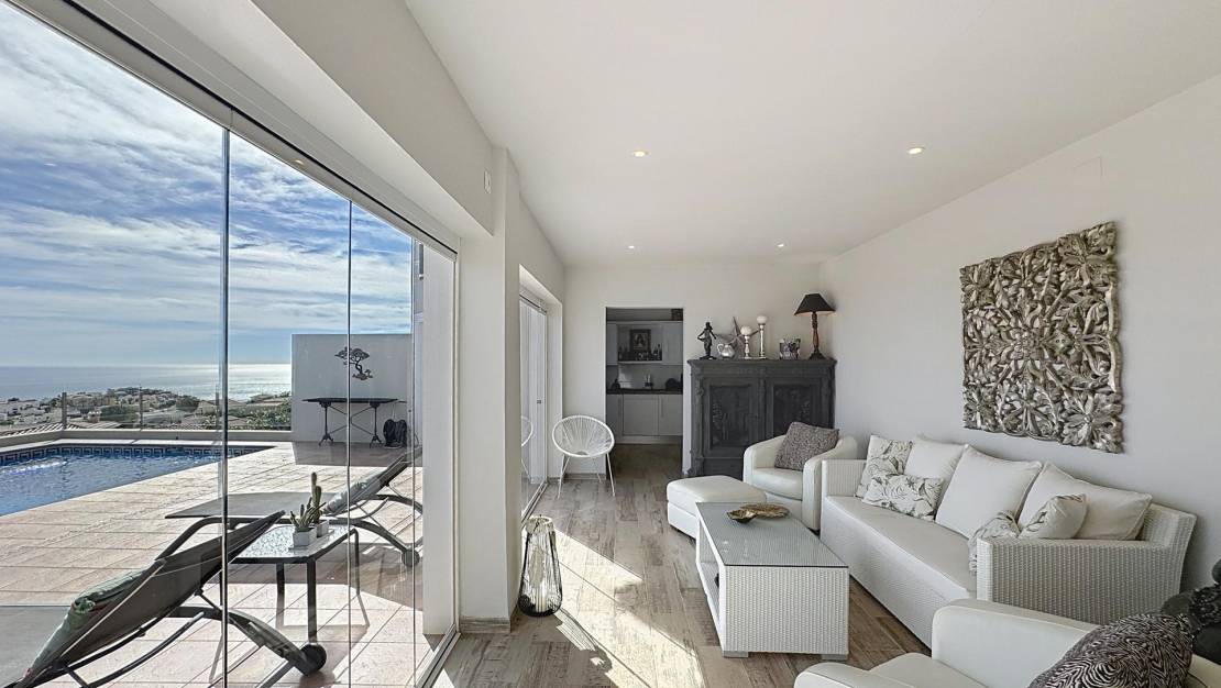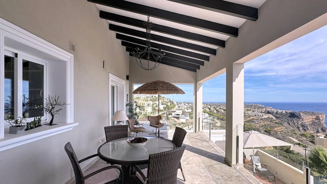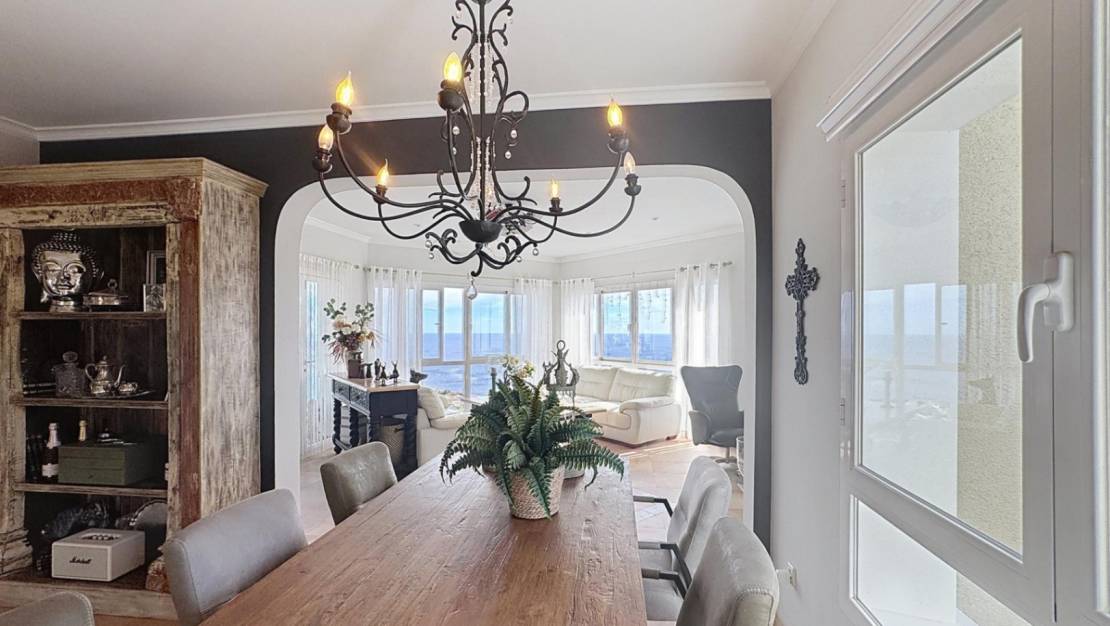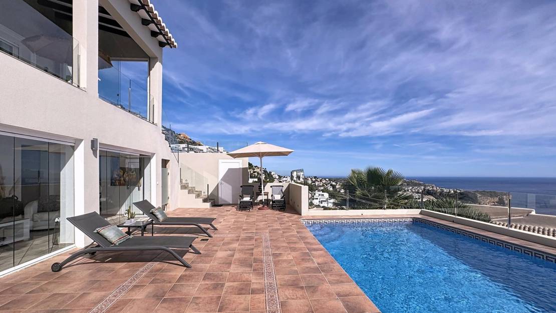 Espectacular villa mediterránea con vistas panorámicas al mar en Cumbre del SolUna vivienda única con encanto mediterráneoEsta exclusiva villa de estilo mediterráneo se alza imponente sobre una parcela de 803 m² en la zona residencial Lirios, dentro de la prestigiosa urbanización Cumbre del Sol, en el municipio de Benitachell, entre Jávea y Moraira. Desde su posición elevada, ofrece unas vistas panorámicas impresionantes al mar, al Cabo de la Nao, a la isla de Ibiza en el horizonte y a la Torre Vigía del Portet de Moraira. La propiedad cuenta con una superficie total construida de aproximadamente 340 m², distribuidos en dos plantas, que combinan elegancia, confort y un diseño orientado a disfrutar del entorno natural. Distribución interior pensada para el confortPlanta principalEn la planta principal encontramos una distribución amplia y funcional: Dos dormitorios dobles con armarios empotrados, uno de ellos con vistas al mar.Cuarto de baño completo y lavadero con ventana.Dormitorio principal con baño en suite, vestidor y acceso directo a la terraza.Cocina americana abierta al comedor, con salida directa a la terraza cubierta con vistas al mar.Salón con chimenea, dividido en dos ambientes: una zona de televisión y otra concebida como mirador panorámico desde el que se contemplan el Cabo de la Nao, Ibiza y la Torre del Portet.Planta bajaDesde una escalera exterior, se accede a la planta baja, donde se encuentra la terraza de la piscina y un acogedor espacio de invitados: Salón abierto a la terraza.Cocina de verano, ideal para disfrutar junto a la piscina.Dos dormitorios dobles y un amplio baño completo.Sala técnica y trastero para mayor funcionalidad.Detalles que marcan la diferenciaEsta villa destaca por su impecable estado de conservación y por estar equipada con: Calefacción por suelo radiante.Aire acondicionado por splits en todas las estancias.Jardín mediterráneo con distintas zonas de relax, entre ellas un chill-out con barbacoa.Cada rincón de la casa está pensado para disfrutar de las impresionantes vistas al mar y del estilo de vida mediterráneo, en un ambiente tranquilo y exclusivo. Zona residencial Lirios, Cumbre del SolUbicada en el corazón de la Costa Blanca Norte, la Zona Residencial Lirios es una de las áreas más consolidadas y demandadas de la urbanización Cumbre del Sol. Con 235 parcelas de entre 750 y 1.200 m², esta zona destaca por su privacidad, tranquilidad y vistas panorámicas al mar Mediterráneo. Servicios y entornoA pocos minutos encontrará todo lo necesario para el día a día: Playas y calas: Cala Moraig, Cala de los Tiestos y Cala Llebeig.Centro Comercial Adelfas con supermercado Pepe La Sal, peluquería, farmacia y restaurantes.Restaurante La Cumbre, reconocido por su excelente cocina.Centro deportivo con pistas de pádel y tenis.Escuela Internacional Lady Elizabeth, una de las más prestigiosas de la Costa Blanca.Supermercados Mercadona y Mas y Mas y el centro urbano de Benitachell a solo unos minutos.La orientación este-sureste de la zona garantiza amaneceres espectaculares y una luminosidad natural excepcional durante todo el año, convirtiéndola en un entorno ideal para residir o disfrutar de vacaciones inolvidables. Viva el estilo de vida mediterráneo que mereceSi busca una villa con encanto, vistas infinitas y máxima privacidad, esta propiedad en Residencial Lirios, Cumbre del Sol, es una oportunidad única. Contáctenos hoy mismo para concertar una visita y descubra por qué esta villa es mucho más que una casa: es un lugar donde vivir el auténtico espíritu del Mediterráneo. Sobre la Urbanización Cumbre del SolCumbre del Sol es una de las urbanizaciones más exclusivas de la Costa Blanca Norte, situada en el municipio de Benitachell, entre Jávea y Moraira. Su privilegiada ubicación sobre los acantilados ofrece algunas de las vistas más espectaculares del Mediterráneo, junto a parajes naturales protegidos, calas paradisíacas y una amplia oferta de servicios y ocio de alta calidad. Con su clima templado, su tranquilidad y su comunidad internacional, es el lugar perfecto para quienes buscan lujo, naturaleza y bienestar durante todo el año.