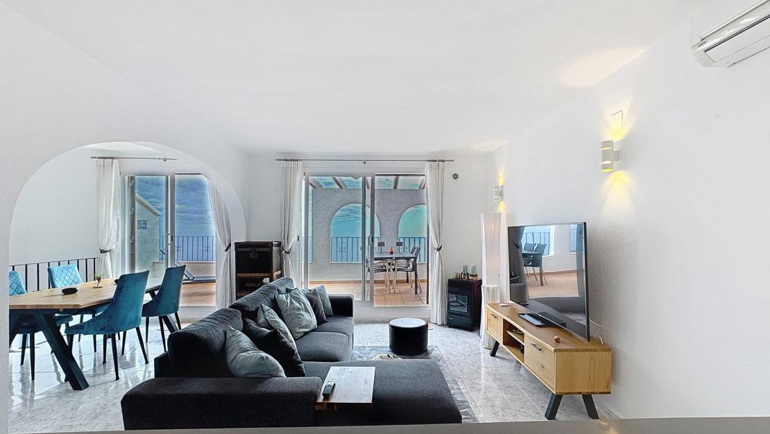 Apartamento Dúplex con Vistas Panorámicas al Mediterráneo en Pueblo Panorama – Cumbre del SolUna vivienda que enamora desde cada rincónEste apartamento dúplex en Pueblo Panorama (Vistamar) es una auténtica joya en la urbanización Cumbre del Sol, entre Jávea y Moraira, en el municipio de Benitachell (Alicante). Desde su terraza, se abren ante ti vistas panorámicas impresionantes que abarcan desde el Cabo de la Nao en Jávea, pasando por la isla de Ibiza en el horizonte, hasta el infinito azul del mar Mediterráneo. Distribución funcional y espacios luminososCon una superficie total construida de 139 m², esta propiedad se distribuye en 110 m² de vivienda, 20 m² de terraza y 9 m² de zonas comunes. Planta principalAl acceder a la vivienda, encontramos un amplio dormitorio doble con armarios empotrados, un baño completo, y una cocina americana reformada y completamente equipada. El salón comedor, con aire acondicionado frío/calor, conecta directamente con la terraza, ofreciendo un espacio perfecto para relajarse o compartir momentos con familia y amigos. Además, dispone de tres armarios trastero junto a la entrada, proporcionando un valioso espacio extra de almacenamiento. Desde el salón, el comedor y la cocina, disfrutarás en todo momento de espectaculares vistas al mar. Planta bajaMediante una cómoda escalera interior, accedemos a la planta inferior, donde se encuentran dos dormitorios dobles con armarios empotrados y vistas al mar, además de un amplio cuarto de baño y otro armario trastero adicional. El apartamento se encuentra en perfecto estado de conservación, listo para entrar a vivir y disfrutar de su entorno único. Un entorno que lo tiene todoPueblo Panorama (Vistamar) es conocido por su privilegiada ubicación dentro de Cumbre del Sol, combinando tranquilidad, naturaleza y unas vistas incomparables. La urbanización dispone de 8 piscinas comunitarias distribuidas en 4 zonas, cada una con amplias terrazas donde disfrutar del sol y las vistas al Mediterráneo. Su entorno ofrece todos los servicios necesarios para una vida cómoda y de calidad: Colegio Internacional Lady Elizabeth School a solo 1 km.Playas y calas como Moraig, Tiestos y Llebeig a 2–3 km.Centro Comercial Adelfas, con supermercado, restaurante La Cumbre, farmacia y peluquería a menos de 3 km.Centros deportivos y hípica, con pistas de pádel y tenis.A pocos minutos de los encantadores centros urbanos de Moraira y Jávea, con su oferta gastronómica, náutica y cultural.Un estilo de vida mediterráneo con vistas infinitasVivir en este dúplex de Pueblo Panorama es disfrutar cada día de la luz del Mediterráneo, el silencio del entorno natural y la comodidad de una vivienda bien diseñada. Es ideal tanto como residencia habitual como para quienes buscan una segunda vivienda con encanto en la Costa Blanca Norte. Resumen de la Zona Residencial: Pueblo PanoramaPueblo Panorama, dentro de la zona Dalias de la urbanización Cumbre del Sol, se caracteriza por su ubicación elevada y vistas panorámicas al mar Mediterráneo. Sus apartamentos orientados al sureste disfrutan del sol durante todo el día y de un entorno natural incomparable. Cuenta con 8 piscinas comunitarias, amplias terrazas y jardines, lo que lo convierte en uno de los complejos más valorados por quienes buscan una vida tranquila, rodeada de naturaleza y con servicios de primera calidad. Su proximidad a las playas, el colegio internacional, los centros comerciales y los pueblos costeros de Jávea y Moraira hacen de Pueblo Panorama una elección perfecta para disfrutar del estilo de vida mediterráneo más auténtico. ¿Te gustaría conocer este apartamento en persona?Ponte en contacto con nosotros hoy mismo para concertar una visita y descubrir por ti mismo las vistas, la luz y la tranquilidad que hacen de esta vivienda un lugar realmente especial.