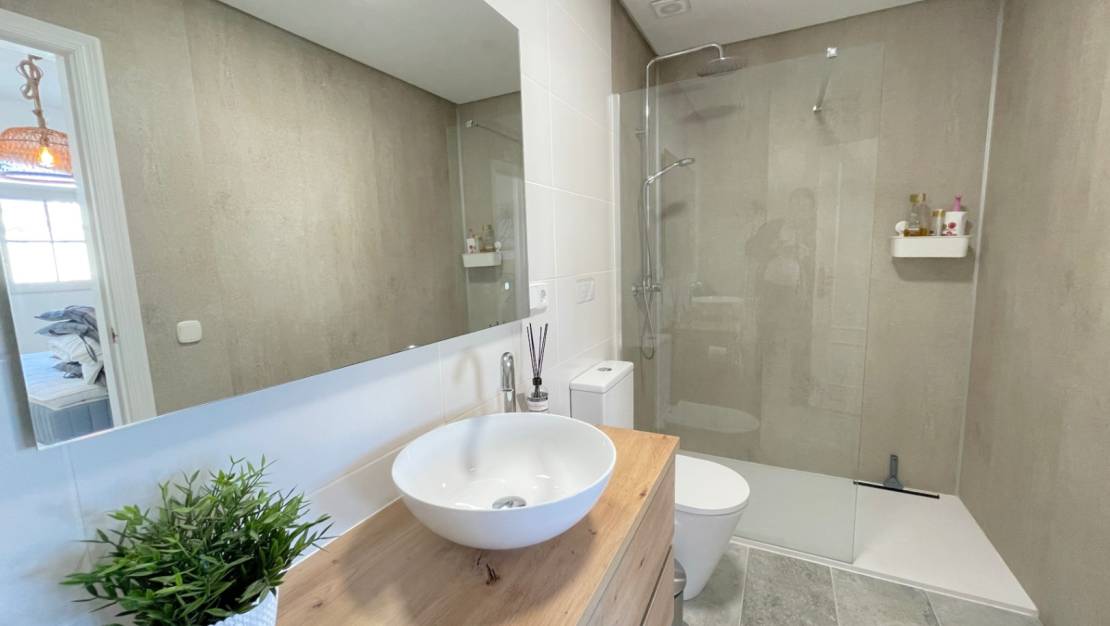 El apartamento ofrece dos dormitorios bien distribuidos con armarios empotrados, incluyendo un dormitorio principal que cuenta con su propio cuarto de baño moderno en suite. Un segundo cuarto de baño moderno para invitados aporta un extra de confort y funcionalidad.