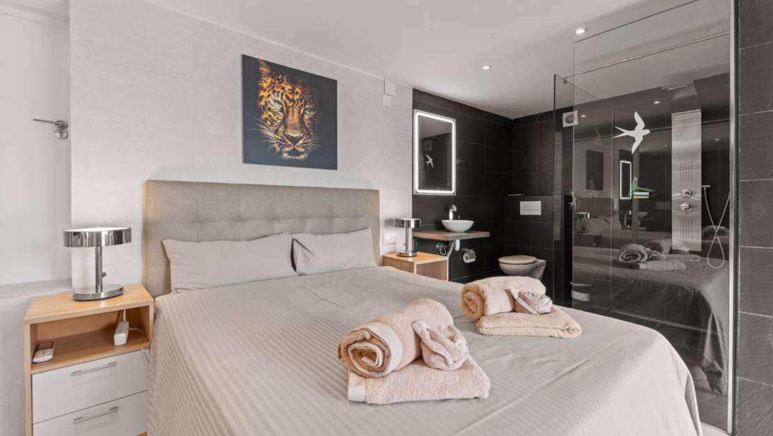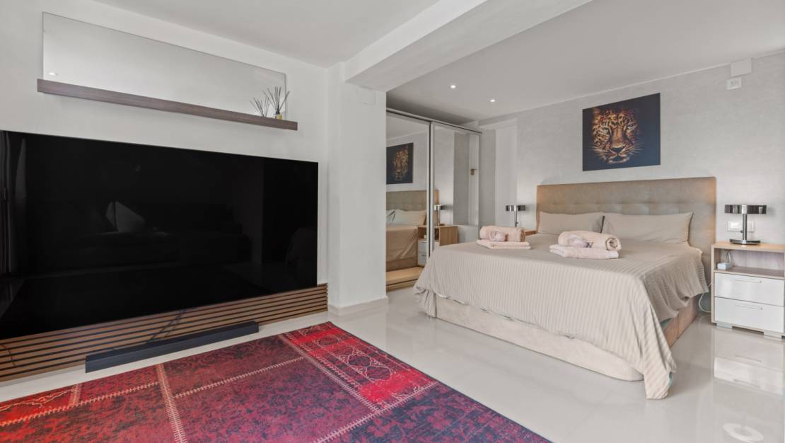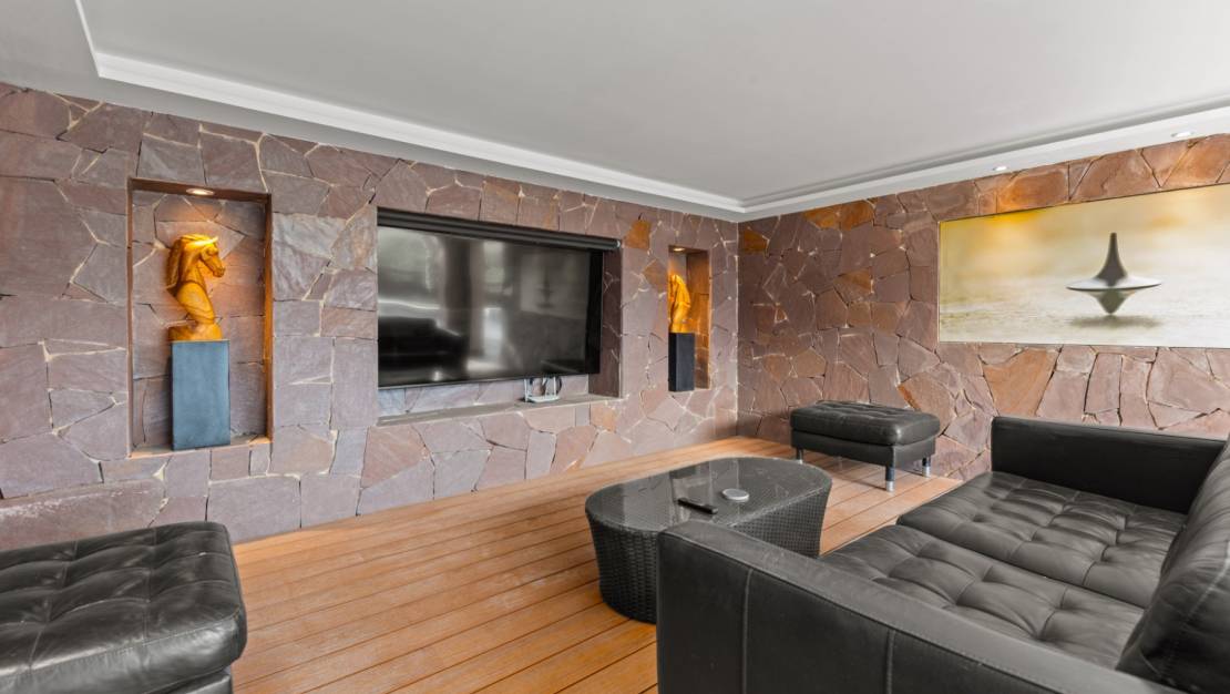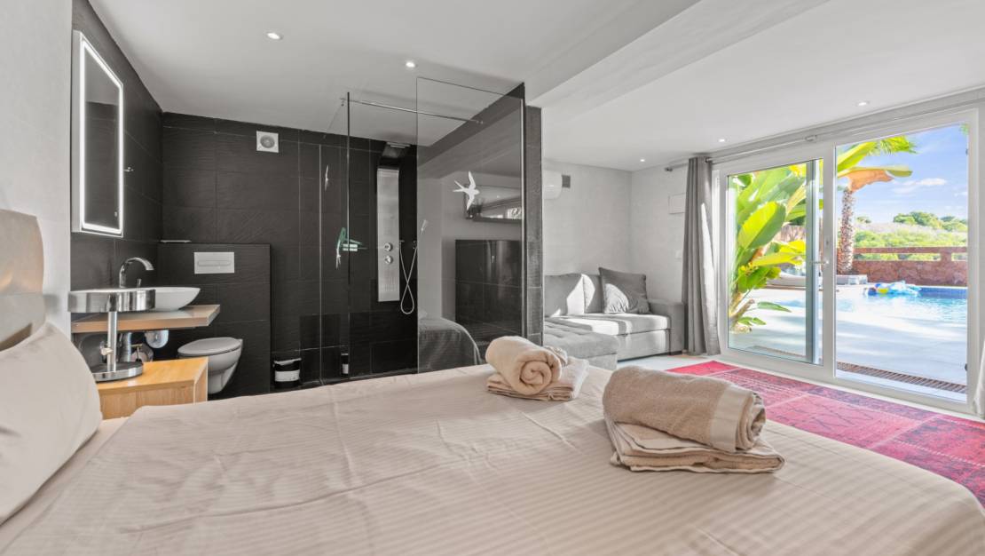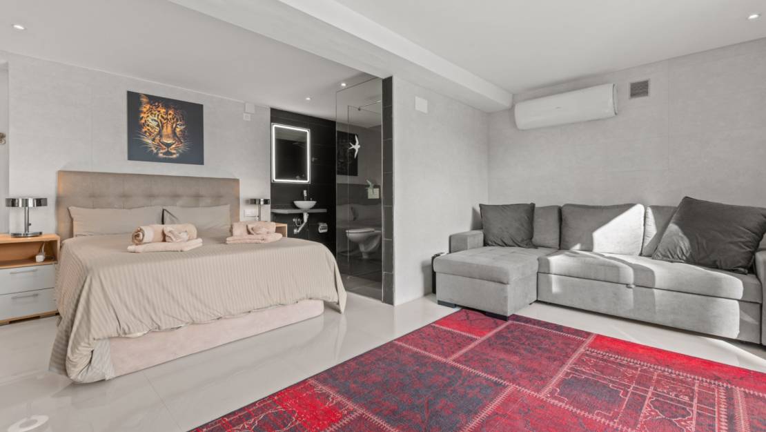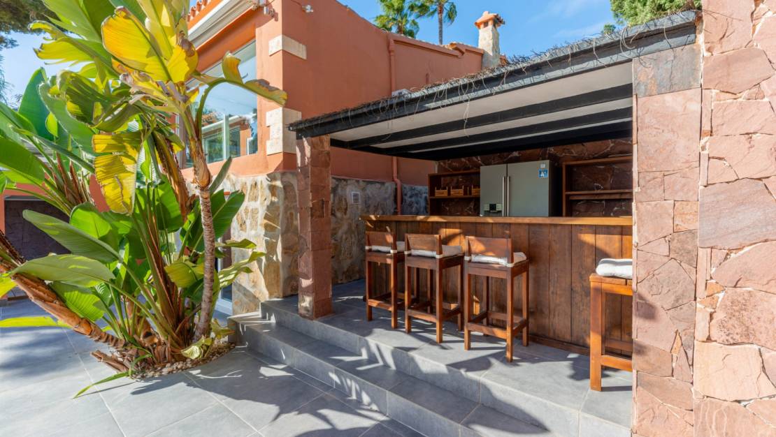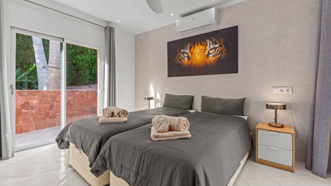 La villa le da la bienvenida a través de una soleada terraza en la planta principal. Se accede a un luminoso salón con grandes ventanales que enmarcan maravillosamente las vistas de Moraira y el verde jardín. La estufa de leña empotrada y el rincón de trabajo, cuidadosamente situado, crean un espacio cálido y práctico. La cocina independiente está totalmente equipada y cuenta con todas las comodidades deseables. Además, en esta planta también encontramos dos cómodos dormitorios con armarios empotrados y dos modernos cuartos de baño con ducha. Desde el salón se accede directamente a una amplia terraza equipada con un toldo eléctrico. Unos escalones más abajo hay una segunda terraza, un agradable lugar a la sombra con espacio para el descanso y el ocio, rodeado de vegetación mediterránea. En el nivel inferior, esta villa cuenta con una suite de invitados totalmente independiente. Tiene una entrada privada desde la terraza de la piscina, una zona de estar propia, dormitorio y cuarto de baño. Ideal cuando se desea recibir invitados sin renunciar a la tranquilidad y la privacidad. En el jardín le espera la moderna piscina rectangular, recientemente renovada, que constituye el corazón del jardín. Aquí encontrará varias zonas de descanso, una ducha exterior y una amplia zona de estar con televisión: perfecta para largas veladas al aire libre. Al otro lado del jardín hay un acogedor bar cubierto, completamente equipado para recibir cómodamente a amigos y familiares.