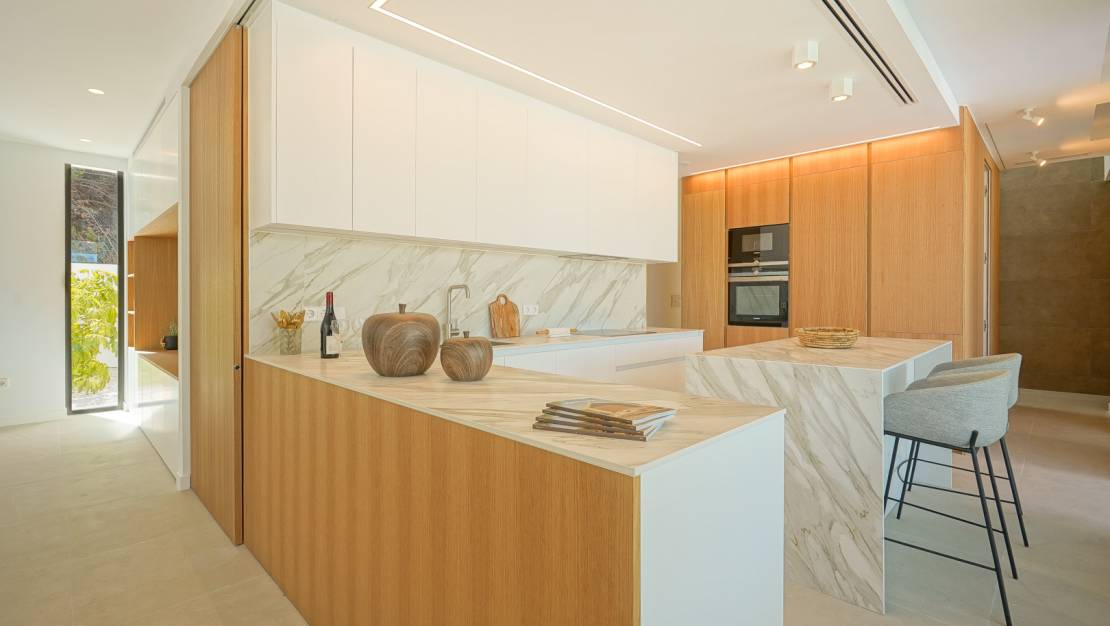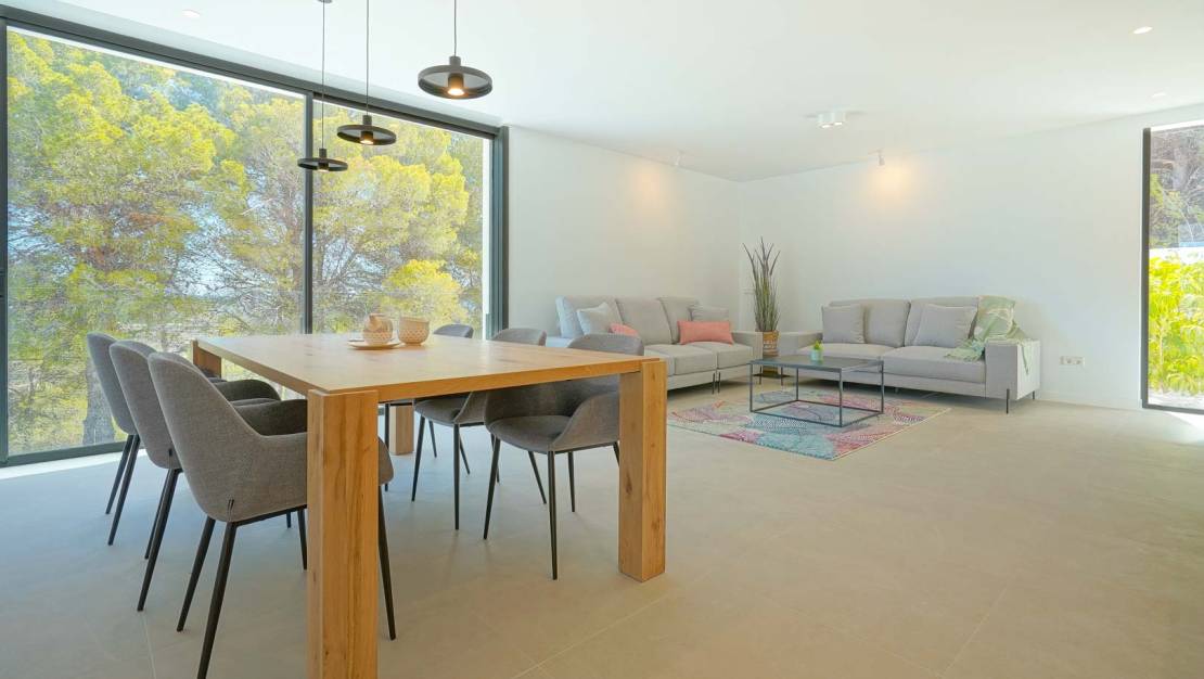 Esta hermosa villa está situada en una zona tranquila a menos de 10 minutos de la playa y del centro de Moraira. La villa está rodeada por una zona boscosa y se distribuye en tres plantas. La primera planta consta de un amplio salón-comedor, una cocina americana, un dormitorio doble con baño en suite y un aseo. A través de ventanas correderas se accede a una gran terraza parcialmente cubierta junto a la piscina. En la segunda planta se encuentra la suite principal con un gran vestidor y baño en suite y dos dormitorios dobles que comparten un baño. Todos los dormitorios de esta planta tienen acceso a una gran terraza con pérgola. La planta baja consta de un garaje con espacio para dos coches, el camino de entrada en frente del garaje tiene espacio para aparcar dos coches más. Además, en la planta baja hay un lavadero muy grande, una sala de secado, un gimnasio, un trastero, una sala técnica y un baño exterior. La villa está rodeada de un jardín mediterráneo de bajo mantenimiento y tiene riego automático. La villa también dispone de aire acondicionado y calefacción por suelo radiante. La villa está lista para entrar y se vende con los muebles incluidos en el precio.