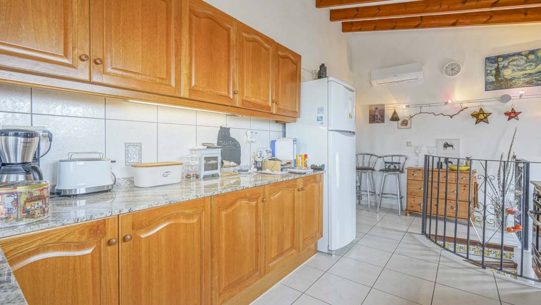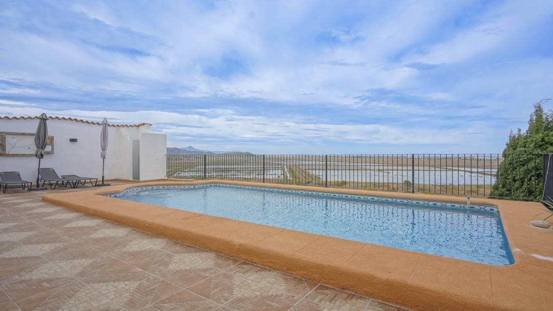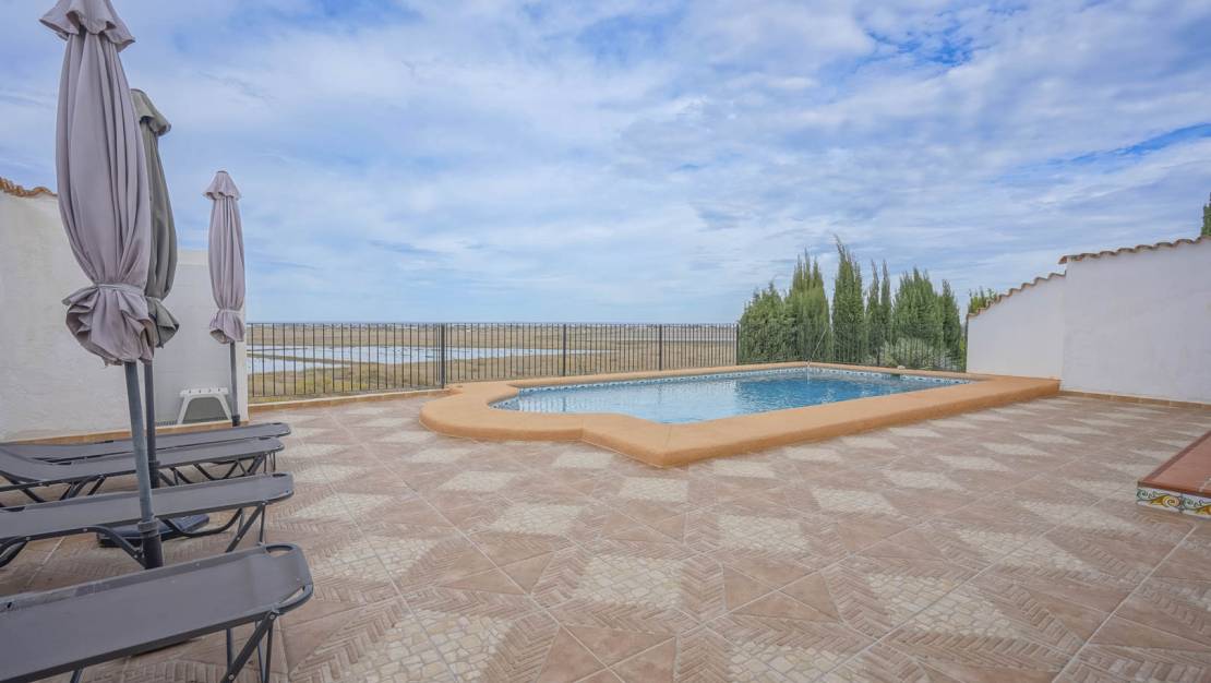 Esta gran villa tradicional española se encuentra en Monte Pego y ofrece impresionantes vistas de 180º sin obstáculos. Las vistas se extienden desde a Pego a través de la reserva natural «Marjal de Pego» y campos de arroz a las montañas al oeste y hasta la costa, con las ciudades costeras de Oliva al noroeste y Denia al este. La villa consta de dos plantas y tiene una casa de invitados independiente conectada a la casa principal. A través de un camino de entrada muy amplio de hasta 280 m2, rodeado de plantas y árboles, se llega a la villa y al garaje. Tanto la villa como el garaje están un escalón más elevados y el camino de entrada tiene cuatro desagües, por lo que nunca tendrá agua en su casa en caso de fuertes lluvias. Gracias al camino de entrada elevado, tiene el lujo de aparcar su coche justo delante de la puerta y entrar en su casa con un solo escalón. Una excepción en Monte Pego, donde a la mayoría de las casas sólo se puede acceder por escaleras. Usted entra en la propiedad en el primer piso donde se encuentra la casa principal. Esta consta de un salón con chimenea, un comedor con una mesa para 8 personas y una gran cocina americana renovada con nevera, lavavajillas, cocina y horno nuevos. También hay dos dormitorios dobles, un baño renovado y un aseo de invitados renovado. En el exterior hay una gran terraza cubierta de unos 20 m2 y un patio con barbacoa y cocina exterior con agua caliente y fría. También se ha instalado un toldo para dar sombra. Una escalera exterior conduce a la zona de la piscina, que es completamente privada y no tiene vistas a ninguna casa. La piscina de 4 x 8 m está rodeada por una gran terraza con espacio para varias tumbonas y una ducha exterior con agua caliente. También se puede disfrutar de unas vistas únicas desde la piscina. En esta planta hay otros dos dormitorios dobles, un cuarto de baño y una habitación extra. (A esta planta sólo se puede acceder desde el exterior). También hay un trastero de 18 m2 para el equipamiento de la piscina y el jardín. Adyacente está la terraza de la casa de invitados con una segunda ducha exterior también caliente/fría. La casa de invitados está conectada a la casa principal por un pasillo y consta de cocina y salón en la primera planta y un dormitorio doble, un baño muy espacioso diseñado por Luigi Colani y un aseo de invitados en la planta baja. El cuarto de baño dispone de calefacción eléctrica por suelo radiante. Existe la posibilidad de convertir el garaje de casi 30 m2 de la primera planta en una sala de estar, ampliando así la casa de invitados. La casa de invitados tiene una entrada privada además de la entrada por la casa principal. Todos los dormitorios y el salón tienen calefacción. Además, en los últimos años se han llevado a cabo varias reformas en la villa. Por ejemplo, toda la villa tiene doble acristalamiento y todas las ventanas y puertas se han renovado con marcos de ventanas de plástico con diseño de madera, se han instalado mosquiteras en todos los dormitorios y se ha colocado suelo nuevo tanto arriba como abajo, se ha instalado aire acondicionado en todos los dormitorios, salón y cocina y se ha renovado la instalación eléctrica. En el exterior, se han colocado casi 220 m2 de baldosas nuevas, incluyendo la terraza cubierta, el patio y la terraza de la piscina. La renovación ha mantenido el estilo castellano, que hace que la villa sea única. La villa está rodeada por un jardín de fácil mantenimiento con riego automático y tiene otra pequeña terraza orientada al sur. Debajo de la villa hay un sótano iluminado que da acceso a todas las tuberías que pasan por debajo de la casa. Todas las puertas y ventanas tienen rejas. Incluido en el precio están todos los muebles, incluyendo ropa de cama, vajilla, etc. Las dos parcelas parcialmente visibles a los pies de la casa están designadas «zona verde», lo que significa que no se permite construir en ellas. Un chalet de mucha calidad a buen precio con unas vistas impresionantes. ¡No lo dude más y solicite su visita! Planos del chalet a petición. Monte Pego es una urbanización con vistas únicas, rodeada de montañas que proporcionan un microclima. El acogedor pueblo de Pego está a 10 minutos en coche, pero también hay otros pueblos españoles cerca. La costa de Els Poblets está a unos 7 km y consiste en una extensa playa de arena con espacio para todos. A la turística ciudad costera de Denia se llega en 20 minutos. Monte Pego tiene una ubicación muy céntrica en relación con los aeropuertos cercanos de Valencia y Alicante. Para los amantes del deporte, hay una reserva natural justo enfrente de la urbanización con rutas de senderismo y ciclismo. También hay dos hermosos campos de golf a poca distancia, La Sella Golf y Oliva Nova Golf.