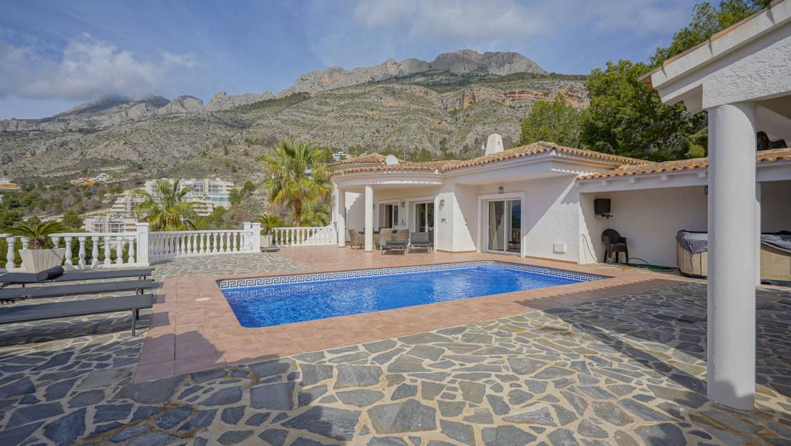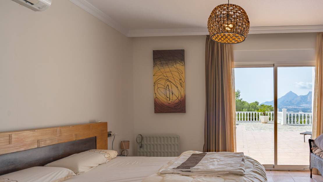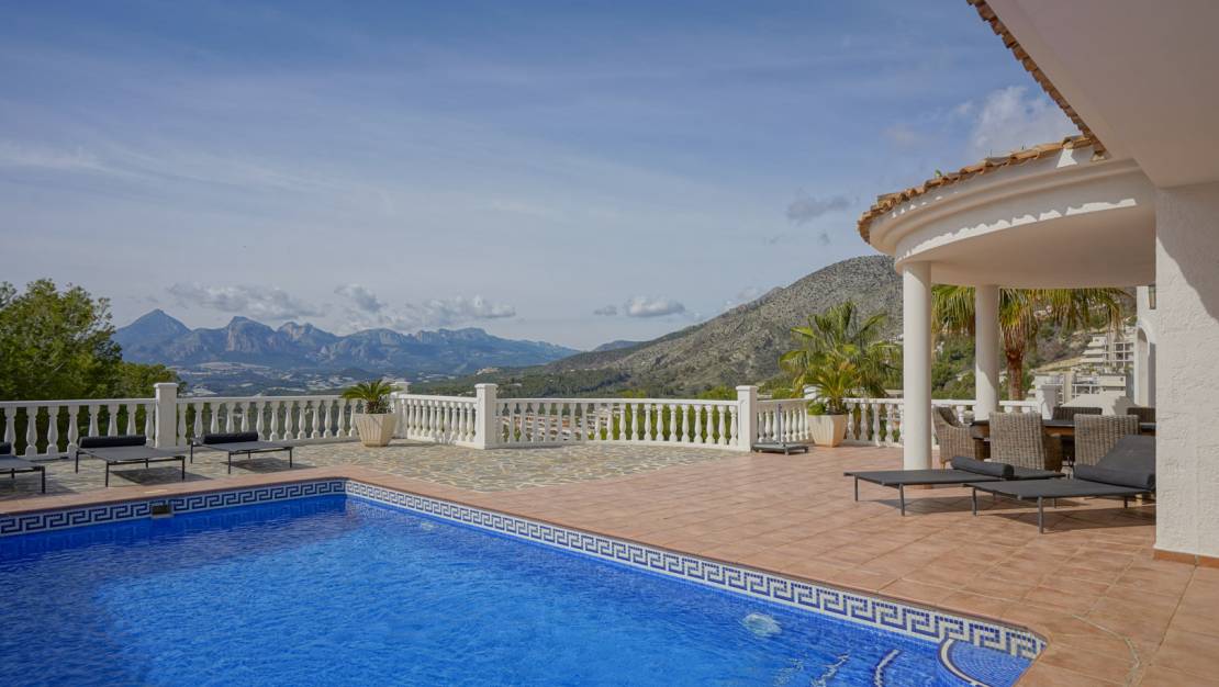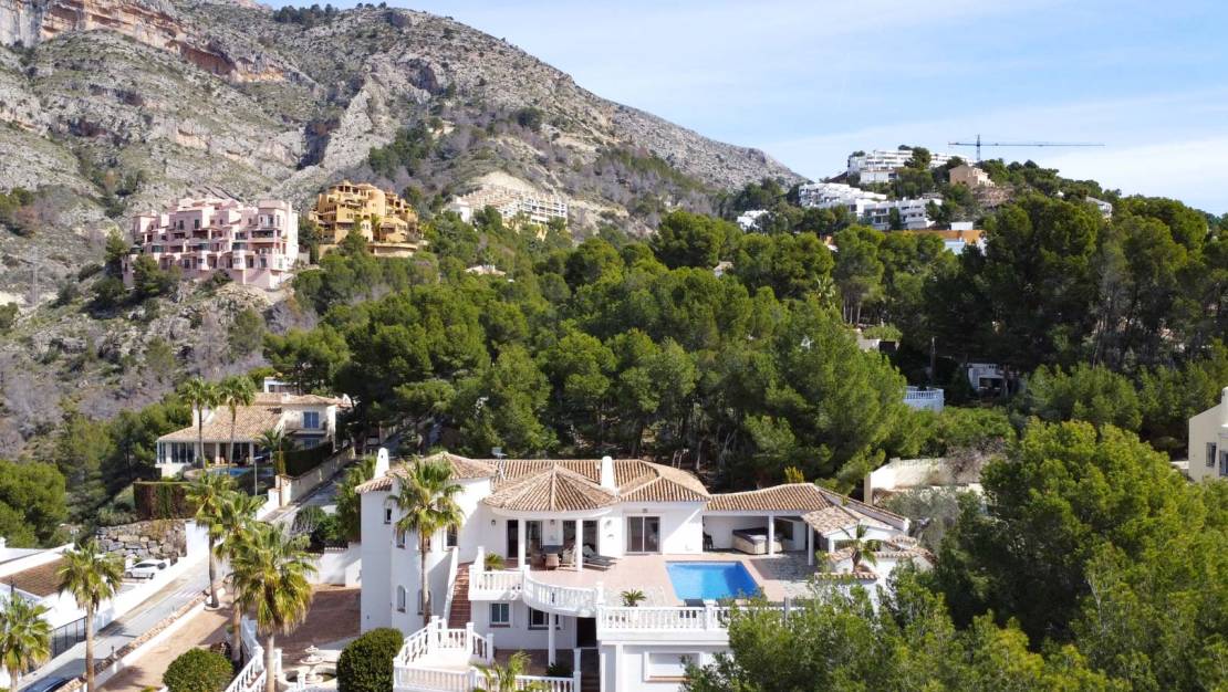 Esta hermosa villa mediterránea está situada en una de las prestigiosas urbanizaciones de Altea, a los pies del flanco sur de la majestuosa Sierra de Bernia. La villa ofrece impresionantes vistas de la cordillera cercana y el vasto paisaje montañoso. Las vistas incluyen montañas emblemáticas como el Puig Campana y la Sierra Aitana. La villa fue construida en 2004 y siempre ha estado muy bien cuidada. Gracias a una inteligente distribución, toda la residencia privada de 173 m2 se encuentra en una sola planta junto a la piscina. Una planta más abajo se encuentra una espaciosa casa de invitados independiente de 113 m2 y una habitación separada que se puede convertir en un estudio. La casa de invitados está conectada internamente con la planta superior, pero también tiene acceso privado. Una puerta automática da acceso a la propiedad con el camino de entrada de inmediato se divide en dos para darle la opción de aparcar en la entrada de la casa principal o en la entrada de la casa de huéspedes. Si aparca en la casa principal, unas escaleras le conducirán a la puerta principal. Se accede a un elegante vestíbulo con una espaciosa cocina totalmente equipada a la derecha. El pasillo desemboca en el salón-comedor, donde también hay un pequeño despacho. A través de un pasillo, donde hay un baño adicional, se llega al dormitorio principal con vestidor y baño en-suite. Desde todas las habitaciones (excepto los cuartos de baño) hay hermosas vistas al campo. Tanto desde el salón como desde el dormitorio se accede directamente a la terraza junto a la piscina a través de ventanas correderas. También hay una terraza cubierta en esta planta, una cocina exterior con bar y una ducha exterior. La casa de invitados consta de una cocina, un comedor desde donde también se puede disfrutar de las hermosas vistas de la Sierra de Bernia, un salón, un dormitorio con baño en suite y dos dormitorios que comparten un baño. Frente a la casa de invitados hay una gran habitación de unos 44 m2 con varias ventanas, ideal para transformarla en un dormitorio extra, gimnasio o un acogedor estudio. La casa de invitados y el estudio comparten una terraza privada. La villa dispone de aire acondicionado en todas las habitaciones, calefacción central por radiadores, persianas y armarios empotrados. También hay seguridad con varias cámaras y un sistema de alarma. La villa está rodeada por un jardín de bajo mantenimiento equipado con riego automático. También hay un garaje. Tanto la playa como el centro de Altea se encuentran a 10 minutos en coche. A ciudades más grandes como Calpe o Benidorm se puede llegar en 15 minutos. El aeropuerto de Alicante está a 50 minutos en coche. A poca distancia de la villa se encuentra el hermoso club de golf de Altea. Altea es un paraíso situado entre las montañas y el mar Mediterráneo. Sólo tiene que caminar a lo largo de sus más de 6 kilómetros de costa para descubrir la gran variedad de playas, como L'Olla, Solsida, Cap Negret, Albir, Cala del Mascarat y La Roda. Estas playas se caracterizan más por los guijarros que por la arena y algunas calas incluso se esconden entre grandes acantilados. También está el encantador casco antiguo. Con calles estrechas y empedradas, casas blancas llenas de flores de colores y rincones y miradores escondidos, es un lugar maravilloso para pasear. No lo dude más y venga ya a descubrir esta fantástica villa.