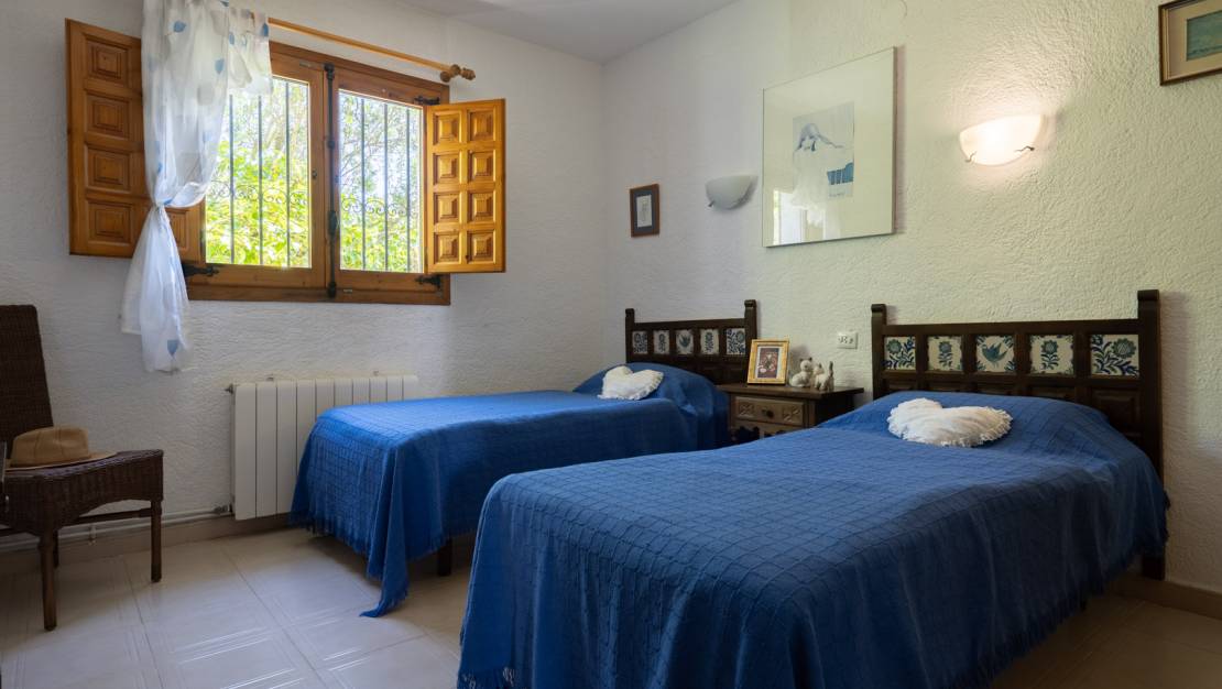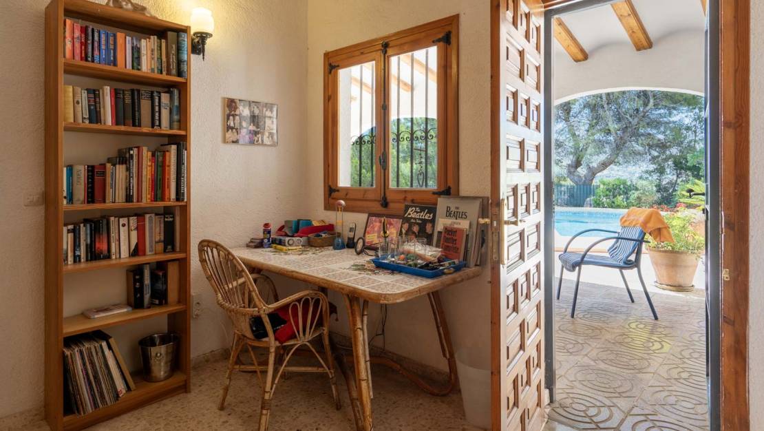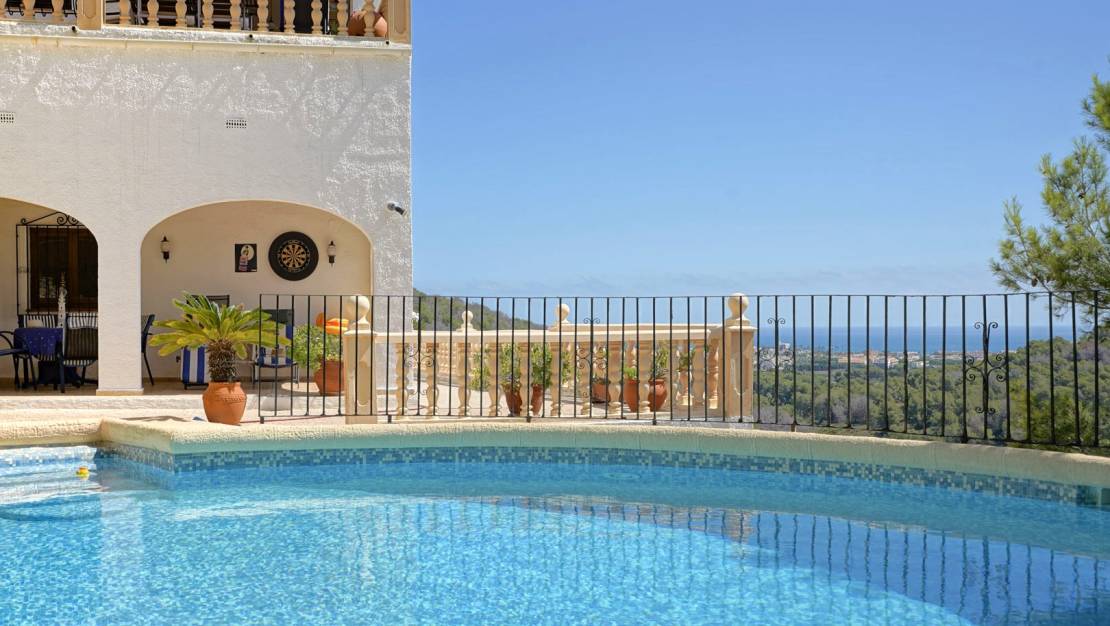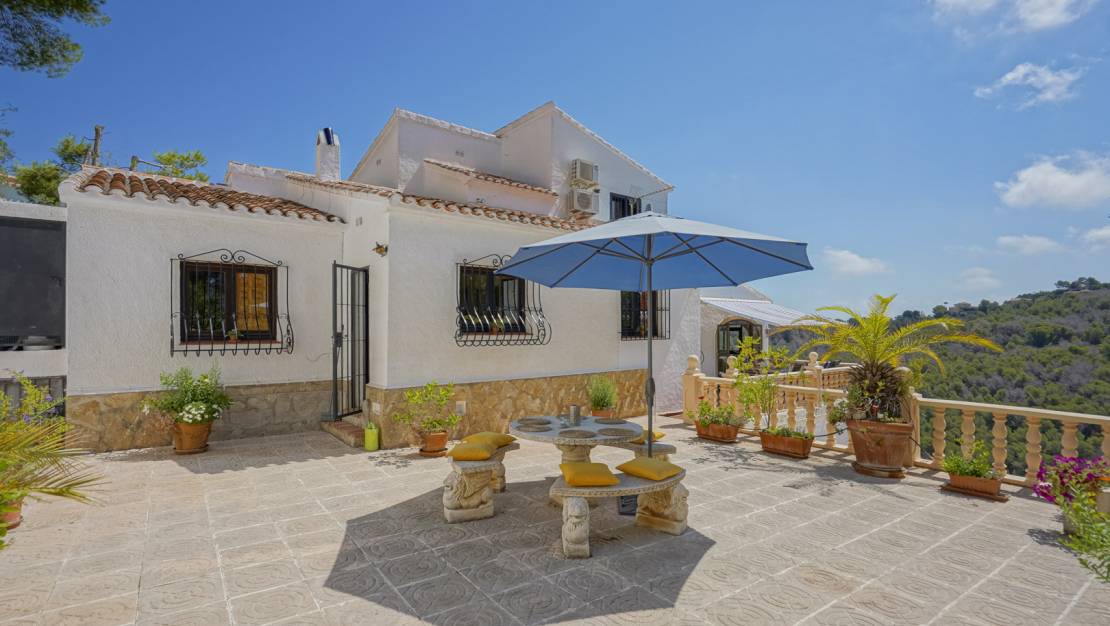 Villa tradicional con vistas al mar en Sol de Este, Jávea. Esta villa de 4 dormitorios se encuentra al final de una calle sin salida, en la tranquila urbanización Sol de Este. Gracias a su posición elevada, la propiedad disfruta de amplias vistas sobre los bosques y valles circundantes hasta el mar, y ofrece una privacidad absoluta. La vivienda se distribuye en tres plantas. En la planta principal hay un amplio salón-comedor con zona de estar acogedora y chimenea, un despacho independiente, una cocina amplia y separada, y dos dormitorios confortables que comparten un baño. En el lado este se encuentra una espaciosa naya, con un balcón en el lado norte y una gran terraza con toldo en el lado sur. Desde la cocina se accede directamente a una amplia terraza con barbacoa integrada, ideal para disfrutar de largas noches de verano. En la planta superior se encuentra el dormitorio principal con baño en suite. La planta baja ofrece una habitación adicional con aseo de invitados y un trastero que ya cuenta con las conexiones necesarias para instalar una cocina, lo que permite transformar fácilmente esta área en un apartamento independiente. Esta planta también ofrece acceso directo al garaje, con capacidad para dos vehículos. Si se desea, se pueden construir habitaciones adicionales en el garaje. Junto al garaje hay una terraza cubierta con vistas a la piscina orientada al sur de nada menos que 53 m2, lo que hace que esta planta sea especialmente atractiva. Además del garaje, hay varias plazas de aparcamiento disponibles en la parcela. Todas las estancias disponen de aire acondicionado, calefacción de gas mediante radiadores, armarios empotrados y televisores. En varias zonas de la casa se ha instalado calefacción por infrarrojos, lo que contribuye a un consumo energético eficiente. Gracias a las numerosas terrazas, siempre se puede encontrar un rincón tanto al sol como a la sombra. La ubicación de la villa es sumamente céntrica: en tan solo cuatro minutos se llega a la playa de arena de Jávea y a todos los servicios necesarios. El club de golf de Benitachell también se encuentra a pocos minutos, lo que convierte a esta propiedad en una residencia ideal tanto como vivienda habitual como casa de vacaciones.