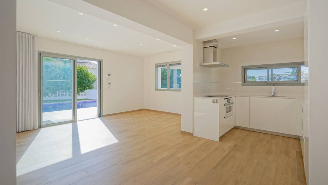 Esta villa lista para entrar a vivir se encuentra en una calle sin salida en la tranquila urbanización La Fustera, a solo un kilómetro de la preciosa costa de Benissa. La vivienda fue completamente renovada en 2023 y se distribuye en dos plantas. Toda la zona de estar se encuentra al nivel de la piscina e incluye un amplio salón-comedor con cocina abierta, equipada con horno multifunción Bosch, lavavajillas, frigorífico, congelador y placa de inducción. Además, hay un dormitorio principal con baño en suite y dos dormitorios adicionales que comparten un segundo baño. Un piso más abajo, a nivel de la calle, hay un amplio garaje con un lavadero contiguo, un cuarto técnico y una cochera. La villa está equipada con aire acondicionado frío/calor, armarios empotrados, persianas, mosquiteras, internet de fibra óptica, un sistema de filtrado de agua, 12 paneles solares fotovoltaicos y un amplio sistema de alarma con cámaras y sensores. En el exterior hay una piscina climatizada con ducha exterior climatizada, una terraza cubierta y una terraza abierta con toldo equipada con sensores de viento y lluvia. La casa está rodeada por un bonito jardín de fácil mantenimiento con árboles frutales y plantas mediterráneas. El centro de Calpe se encuentra a solo 10 minutos en coche, y el encantador pueblo costero de Moraira se encuentra a unos 15 minutos.