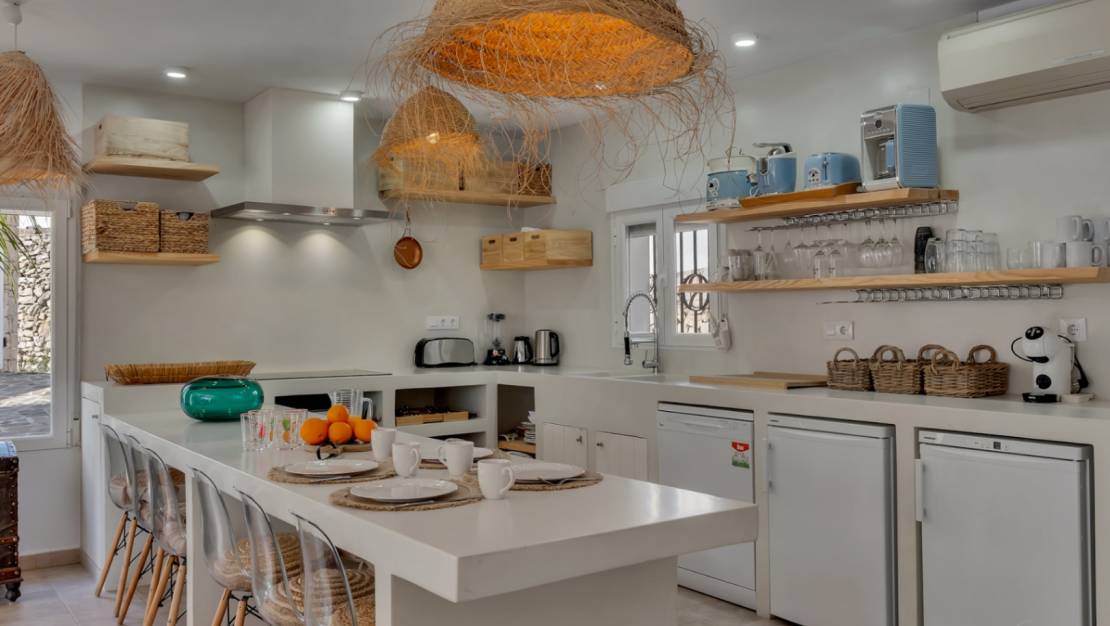 Por último, pero no menos importante, hay un quinto dormitorio en la planta baja, con acceso privado exterior, cama balinesa y baño ensuite en microcemento. Desde esta habitación puede acceder directamente a la hermosa terraza ajardinada con elegantes sombrillas y una cocina exterior cubierta completamente equipada – el lugar perfecto para disfrutar de sombra, convivencia y largas cenas durante los cálidos días de verano. Cuando cae la noche, puede subir un nivel: en la terraza de la azotea sobre la cocina exterior disfrutará de una copa de vino observando las luces de la zona y la mágica atmósfera.