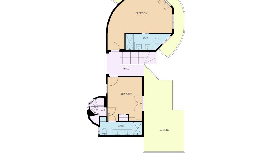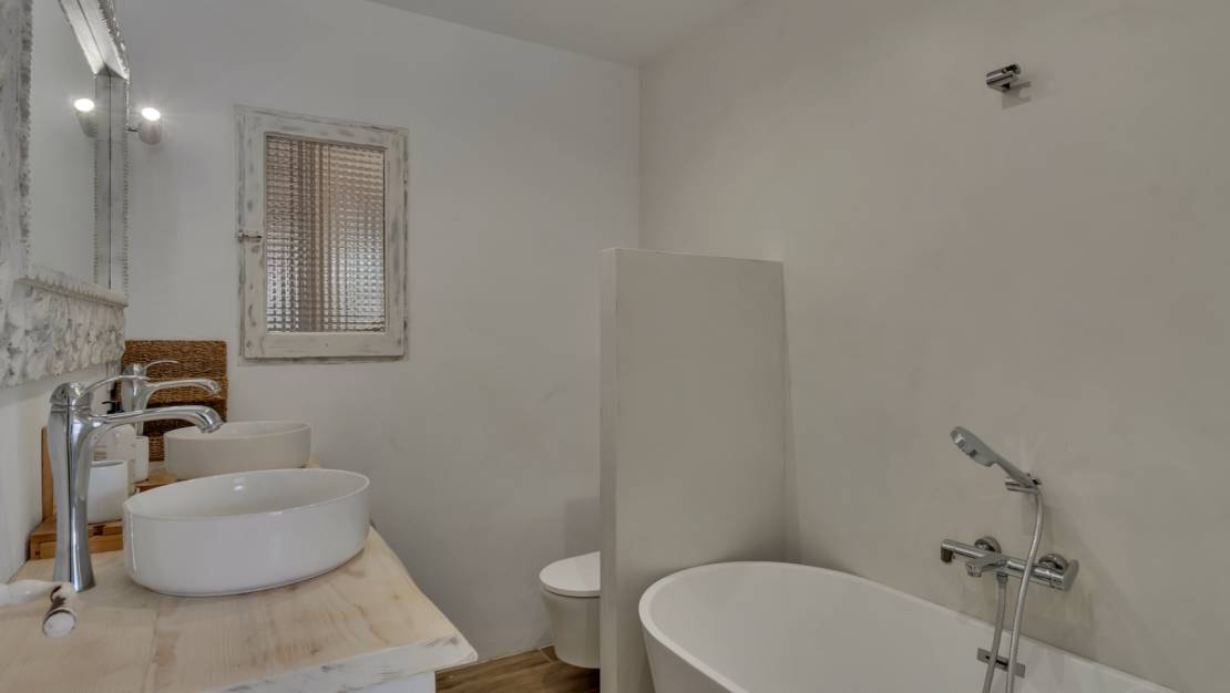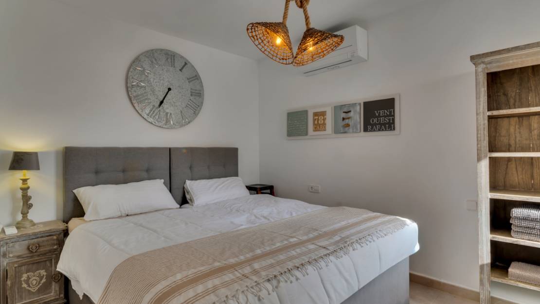 A continuación, a través de un pasillo abierto que conecta las habitaciones tres y cuatro, se llega al siguiente dormitorio – también conocido como la “habitación torre”. Un espacio verdaderamente único con techos altos, típicas vigas de madera españolas, un baño ensuite renovado y nuevamente un balcón con espectaculares vistas al mar.
