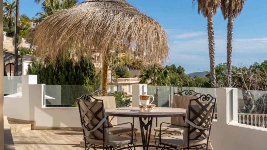 A través de una escalera interior se accede a la planta superior, que también se puede cerrar completamente, o puede acceder desde el exterior. Aquí encontrará un tercer amplio dormitorio con baño ensuite nuevo y un balcón privado de gran tamaño con increíbles vistas al mar y al centro de Moraira.