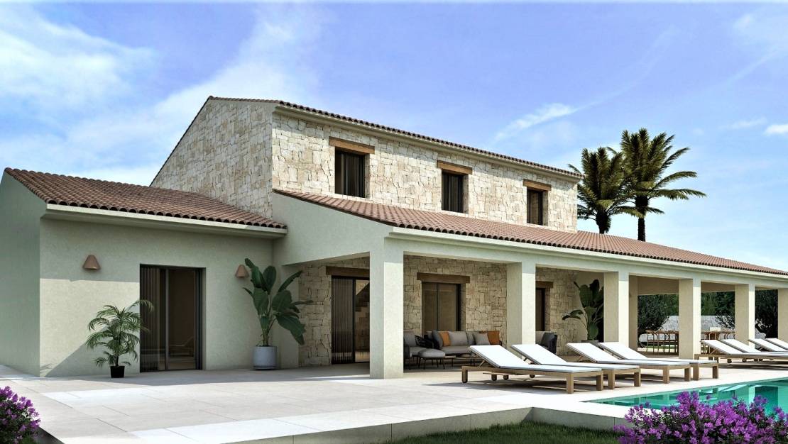 Mooie villa in finca-stijl op het zuidoosten te koop in Partida Benimeit, Moraira. Dit project combineert de luxe en het comfort van modern wonen met de stijl van een finca. Er is een zeer grote open naya met barbecue naast het zwembad, perfect om te ontspannen en buiten te dineren. De begane grond omvat een ruime woon/eetkamer met een volledig ingerichte open keuken met kookeiland, hierbuiten is de bijkeuken. Ook op dit niveau is een tweepersoons slaapkamer met badkamer en-suite en kleedruimte en een gastentoilet. De woonkamer en keuken hebben glazen deuren die leiden naar de naya en het terras bij het zwembad. Het luxe zwembad van 48 m2 krijgt led-verlichting en een buitendouche. Via de trap bereikt u de eerste verdieping, hier vindt u twee tweepersoonsslaapkamers met en-suite badkamers en een hoofdslaapkamer met inloopdressing en en-suite badkamer. Onderaan de trap vindt u een open ruimte die kan worden gebruikt als de klant wenst, een speelkamer, een thuisbioscoop of een fitnesscentrum.