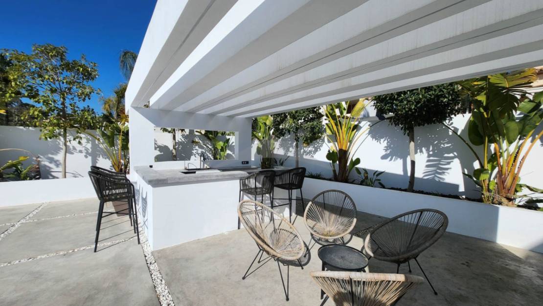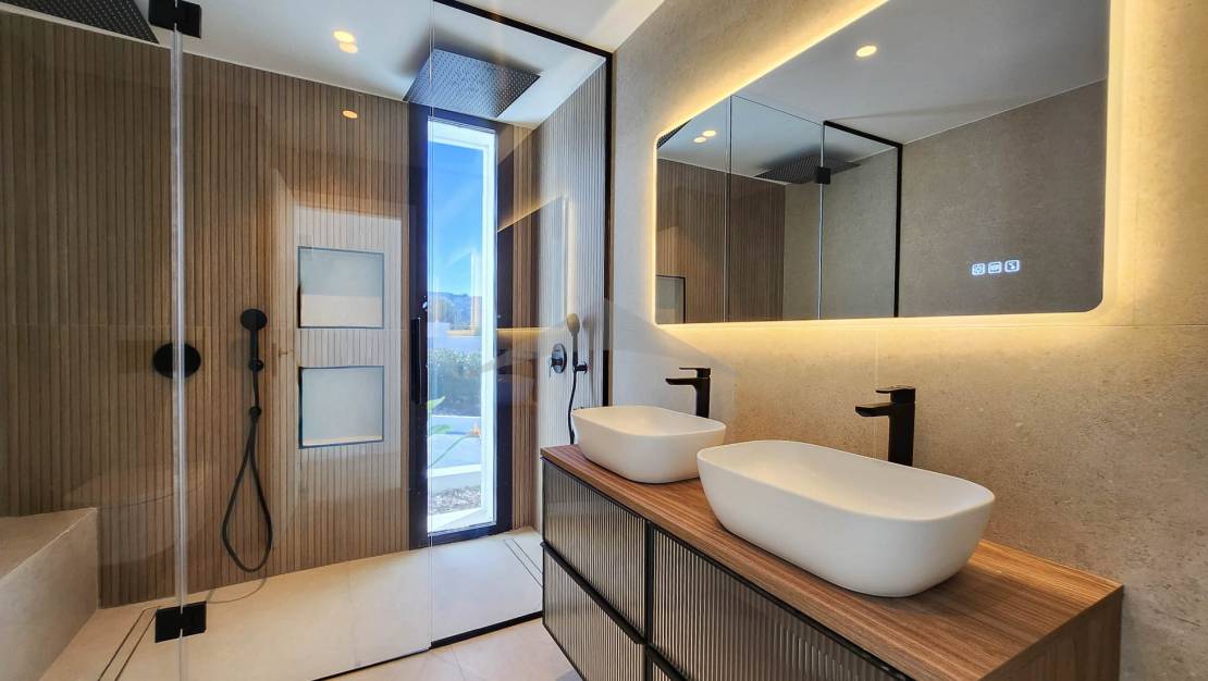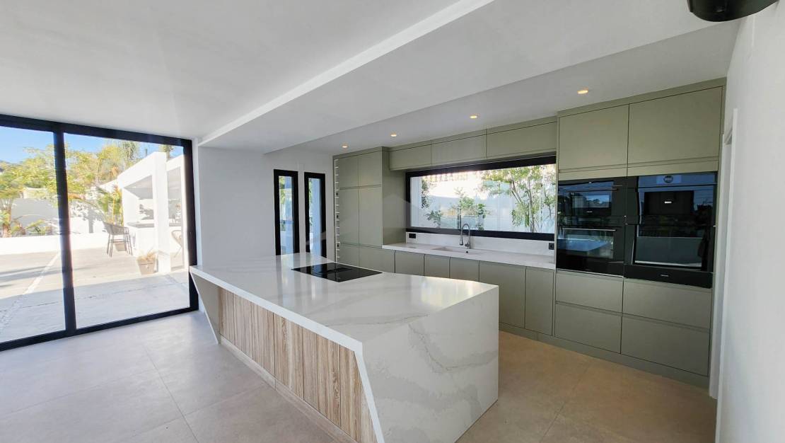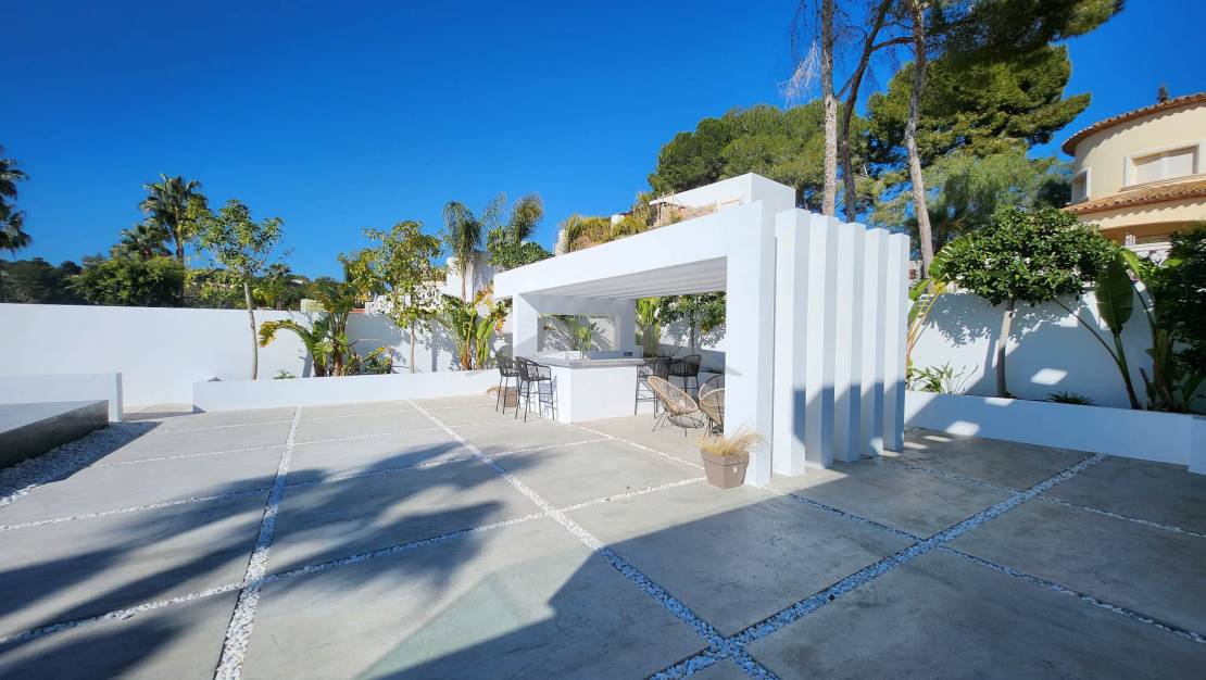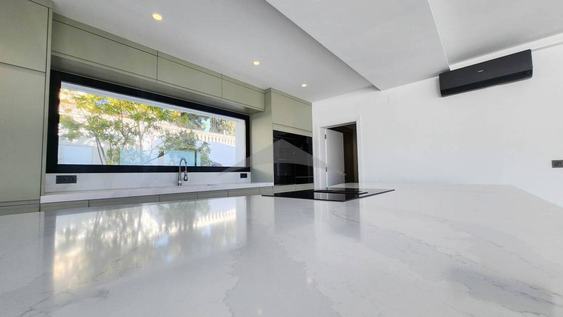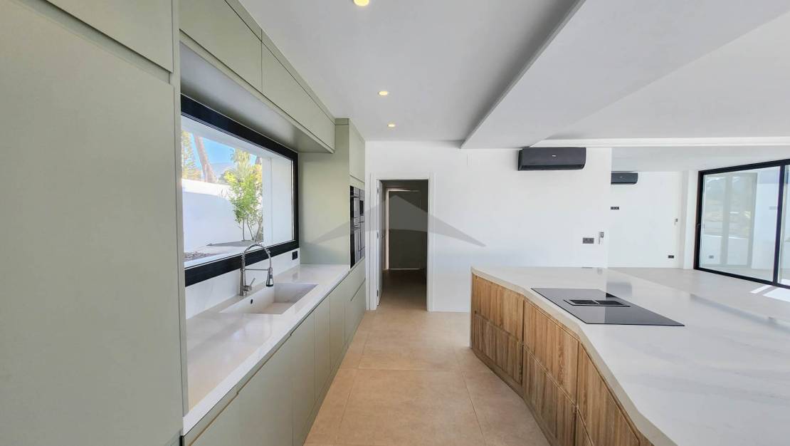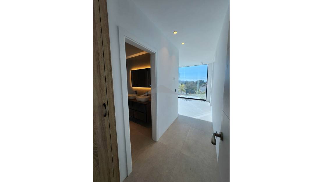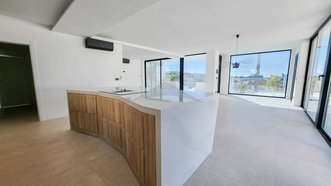 Gelegen op slechts 4 minuten rijden en 10 minuten fietsen van het centrum van Moraira, zal deze prachtige nieuwgebouwde villa u verleiden met zijn moderne ontwerp, zuidgerichte oriëntatie en hoogwaardige afwerkingen.Bij binnenkomst wordt u verwelkomd in een ruime en lichtvolle woonkamer, bestaande uit een grote woon- en eetkamer, die naadloos is verbonden met een moderne, volledig uitgeruste open keuken. Een van de opvallende kenmerken van deze woning zijn de brede schuifdeuren van vloer tot plafond, die directe toegang bieden tot de buitenterrassen en zorgen voor een perfecte verbinding tussen binnen- en buitenleven.Geniet van een magnifieke infinity pool en een volledig uitgeruste zomerkeuken, ideaal om te ontspannen en te entertainen op zonnige dagen in een uitzonderlijke omgeving.Op de begane grond omvat de villa:Twee comfortabele slaapkamers,Een gasten-WC,En een utilityruimte met directe toegang tot de garage — een zeer praktische functionaliteit om boodschappen te lossen of discreet toegang tot de woning te krijgen.Op de bovenverdieping vindt u:Twee extra slaapkamers,En een master suite met een privé kleedkamer en uitzicht op zee.De woning beschikt ook over meerdere privéterrassen, die rust en stilte bieden voor elke gast. Buiten biedt de oprit parkeergelegenheid voor 4 tot 5 voertuigen, naast de afgesloten garage.