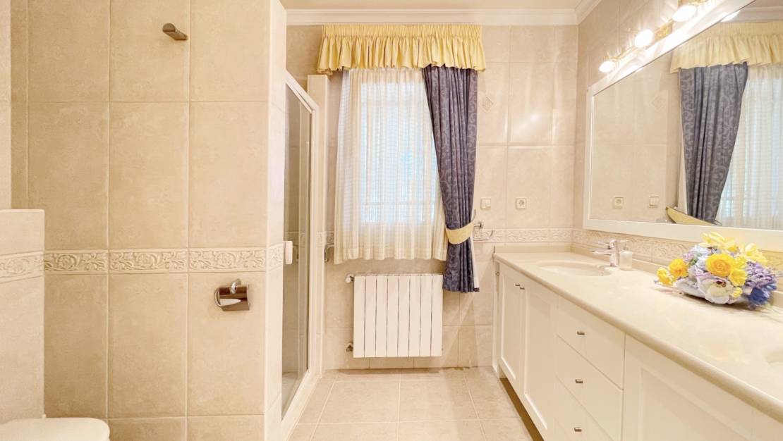 Vanuit de hal komt u in een lichte woon-eetkamer met een gezellige gashaard, die uitkomt op een spectaculaire naya met een glazen schuifwand. Een bijzonder voordeel is dat de gehele begane grond gelijkvloers is met de naya, de buitenterrassen en het ruime zwembad, wat zorgt voor een perfecte verbinding tussen binnen en buiten. Op deze verdieping bevinden zich een grote keuken met geïntegreerde eethoek, een ruime garage met directe toegang tot de wasruimte, drie comfortabele slaapkamers, twee badkamers (waarvan een en-suite) en een gastentoilet.