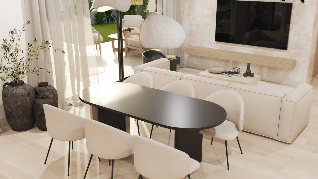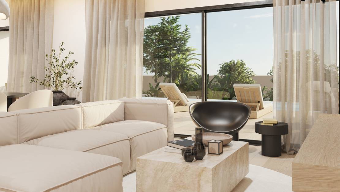 De buitenruimtes van deze woningen zijn ontworpen om te genieten van het mediterrane klimaat. Elke woning heeft een privé tuin, perfect om te ontspannen of van buitenactiviteiten te genieten. Daarnaast beschikken ze over een terras en een solarium, ideaal om te zonnebaden of te genieten van het adembenemende uitzicht op zee. De aanwezigheid van een privé zwembad in elke woning voegt een vleugje luxe toe, waardoor bewoners kunnen afkoelen en genieten van ontspannende momenten in het comfort van hun eigen huis.