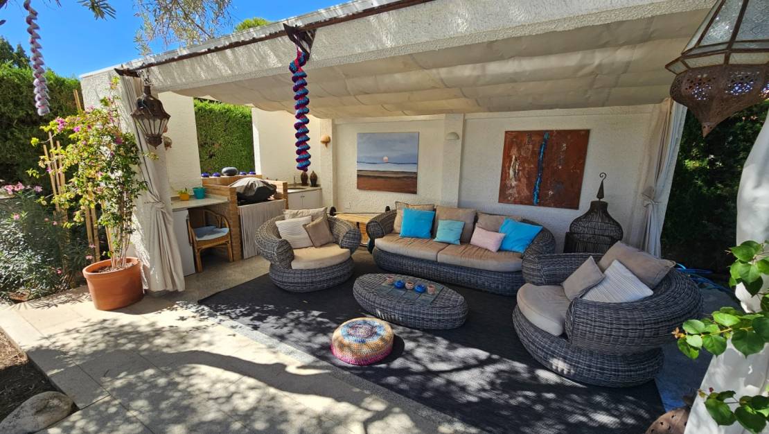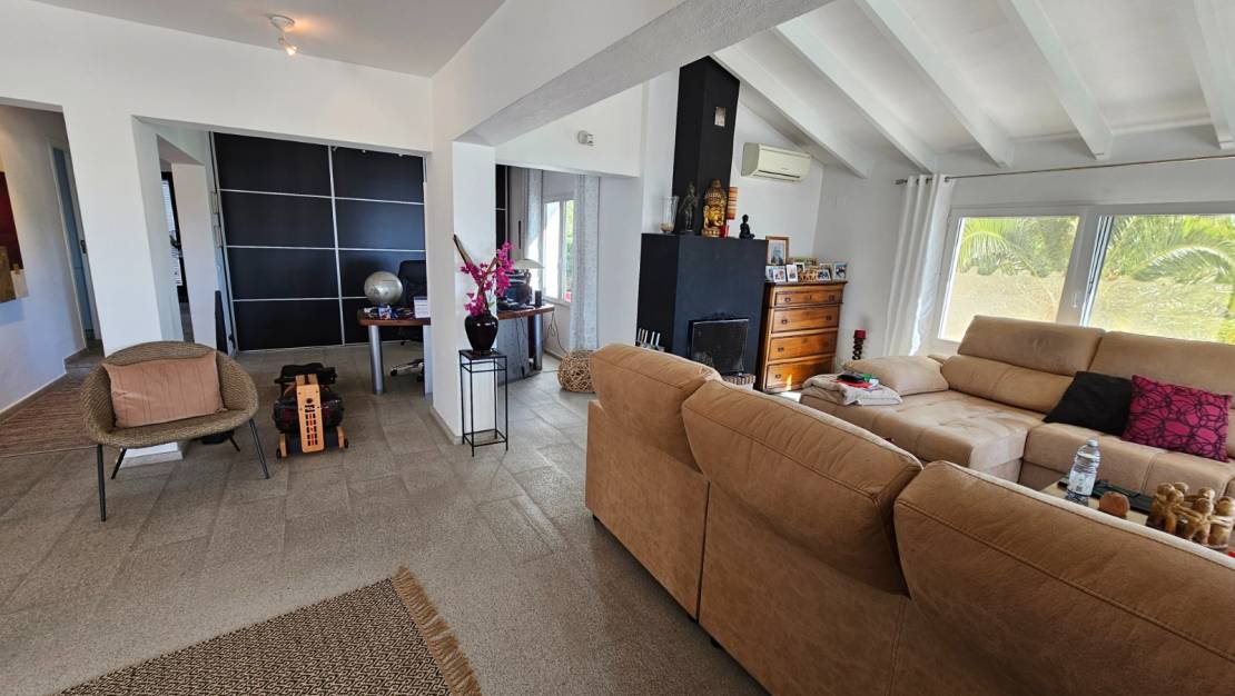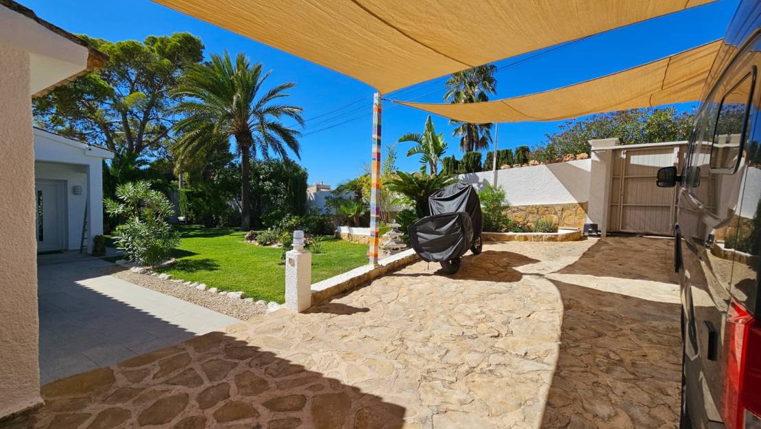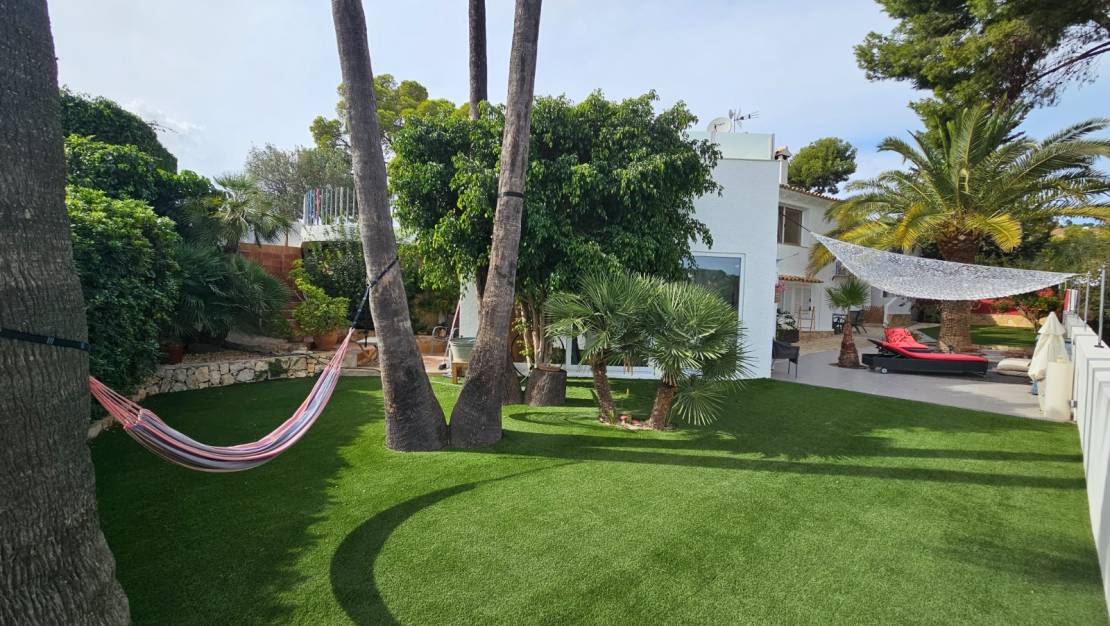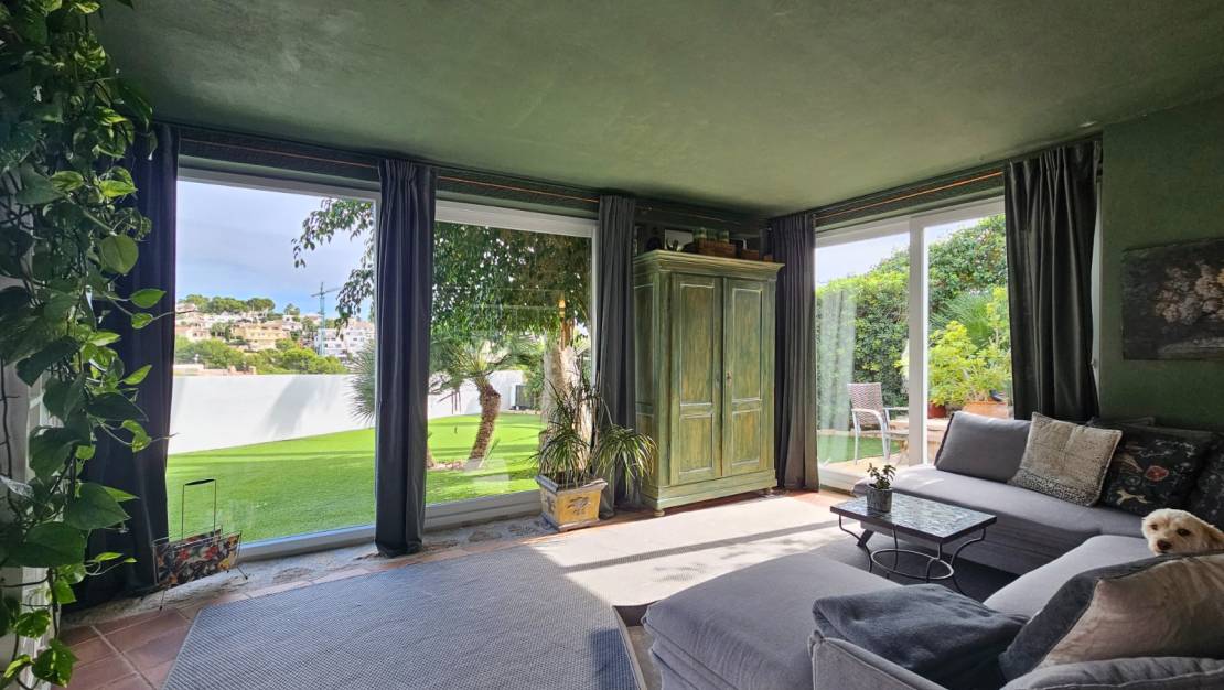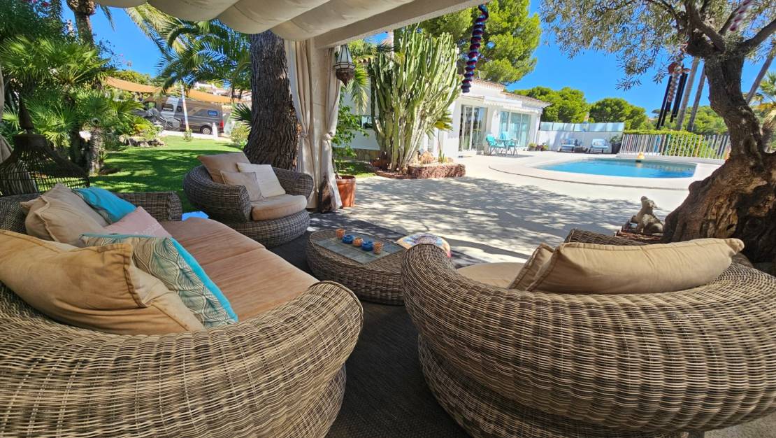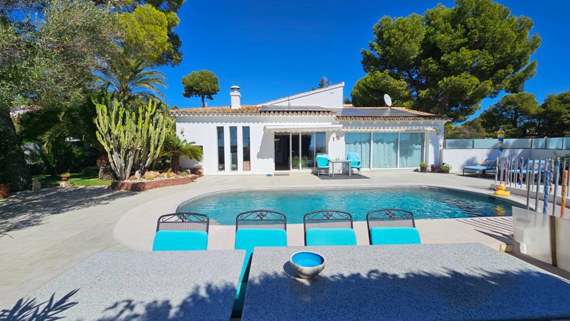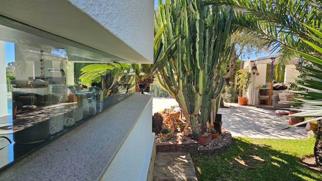 Luxe gerenoveerde villa op de golfbaan San Jaime, vlakbij Moraira. Deze onlangs gerenoveerde villa ligt direct aan de beroemde golfbaan San Jaime in Benissa. Met vijf slaapkamers en drie badkamers is deze villa ideaal voor een gezin. Op de begane grond komt de villa uit op een ruime en lichte woon-/eetkamer met grote openslaande deuren naar een zwembad van 9 x 4,5 m en een groot terras met uitzicht op zee en de Peñón de Ifach. Dit terras beschikt tevens over een aangename zomerkeuken. De moderne keuken grenst aan de woonkamer en is voorzien van hoogwaardige apparatuur en afwerkingen. Op de eerste verdieping, gewijd aan ontspanning en privacy, bevindt zich ook de hoofdslaapkamer. Hier vindt u een gastentoilet en een ruime badkamer met douche en bad, die u deelt met de tweepersoonsslaapkamer. Beide slaapkamers hebben openslaande deuren. De villa is voorzien van zonnepanelen met een wateropslagsysteem. Daarnaast is de tuin voorzien van airconditioning, vloerverwarming, dubbel glas en een irrigatiesysteem. De buitenruimte beschikt over een barbecue, voldoende parkeergelegenheid en een comfortabel gastenverblijf. Het gehele pand is omgeven door een prachtig aangelegde mediterrane tuin. De kelder biedt diverse bergingen en herbergt tevens het appartement met een open keuken en woonkamer, en twee eenpersoonskamers die een badkamer delen.