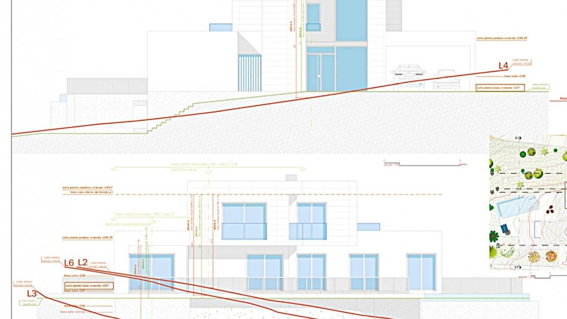 1400m2 hoekperceel met panoramisch uitzicht te koop in Altea, compleet met een gelicenseerd project om een 307m2 moderne villa te bouwen. Het perceel is gelegen in een woonwijk op slechts een klein eindje rijden van de stranden, restaurants en winkels langs de kustweg naar Altea oude stad en Albir, en ook dicht bij de tennisbanen en de golfbaan.Het project betreft een villa met vier slaapkamers en drie badkamers, verdeeld over drie verdiepingen, met een open woonkamer, bijkeuken, fitnessruimte, barbecueterras, overloopzwembad en dubbele garage. De vergunning is verleend door het gemeentehuis, dus je kunt meteen aan de slag.Aarzel niet om contact met ons op te nemen voor meer informatie.