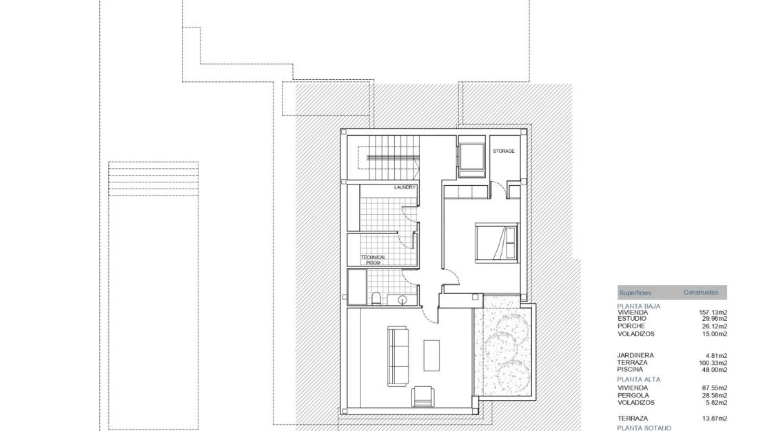Deze prachtige villa wordt gebouwd in de wijk Benimeit in Moraira, op slechts 7 minuten rijden van het strand en het stadscentrum. De villa wordt verdeeld over 3 verdiepingen, waarvan de hoofdverdieping directe toegang heeft tot het terras bij het zwembad. De belangrijkste woonlaag bestaat uit een ruime open woonkamer met een open keuken met bijkeuken en eiland, een tweepersoons slaapkamer met en-suite badkamer, een gastentoilet en een ruim kantoor dat een 5e slaapkamer zou kunnen zijn. De eerste verdieping bestaat uit een tweepersoonsslaapkamer met en-suite badkamer en kleedruimte, nog twee tweepersoonsslaapkamers en een gedeelde badkamer. De kelder van 94m2 bestaat uit een grote ruimte die gebruikt kan worden als wellnessruimte/gym, een badkamer, wasruimte, technische ruimte en een Engelse patio. Voor uw gemak hebben de drie verdiepingen een verbindingstrap en een lift, Het ruime zwembadterras heeft een overdekt gedeelte voor schaduw en een luxe zwembad van 12 x 4 m met buitendouche.- Belangrijkste punten:- Topkwaliteit tegels, binnen en buiten- Gelakte aluminium deuren en ramen, kleur naar keuze- Veiligheidsramen met dubbele beglazing met Climalit, elektrische rolluiken in de slaapkamers- 2..3m hoge binnendeuren afwerking te kiezen- Luxe keuken te kiezen door klant- Leuningen binnen en buiten van glas- Badkamers te kiezen door klant- Vloerverwarming door warmtepomp- Airconditioning in woonkamer en slaapkamers- Zwembad te voorzien van trap, 2 LED lampen en een zwembaddouche warm/koud- Voor meer informatie over dit project kunt u altijd contact met ons opnemen.   - Afstanden- Klein winkelcentrum 1.1km- Stadscentrum, strand en jachthaven 2.9km- Golf 3.9km- Toegang tot de snelweg in Benissa 6.9km