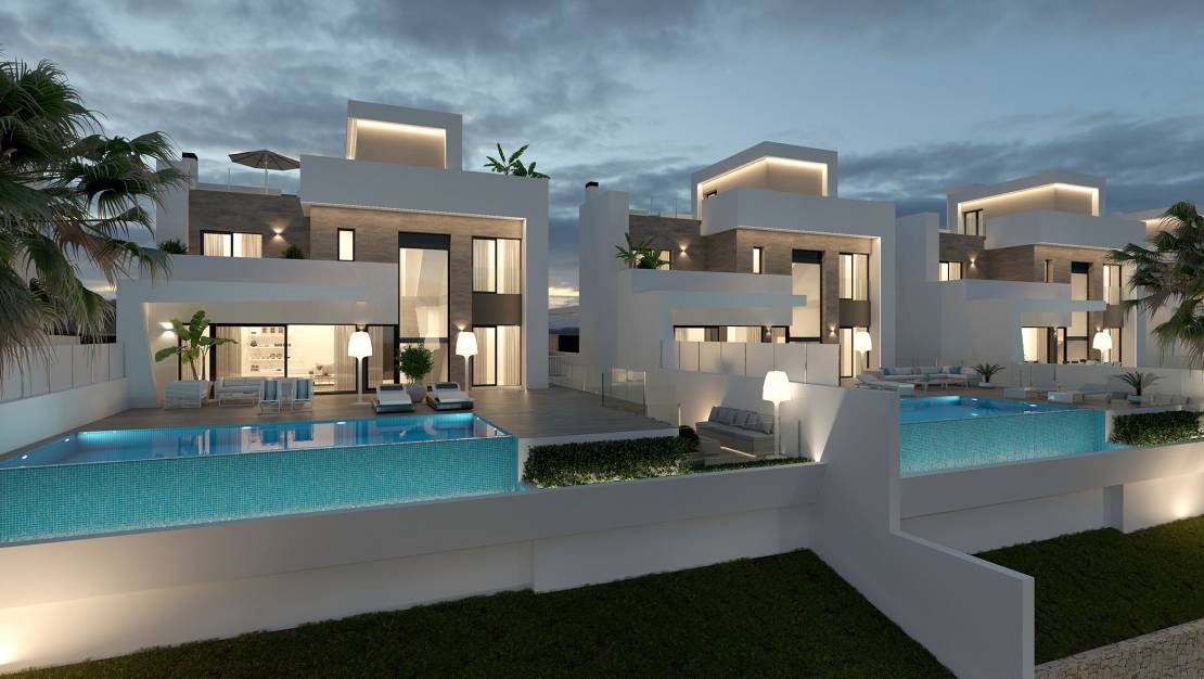 De buitenruimtes van deze woningen zijn ontworpen om een ongeëvenaarde buitenlevensstijl te bieden. Elke woning heeft een privé tuin, ideaal om te ontspannen of buitenactiviteiten te ondernemen. Daarnaast beschikken de woningen over een privézwembad, perfect om af te koelen op warme dagen. De ruime terrassen bieden extra ruimte voor entertainment of gewoon om te genieten van het uitzicht op zee. De aanwezigheid van een solarium voegt een vleugje luxe toe, waardoor u in een privéomgeving van de zon kunt genieten. De toevoeging van pergola's in het exterieurontwerp biedt een esthetisch en functioneel element, dat schaduw en een gezellige ruimte biedt voor buitenbijeenkomsten.