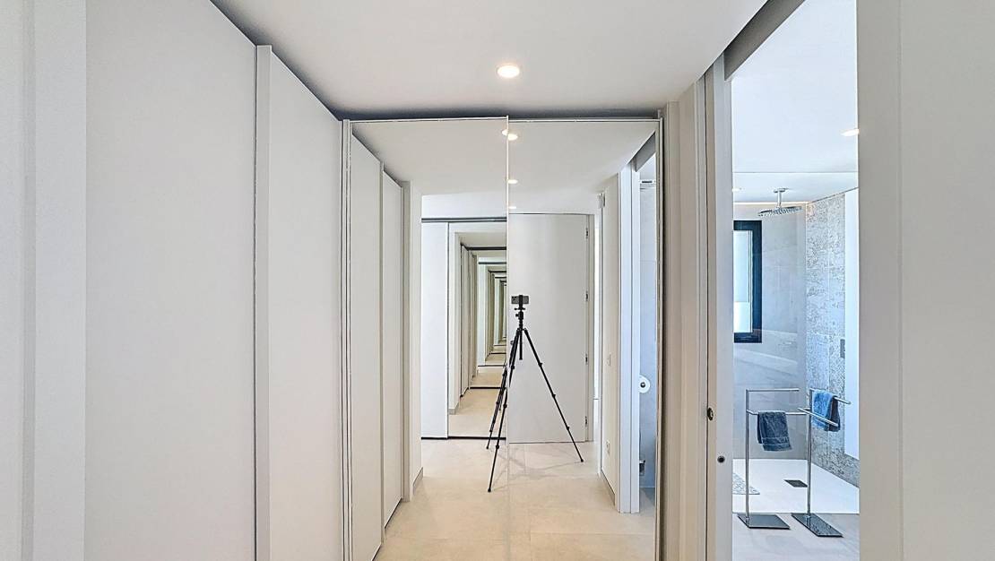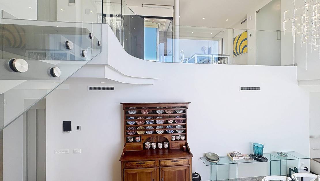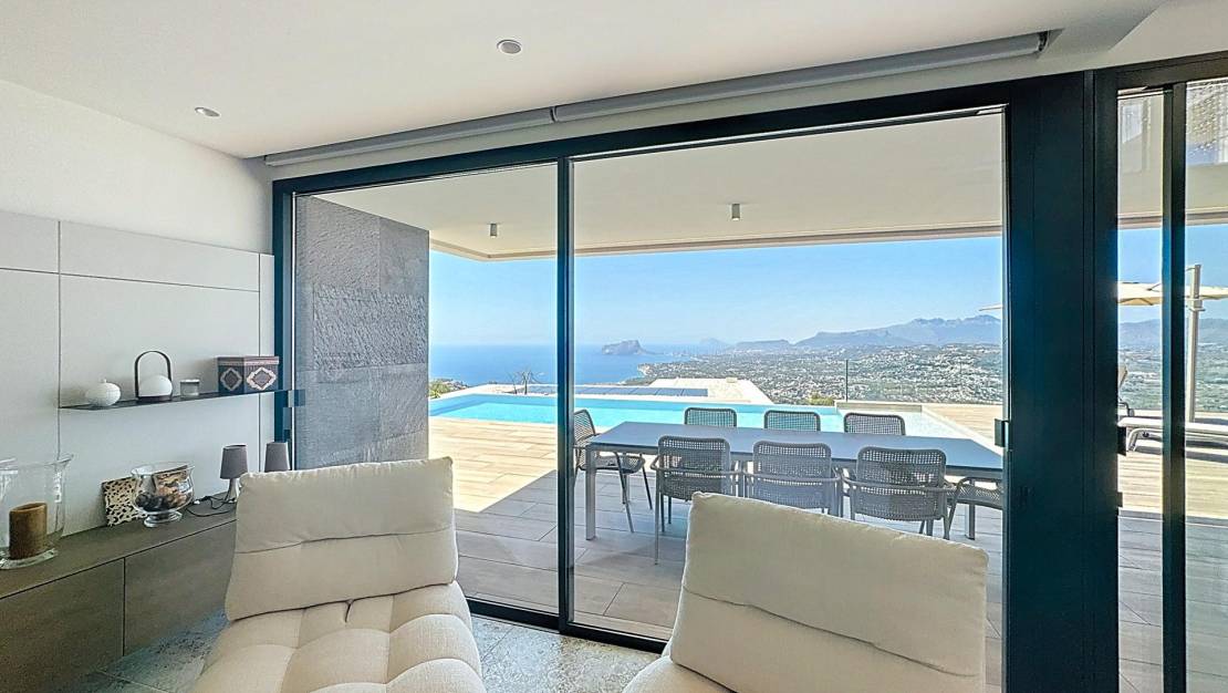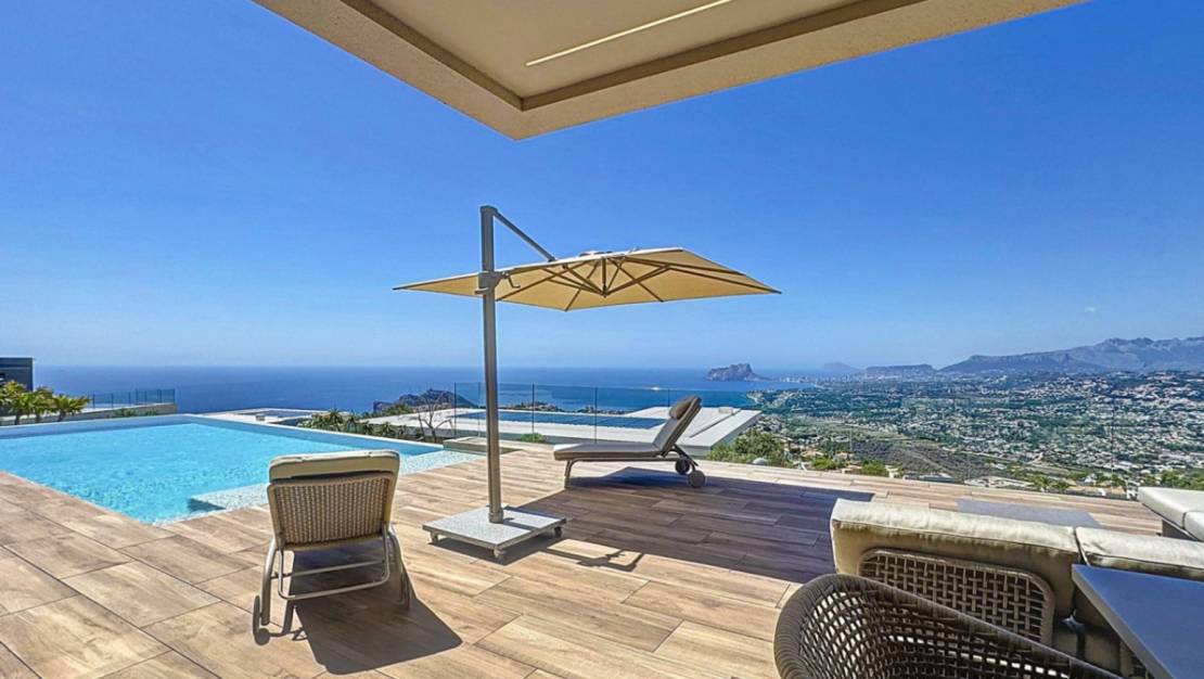 Luxe villa met panoramisch uitzicht op zee in de exclusieve wijk Jazmines, Cumbre del Sol Eigentijds design, maximale privacy en een ongeëvenaard uitzichtDeze indrukwekkende luxe villa is gelegen op een van de meest bevoorrechte locaties van de noordkust van de Costa Blanca: de residentiële wijk Jazmines, in de prestigieuze urbanisatie Cumbre del Sol, tussen Moraira en Jávea, in de gemeente Benitachell. Een unieke enclave waar avant-gardistisch architectonisch design samengaat met een spectaculaire natuurlijke omgeving. De woning valt op door zijn spectaculaire panoramische uitzichten op de Middellandse Zee, die zich uitstrekken van de kust van Moraira en Benissa tot de imposante Peñón de Ifach in Calpe, langs de majestueuze Sierra de Bernia, dit alles omlijst door het diepblauwe water van de zee. Een exclusieve woning verdeeld over drie verdiepingenMet een totale bebouwde oppervlakte van 544 m² op een hoekperceel van 940 m² biedt deze villa 5 tweepersoonsslaapkamers, allemaal met eigen badkamer, naast ruime terrassen, open woonruimtes en meerdere buitenruimtes die zijn ontworpen om het hele jaar door van te genieten. Begane grond: functionaliteit en indrukwekkend uitzichtWe betreden het pand via een elegante entree waar zich de overdekte garage (46 m²), een technische ruimte met wasruimte en de hoofdingang van de woning bevinden. Vanaf hier opent zich een spectaculaire open ruimte met een woonkamer met dubbele hoogte en een enorm panoramisch raam met uitzicht op zee. Op hetzelfde niveau bevinden zich drie tweepersoonsslaapkamers, allemaal met inbouwkasten, een eigen badkamer en toegang tot terrassen met uitzicht. De hoofdslaapkamer heeft bovendien een elegante kleedkamer en toegang tot een privéterras. Begane grond: open ruimtes, licht en verbinding met buitenVia een zeer comfortabele binnentrap komen we in een ruimte die indruk maakt door zijn ruimtelijkheid en lichtinval. Een woon-eetkamer met dubbele hoogte wordt gedomineerd door een raam van 8 meter dat de zee als een schilderij omlijst. De moderne, volledig uitgeruste keuken met aparte bijkeuken komt uit op het buitenterras. Op deze verdieping bevindt zich ook een toilet. Vanuit de keuken en de woonkamer heeft u toegang tot het hoofdterras met het privézwembad, de mediterrane tuin en een barbecueplaats met zomerkeuken, ideaal om het hele jaar door van het klimaat en het uitzicht te genieten. Kelderverdieping: gastenappartement met aparte ingangVia een buitentrap komt u in het gastenappartement, dat bestaat uit twee tweepersoonsslaapkamers, twee complete badkamers, airconditioning en een overdekt terras met een spectaculair uitzicht op de natuurlijke omgeving en de zee. Uitrusting en premium kwaliteitenElk detail van deze woning is zorgvuldig geselecteerd om maximaal comfort en efficiëntie te garanderen: Vloerverwarming en airconditioning via luchtkanalenDomoticasysteem, alarm en hoogwaardige afwerkingFotovoltaïsche installatie van 15 kWZwembad met gemotoriseerde overkappingBuitenkeuken en aangelegde tuinenDeze villa biedt niet alleen een luxe ervaring, maar ook duurzaamheid en energie-efficiëntie. Wilt u in een villa als deze wonen?Als u op zoek bent naar een exclusieve woning aan de noordkust van de Costa Blanca, met privacy, een modern design en een ongeëvenaard uitzicht, dan is deze woning in de wijk Jazmines iets voor u. Neem vandaag nog contact met ons op en ontdek waarom zoveel mensen voor Cumbre del Sol hebben gekozen om met volledige gemoedsrust te wonen of te investeren. Woonwijk Jazmines – Cumbre del SolDe wijk Jazmines is een van de meest exclusieve wijken van Cumbre del Sol, een gevestigde, rustige omgeving die zeer gewaardeerd wordt door internationale kopers. De wijk ligt aan de zuidelijke ingang van de urbanisatie, waardoor u uitstekend verbinding heeft met Moraira en Jávea. Enkele van de belangrijkste kenmerken zijn: Prachtig uitzicht op Ibiza, Granadella, Portet, Peñón de Ifach en de Sierra de BerniaRuime percelen van 800 m² tot 1.200 m², met maximale privacyModern architectonisch ontwerp, met hoogwaardige afwerkingOngeëvenaarde natuurlijke omgeving, omgeven door zee en bergenNabijheid van baaien, hoogwaardige voorzieningen en recreatiegebiedenWonen in Jazmines staat synoniem voor welzijn, exclusiviteit en levenskwaliteit. Hier koopt u niet alleen een huis, u koopt een manier van leven.
