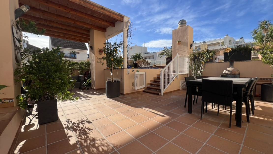 Dit ruime duplex penthouse beschikt over vier slaapkamers, twee badkamers en een gastentoilet. Op de begane grond vindt u een ruime woonkamer met toegang tot een overdekt terras met uitzicht op zee, de keuken, de eetkamer en de hoofdslaapkamer met een en-suite badkamer. Boven bevinden zich nog drie slaapkamers en een van de badkamers.