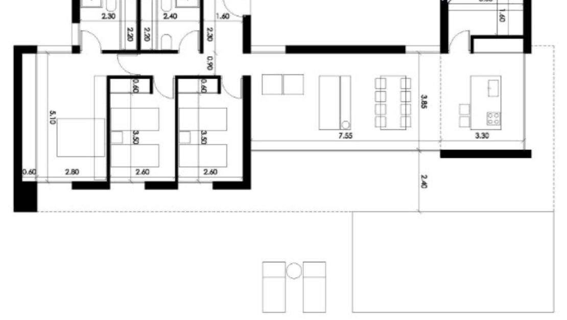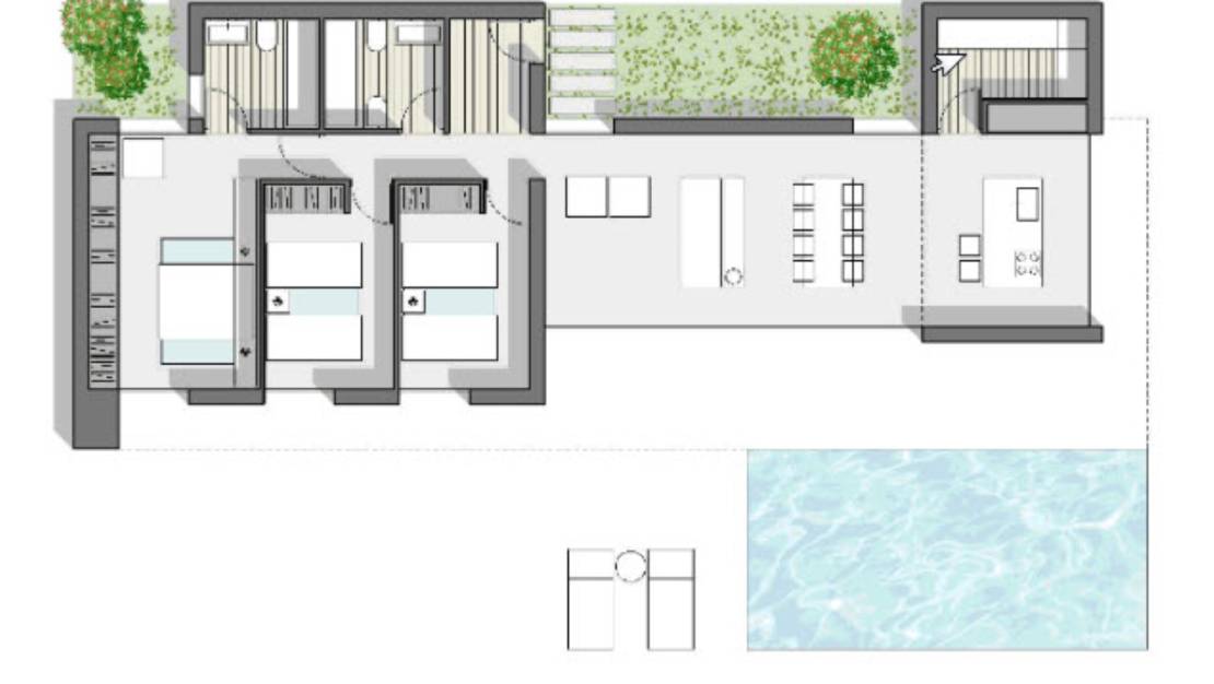 Moderne nieuwbouwvilla te koop in Denia, gelegen op een korte afstand van het strand, de boulevard en het historisch stadscentrum. Er is een inkomhal, een woonkamer met een open keuken , een bijkeuken, een masterbedroom met en suite badkamer en nog 2 tweepersoons slaapkamers die een badkamer delen. Vanuit elke kamer heeft men toegang tot het terras. Buiten is er een overdekt terras, een zonneterras en een zwembad. Het project beschikt nog niet over een bouwlicentie, opleverdatum na ondertekening contract is minimaal 2 jaar. Meer informatie op aanvraag.