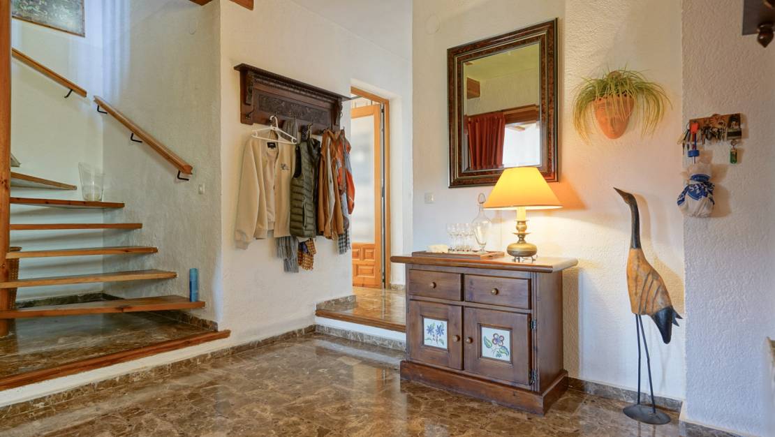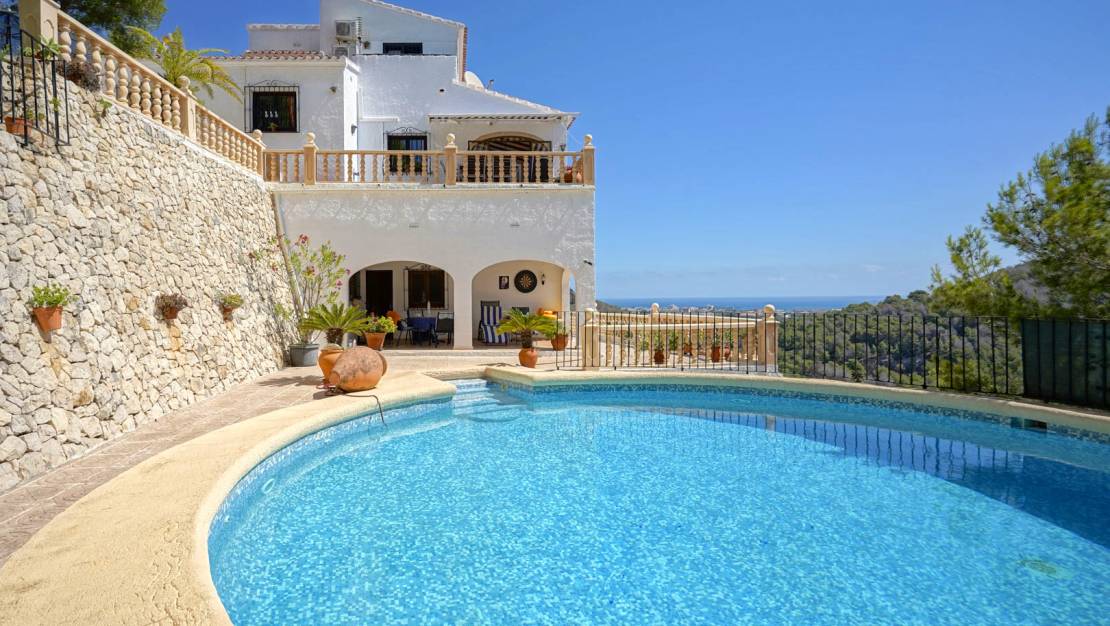 Traditionele villa met zeezicht in Sol de Este, Javea. Deze 4 slaapkamer villa ligt aan het einde van een doodlopende straat, in de rustige urbanisatie Sol de Este. Dankzij de verhoogde ligging geniet de villa van een weids uitzicht over de omliggende bossen en valleien, tot aan de zee, en is absolute privacy gegarandeerd. De woning strekt zich uit over drie verdiepingen. Op de eerste verdieping bevindt zich een ruime woon-eetkamer met een gezellig salon en open haard, een aparte kantoorruimte, een ruime aparte keuken en twee comfortabele slaapkamers die een badkamer delen. Aan de oostzijde ligt een ruime naya, waarvan de noordkant een balkon en aan de zuidkant een groot terras met luifel is. Vanuit de keuken is er directe toegang tot een ruim terras met een ingebouwde barbecue, ideaal voor lange zomeravonden. Op de tweede verdieping bevindt zich de hoofdslaapkamer met een eigen badkamer. De benedenverdieping biedt een extra kamer met een gastentoilet en een bergruimte die reeds voorzien is van aansluitingen voor een keuken, waardoor hier eenvoudig een zelfstandig appartement kan worden gerealiseerd. Deze ruimte biedt bovendien directe toegang tot de garage, die plaats biedt aan twee voertuigen. Indien gewenst kunnen in de garage ook nog extra kamers worden gebouwd. Aangrenzend ligt een overdekt terras dat uitkijkt op het zuidelijk georiënteerde zwembad van wel liefst 53 m2, wat deze verdieping bijzonder aantrekkelijk maakt. Naast de garage zijn er ook meerdere parkeerplaatsen op het eigen terrein aanwezig. Alle kamers zijn uitgerust met airconditioning, gasverwarming via radiatoren, ingebouwde kasten en televisies. Op verschillende plaatsen in de woning is bovendien infraroodverwarming geïnstalleerd, wat bijdraagt aan een energiezuinig verbruik. Bovendien kun je dankzij de vele terrassen steeds een plekje vinden zowel in de zon als in de schaduw. De ligging van de villa is uiterst centraal: binnen vier minuten bereik je het zandstrand van Javea en alle noodzakelijke voorzieningen. Ook de golfclub van Benitachell bevindt zich op slechts enkele minuten afstand, wat deze woning uitermate geschikt maakt als permanente verblijfplaats of als vakantiewoning.