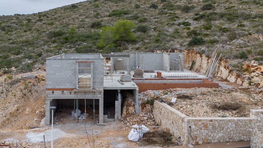 Moderne nieuwbouwvilla in aanbouw te koop in Racó de Nadal, Benitachell Deze moderne villa bevindt zich in de rustige en moderne woonwijk Racó de Nadal, op slechts 2 km van het centrum van Benitachell en op ongeveer 6 km van de bruisende kustplaatsen Jávea en Moraira. De villa is op het zuiden georiënteerd en verdeeld over één woonlaag, met daarnaast een semi-kelderverdieping waarin zich een ruime garage met plaats voor twee wagens bevindt. Voor extra comfort is er tevens parkeergelegenheid ter hoogte van het woongedeelte. Binnen biedt de woning een lichte en open leefruimte met een zit- en eetgedeelte en een open keuken met kookeiland. Verder is er een hoofdslaapkamer met en suite badkamer en twee tweepersoonsslaapkamers die een tweede badkamer delen. Voor een optimaal wooncomfort wordt de villa uitgerust met vloerverwarming en gekanaliseerde airconditioning, evenals inbouwkasten, elektrische rolluiken en zonnepanelen voor de productie van warm water. Buiten vind je een overdekt terras met barbecue, een zwembad van 3,5 x 9 meter met zonneterras en een buitenbadkamer. De woning wordt omringd door een onderhoudsvriendelijke mediterrane tuin. De urbanisatie Racó de Nadal staat bekend om haar moderne infrastructuur, ondergrondse nutsvoorzieningen en prachtige uitzichten op de bergen en het omliggende groen. De omgeving is rustig en residentieel, met zowel vrijstaande villa’s als halfvrijstaande woingen. Alle voorzieningen van Benitachell, Jávea en Moraira zijn binnen enkele minuten bereikbaar zijn.