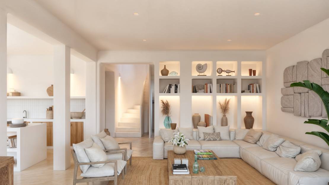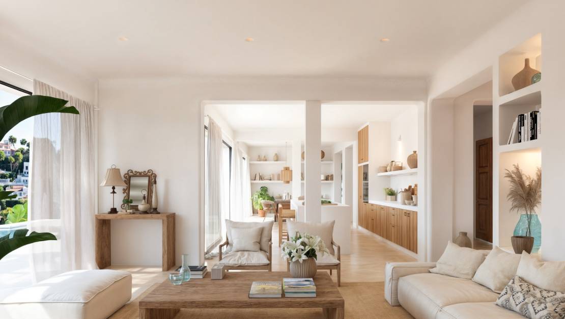 Ibiza-stijl villaproject met zeezicht te koop in Benissa Dit exclusieve Ibiza-stijl villaproject is gelegen in de moderne villawijk Racó de Galeno in Benissa en biedt een adembenemend panoramisch uitzicht over de Middellandse Zee. De villa combineert moderne elegantie met mediterrane charme en wordt gebouwd met hoogwaardige materialen en afwerkingen van het hoogste niveau. De begane grond bestaat uit een ruime woonkamer met een open keuken met kookeiland, eetgedeelte en salon die uitkijkt op het zwembad en de zee. Op dezelfde verdieping bevinden zich twee tweepersoonsslaapkamers, elk met een en-suite badkamer, en een gastentoilet voor extra comfort. Op de bovenverdieping bevindt zich de mastersuite met een dressing en een en-suite badkamer, evenals een vierde slaapkamer met en-suite badkamer. Beide kamers geven toegang tot een royaal zonneterras met pergola en een ideale zuidwestelijke oriëntatie, waar u tot laat in de avond van de zon kunt genieten. De kelderverdieping omvat een ruime garage, een fitnessruimte, een cinemazaal en een extra badkamer. Vanuit de woonkamer leidt een groot schuifraam naar het zonnige terras met overloopzwembad, meerdere pergola’s en een uitnodigende loungehoek, omringd door een mediterrane tuin. Bij de bouw van deze villa worden uitsluitend materialen van topkwaliteit gebruikt. De binnen- en buitenmuren krijgen een elegante Ibiza-stijl pleisterafwerking met geïntegreerde plinten voor een naadloze uitstraling. De ramen en schuifdeuren zijn van het merk TECHNAL, model SOLEAL, met verzonken profielen en elektrische rolluiken in alle slaapkamers. Binnen zorgen vloerverwarming en gekanaliseerde airconditioning voor een optimaal comfort gedurende het hele jaar. De keuken wordt uitgevoerd in de kenmerkende Ibiza-stijl, met natuurlijke tinten en hoogwaardige afwerking inclusief inbouwapparatuur. De badkamers worden afgewerkt in mortel, microcement of tegelwerk, met ROCA sanitair en FIMA SPILLO kranen in elegant matzwart. Het overloopzwembad wordt bekleed met mozaïektegels van het type Bassetes en is voorzien van een voorinstallatie voor verwarming. De buitenruimte weerspiegelt dezelfde verfijning: natuurlijke stenen tuinmuren gecombineerd met witgepleisterde gevels, houten pergola’s met polycarbonaatdak en terrassen met vloeren die aansluiten bij het interieur. De ligging is ideaal: het centrum van Calpe ligt op minder dan tien minuten rijden, evenals de idyllische kustlijn van Benissa met haar kristalheldere baaien. Deze villa biedt een perfecte balans tussen stijl, comfort en locatie.
