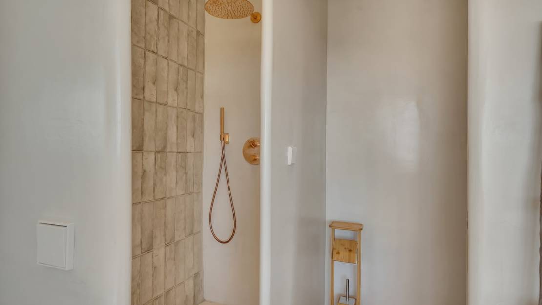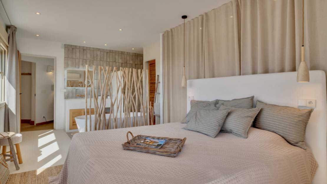 Op de hoofdverdieping bevindt zich een ruime slaapkamer met ingebouwde kasten en een en-suite microcement badkamer met inloopdouche en directe toegang tot het terras. De bovenverdieping beschikt over een multifunctionele ruimte en twee slaapkamers, elk met eigen badkamer. De master bedroom is een echte eyecatcher met panoramisch zeezicht, open badkamer met vrijstaand bad en douche, dressing en een privé overdekt terras.
