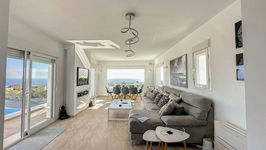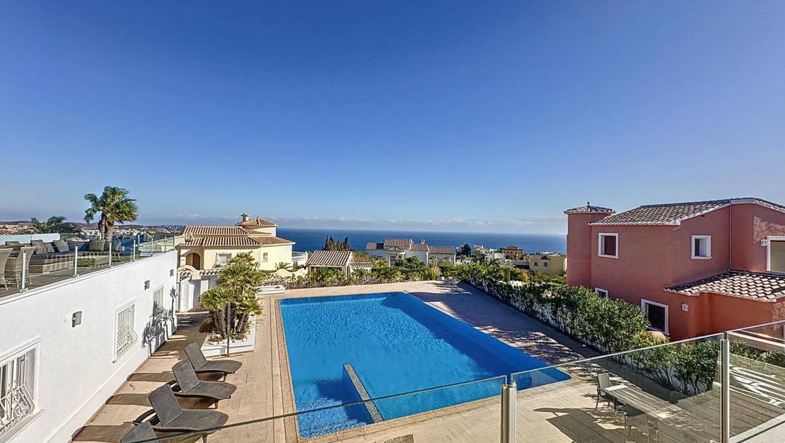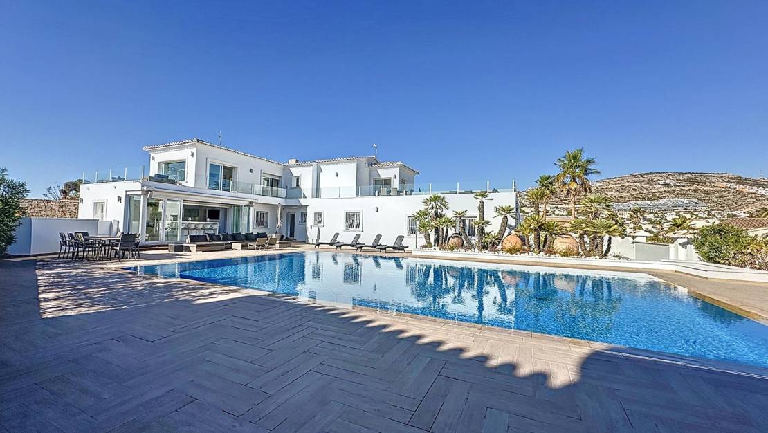 Villa met uitzicht op zee in de woonwijk Magnolias, Cumbre del Sol – Benitachell Een ruime, lichte woning met mediterrane uitstralingOntdek deze aantrekkelijke villa met spectaculair uitzicht op zee, gelegen in de woonwijk Magnolias, binnen de prestigieuze urbanisatie Cumbre del Sol, tussen Jávea en Moraira, in de gemeente Benitachell. Een unieke locatie waar rust, privacy en de natuurlijke omgeving worden gecombineerd met een indrukwekkend panoramisch uitzicht op de Middellandse Zee. Indeling en ruimtes van de woningDe villa heeft een totale bebouwde oppervlakte van ongeveer 413 m², verdeeld over twee verdiepingen, op een privéperceel van 976 m². De ruimtes zijn als volgt ingedeeld: 230 m² woonoppervlak, ontworpen om te genieten van de ruimte en het natuurlijke licht.30 m² afgesloten garage, met directe toegang tot de woning.20 m² aan opslagruimte en bergruimte.133 m² aan terrassen, ideaal om te genieten van het klimaat en het uitzicht op zee.Het interieur biedt vijf tweepersoonsslaapkamers met inbouwkasten, drie complete badkamers en een gastentoilet. De ruime woonkamer met panoramische ramen staat in verbinding met een open keuken in moderne stijl, waardoor een comfortabele en functionele ruimte ontstaat die perfect is voor het dagelijks leven. Daarnaast beschikt de woning over een wasruimte, een zomerkeuken bij het zwembad, een garage en een extra berging, waardoor alles aanwezig is om het hele jaar door comfortabel te kunnen wonen. Kwaliteit, comfort en een indrukwekkend uitzichtDeze villa is gebouwd in 2008 en verkeert in uitstekende staat. Enkele opvallende kenmerken zijn: Vloerverwarming.Airconditioning in het hele huis.Privézwembad van 8,5 x 14 meter met zonneterras.Zuidelijke ligging, wat het hele jaar door zorgt voor veel lichtinval en een aangename temperatuur.Een eigendom dat mediterraan design, functionaliteit en comfort combineert, ontworpen om vanuit elke hoek van het huis van het uitzicht op zee te genieten. Een unieke kans in Cumbre del SolDit eigendom is ideaal als hoofdverblijf of als tweede huis, dankzij de bevoorrechte ligging, de ruime opzet en de uitstekende staat. Als u op zoek bent naar een instapklare villa met uitzicht op zee en omgeven door natuur, dan is dit een kans die u niet mag missen. Neem vandaag nog contact met ons op en ontdek alle details van deze prachtige villa. Wij begeleiden u graag bij elke stap om u te helpen uw perfecte woning in Cumbre del Sol te vinden. Woonwijk Magnolias – Cumbre del SolDe woonwijk Magnolias ligt in de gerenommeerde urbanisatie Cumbre del Sol, in Benitachell, tussen Moraira en Jávea, twee van de meest exclusieve bestemmingen aan de noordkust van de Costa Blanca. Deze wijk onderscheidt zich door zijn rust, privacy en nabijheid tot de zee, met een panoramisch uitzicht over de Middellandse Zee en de Sierra de Bernia. De percelen van Magnolias zijn ruim, ideaal voor vrijstaande villa's met zwembad en privétuin. Bovendien ligt het op slechts enkele minuten van iconische stranden zoals Cala del Moraig of Cala Llebeig, evenals de internationale school Lady Elizabeth, het sportcentrum met padel- en tennisbanen en het winkelcentrum Adelfas, met een supermarkt, restaurant en apotheek. Dankzij de strategische ligging zijn zowel Moraira als Jávea gemakkelijk bereikbaar, met een directe verbinding met de kust, hoogwaardige voorzieningen en een prachtige natuurlijke omgeving. Wonen in de wijk Magnolias betekent genieten van de authenticiteit van de Middellandse Zee, modern comfort en de rust van een unieke omgeving aan de Costa Blanca.