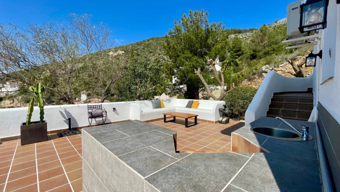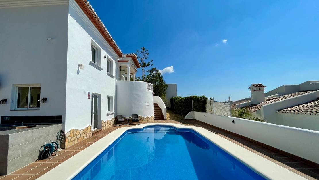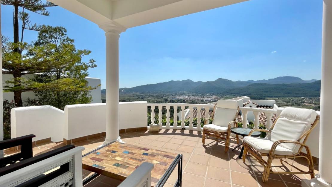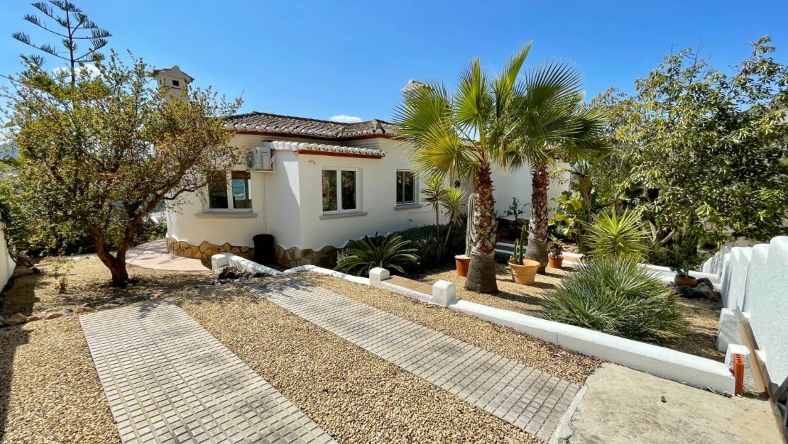 Vanaf de straat biedt een poort toegang tot een afsluitbare privé parkeerplaats op eigen terrein en een separate voetgangerspoort leidt via de voortuin direct naar woongedeelte van de woning dat zich volledig op één niveau bevindt. Via de hal betreedt u de lichte woon-/eetkamer met volledig ingerichte open keuken, die verbonden is met een gesloten bijkeuken waar we o.a. ook de wasmachine. Verder vinden we op dit niveau ook een hoofd slaapkamer met een en-suite badkamer, 2 slaapkamers en een separate badkamer. Eén van deze slaapkamers is momenteel in gebruik als kantoor. Alle slaapkamers zijn voorzien van inbouwkasten, rolluiken, plafondventilatoren en horren. De woonkamer is direct verbonden met het zuid georiënteerde en gedeeltelijk overdekte terras, tevens voorzien van zonwering, vanwaar het weidse uitzicht over het dorp en de vallei. Vanaf het terras bereiken we met een trap het lager gelegen ruime zwembadterras met het verwarmde 8 x 4 M. zwembad, een buitenkeuken, buitendouche, veel privacy en diverse zitjes. Ook betreden we via dit terras de onder verdieping met een ruim gastenverblijf, bestaande uit een woonkamer met open keuken, een slaapkamer met een aansluitende kleedkamer en een separate badkamer. Ook vinden we hier nog een ruime bergruimte. De volwassen, onderhoudsarme tuin is voorzien van sfeervolle verlichting.