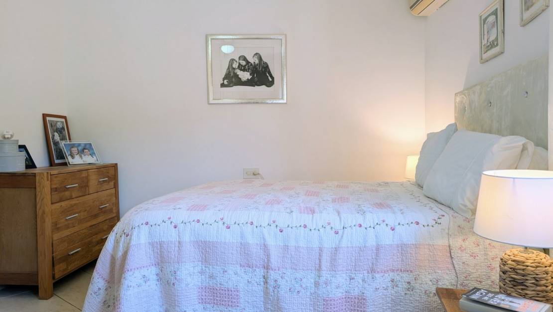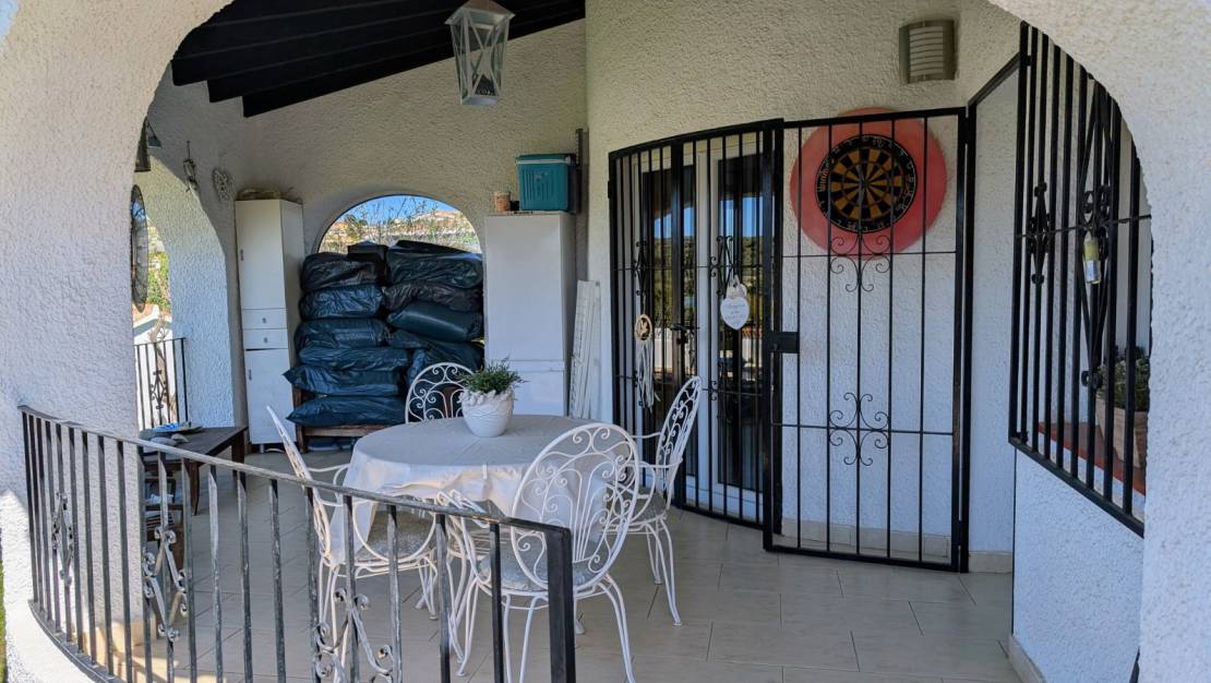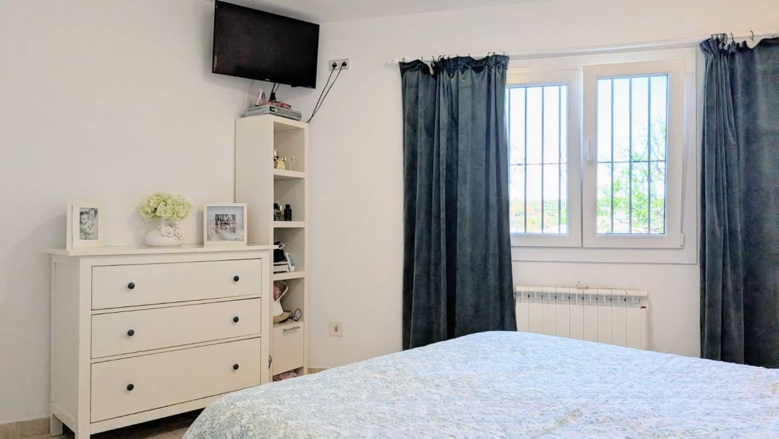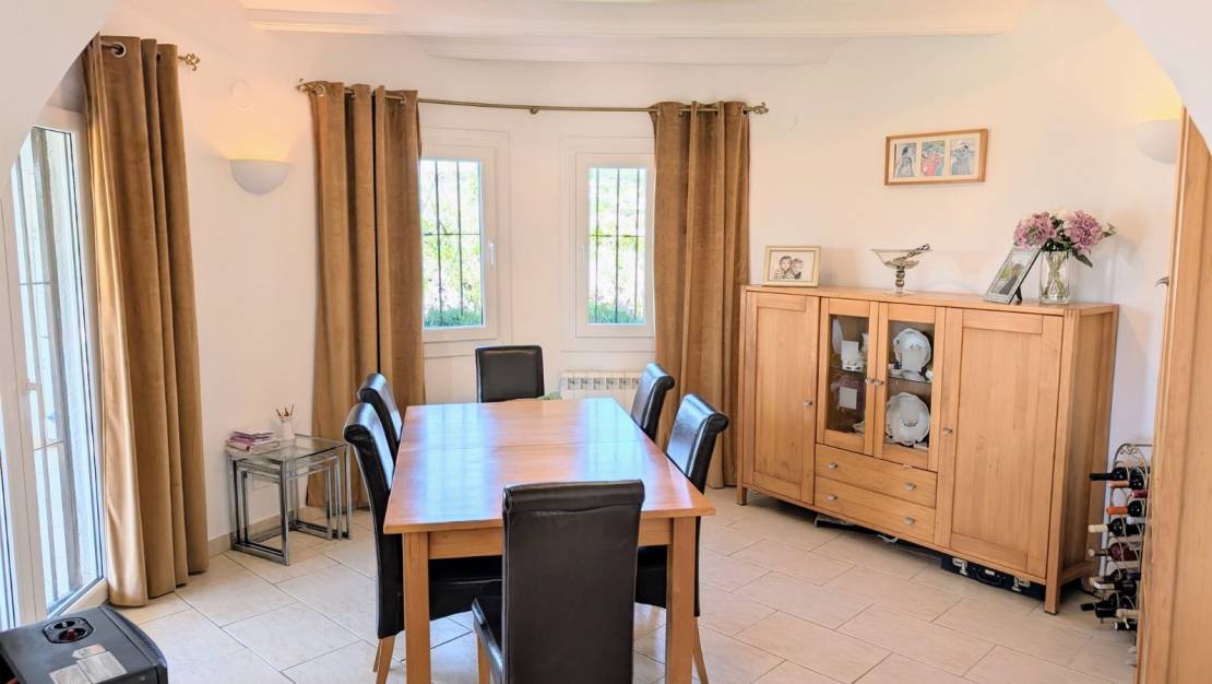 Deze smetteloze traditionele villa met de hele dag zon ligt in een rustige cul-de-sac aan de rand van Moraira, op slechts een korte wandeling naar de winkels en restaurants. Het huis ligt op een groot vlak rustiek perceel, waardoor het niet kan worden uitgebreid, met prachtig open uitzicht op de vallei en de bergen, en zelfs wat uitzicht op zee. Vanaf de oprit is er een kleine oprit met voldoende parkeerplaatsen die leidt naar een enkele garage met bergruimte. Vanaf de garage is er een vlak pad naar de trap met negen treden naar de villa en het zwembadterras. Je komt binnen in een open naya met prachtig uitzicht, een geweldige plek om te genieten van de zonsondergangen in het westen. Via de voordeur kom je direct in de ruime woonkamer met een open haard en een raam met uitzicht op het zwembad. Via een boog kom je in de eetkamer, een lichte ruimte met glazen deuren naar de naya en een raam. Links van de woonkamer is de keuken die is ingericht met glanzende roomkleurige eenheden en granieten werkbladen, inclusief oven, gaskookplaat, telescopische afzuigkap, vaatwasser van 45 cm, wasmachine en koelkast. Vanaf hier is er een hal naar de slaapkamers en de badkamer. Eerst is de tweede slaapkamer een ruime slaapkamer met ingebouwde kasten, airconditioning en een raam dat uitkijkt over de achtertuin. Vervolgens is de prachtig gerenoveerde badkamer met inloopdouche, badmeubel met zwart glazen wastafel en elektrische handdoekverwarming. Aan het einde van de gang is de ruime ouderslaapkamer met ingebouwde kasten, airconditioning en een televisie aan de muur voor vroege nachten of luie ochtenden! Het terras bij het zwembad is privé en zeer ruim met mooi open uitzicht, het heeft een pergola om te ontspannen in de schaduw, tafel en stoelen om buiten te eten, een barbecue, een koffietafel en stoelen en nog steeds genoeg ruimte voor ligbedden. Het perceel rondom de villa heeft gras, planten, struiken en verschillende amandelbomen, er is zoveel meer dat je kunt doen met de ruimte die beschikbaar is. Er is toegang tot een bergruimte onder de naya met beperkte hoofdhoogte.- Belangrijkste punten:- Gebouwd: 1983- Huidige eigenaren sinds 2006- Vrijstaande garage- Elektrische verwarming- Open haard- Airconditioning warm/koud in de slaapkamers en woonkamer- Dubbele beglazing in deuren en ramen- Ramen met horren en veiligheidsroosters- Internet beschikbaar- Meubilair: Overeen te komen- Jaarlijkse belastingen 544€ (onroerendgoedbelasting en vuilnisbelasting)- Woning heeft energiecertificaat en certificaat van bewoning- Afstanden:- Supermarkt en restaurants 150m - Bakker en apotheek 1.9km - Moraira centrum, strand en jachthaven 3.6km - Javea golf 4.4km- Snelweg toegang in Benissa 9km