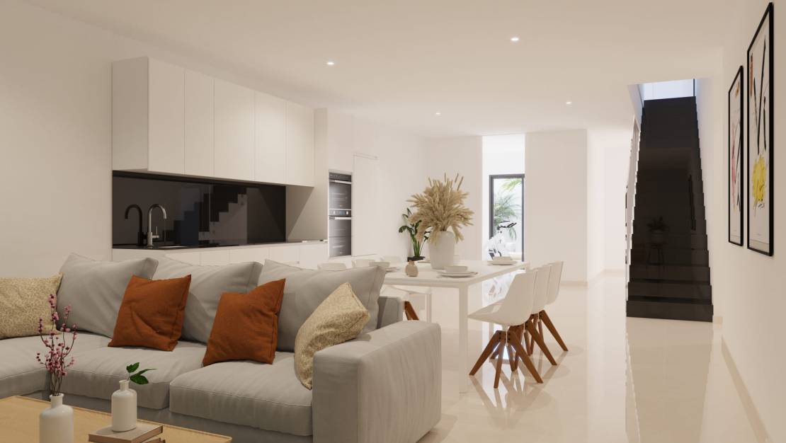 Wnętrze tych willi w Finestrat zostało zaprojektowane, aby zapewnić maksymalny komfort i funkcjonalność. Każda willa posiada trzy sypialnie i trzy łazienki, co zaspokaja potrzeby każdej rodziny. Podłogi z gresu porcelanowego dodają elegancji i trwałości. Wille są wyposażone w klimatyzację, co zapewnia przyjemną atmosferę przez cały rok. Urządzenia AGD są wliczone, co ułatwia codzienne życie od pierwszego dnia. Elektryczne rolety i wideodomofon dodają dodatkowego poziomu wygody i bezpieczeństwa. Wbudowane szafy oferują dużo miejsca do przechowywania, utrzymując porządek i organizację w domu.