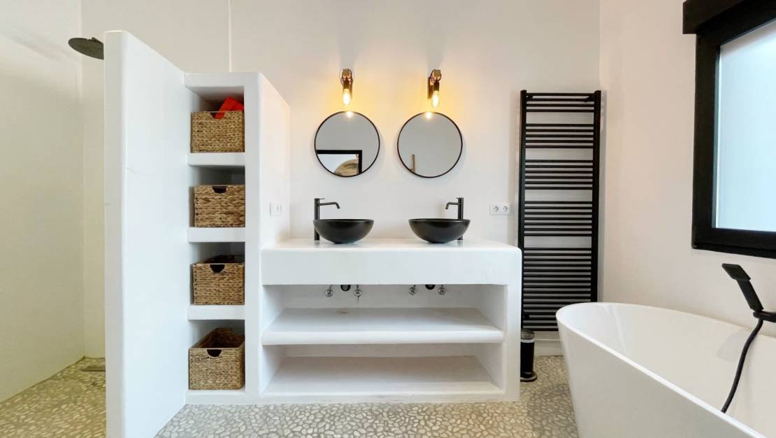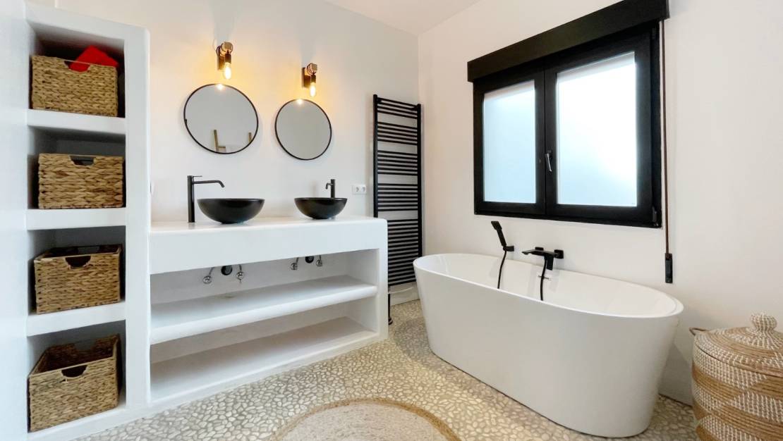 Dojazd do nieruchomości możliwy jest podjazdem do wiaty samochodowej z automatyczną bramą lub przez furtkę dla pieszych. Podjazd prowadzi bezpośrednio do części dziennej, a furtka dla pieszych prowadzi w dół małymi schodkami do pięknych, drewnianych drzwi antywłamaniowych. Drzwi te otwierają się na bardzo przestronne piętro, podzielone na przestronny salon z bezpośrednim dostępem do naya, kuchnię, salon z kominkiem i bardzo przestronną jadalnię. Wszystkie pomieszczenia mają otwartą przestrzeń. Do dyspozycji Gości jest również duża sypialnia, przestronna łazienka (z wanną i oddzielnym prysznicem) oraz toaleta dla gości. Z jadalni schody prowadzą do pokoju w wieży, obecnie wykorzystywanego jako sypialnia, ale który może również służyć jako biuro z przepięknym widokiem. Na niższym piętrze znajdują się dwie kolejne sypialnie, łazienka, duży schowek oraz dostęp do baru/salonu na przestronnym tarasie przy basenie.