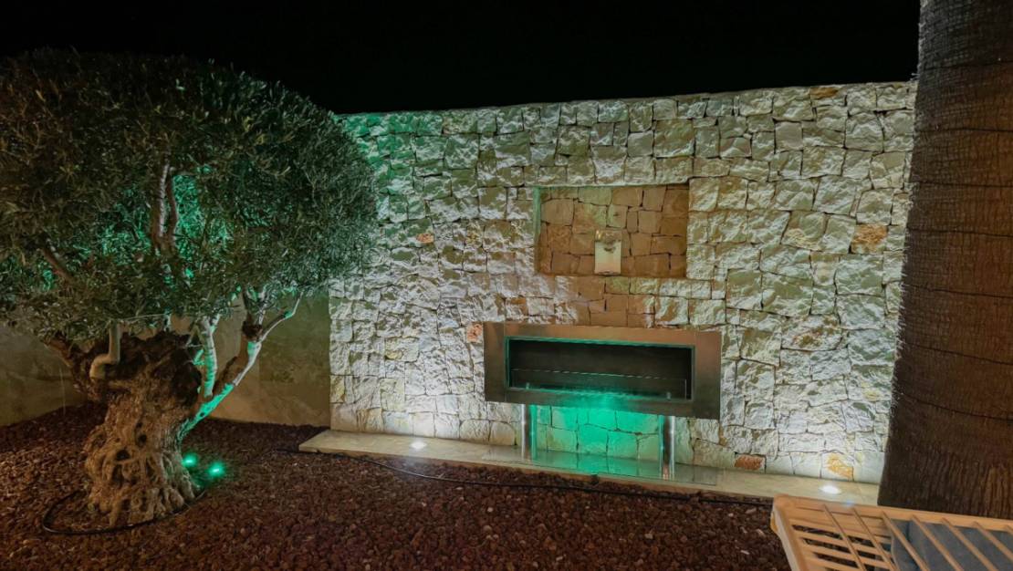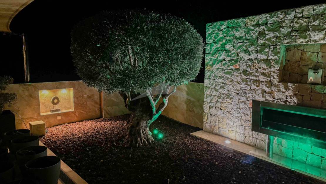 Ogród wyposażony jest w automatyczny system nawadniania, eleganckie oświetlenie i zewnętrzny kominek na paliwo płynne. Willa wyposażona jest również w 39 paneli słonecznych z bateriami (35 kWp/m), zapewniających niemal całkowitą autonomię energetyczną i pozwalających na utrzymanie temperatury wody w basenie na poziomie 25°C zimą.