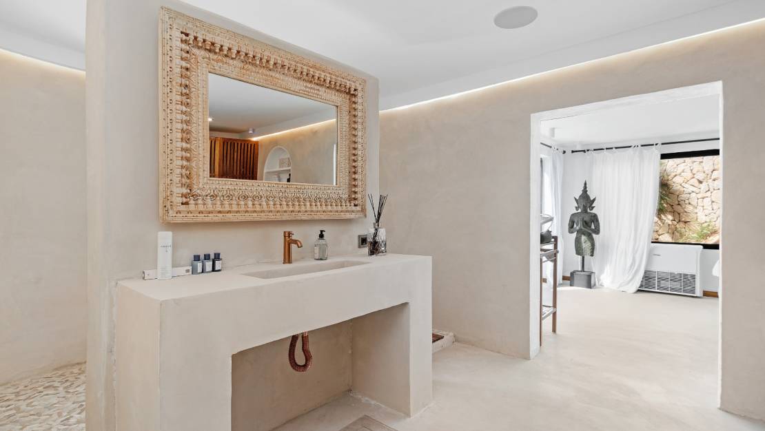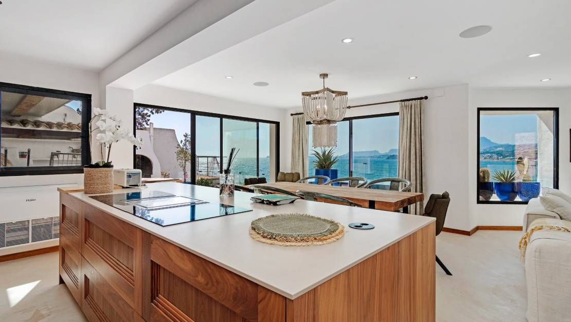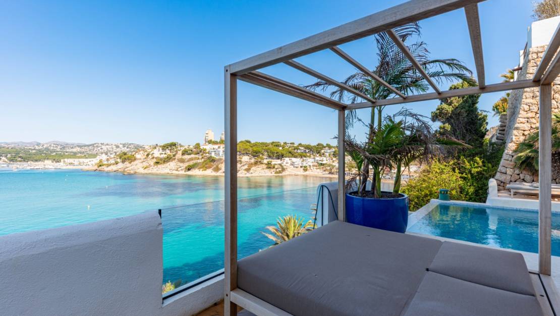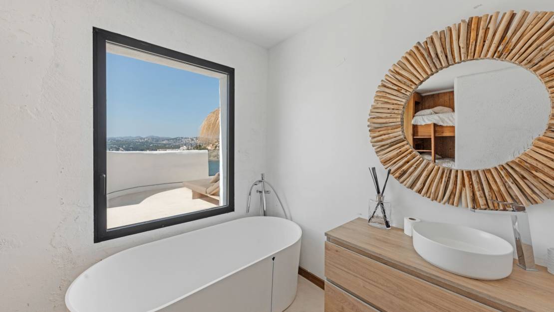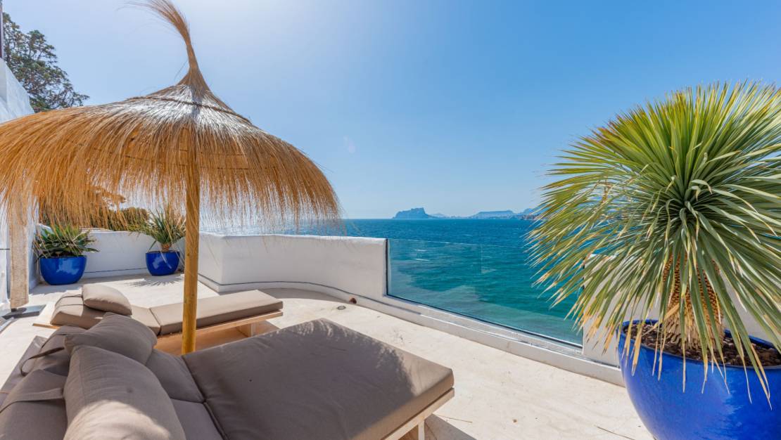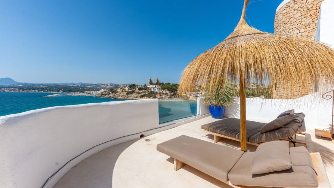 Villa with a unique style in the best area of Moraira, El Portet. Completely renovated in 2023/2024 in an Ibizan Balinese style. It is located on the seafront with a staircase directly to the sea. There are five bedrooms and five bathrooms in total, an open kitchen with a dining area and a terrace next to it with a barbecue and a terrace for dining. A very spacious dining room and living room with panoramic views of the sea, the Moraira Yacht Club and the Peñon de Ifach. Various terraces and pretty corners to relax and enjoy the view and the pool. On the main level we find the living room, dining room, kitchen, office and master bedroom with bathroom and dressing room and several terraces. On the upper level we have the main entrance, two bedrooms and two bathrooms and terraces. On the solarium level we have a room in the tower with a Turkish bath, sauna and terrace. In the solarium we find a large area with a bar for parties. Up in the tower there is a jacuzzi. The fifth, very spacious bedroom with its bathroom is separate from the house, ideal for guests. In the basement area there is a large space for a disco/cinema/wine cellar. There is the possibility to install an elevator to the street level. Air conditioning and heating throughout the house. Fully furnished and decorated in 2024. A unique property in a unique location