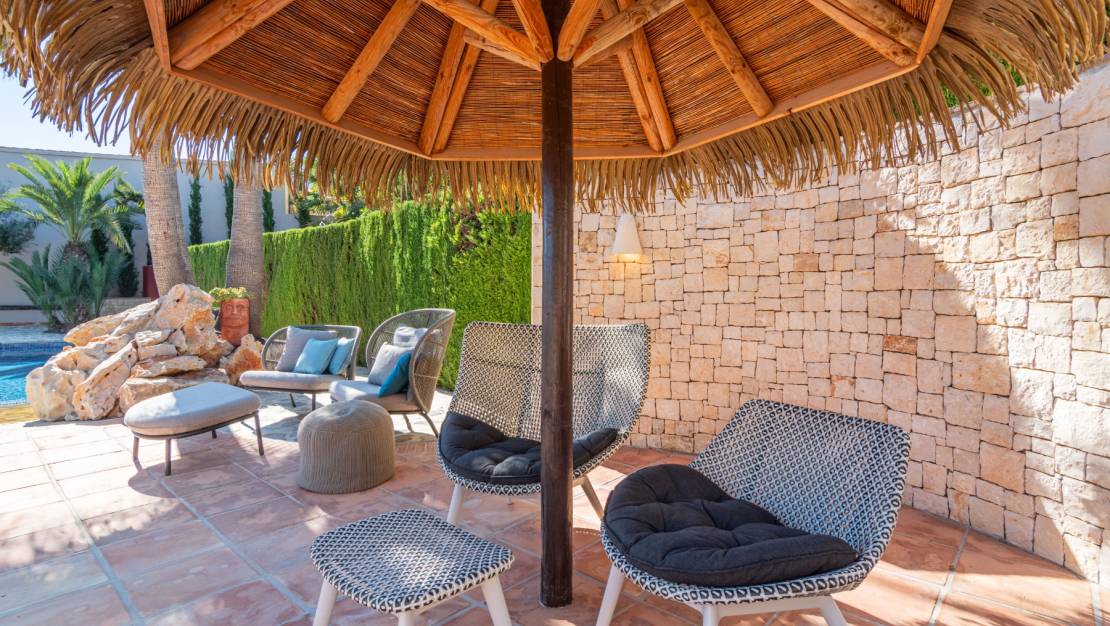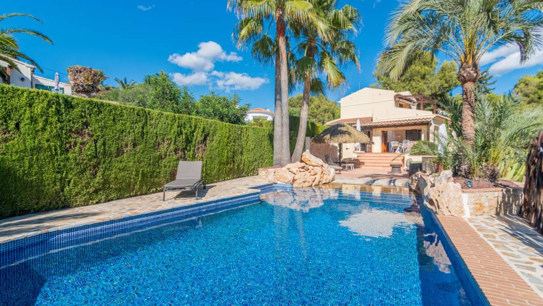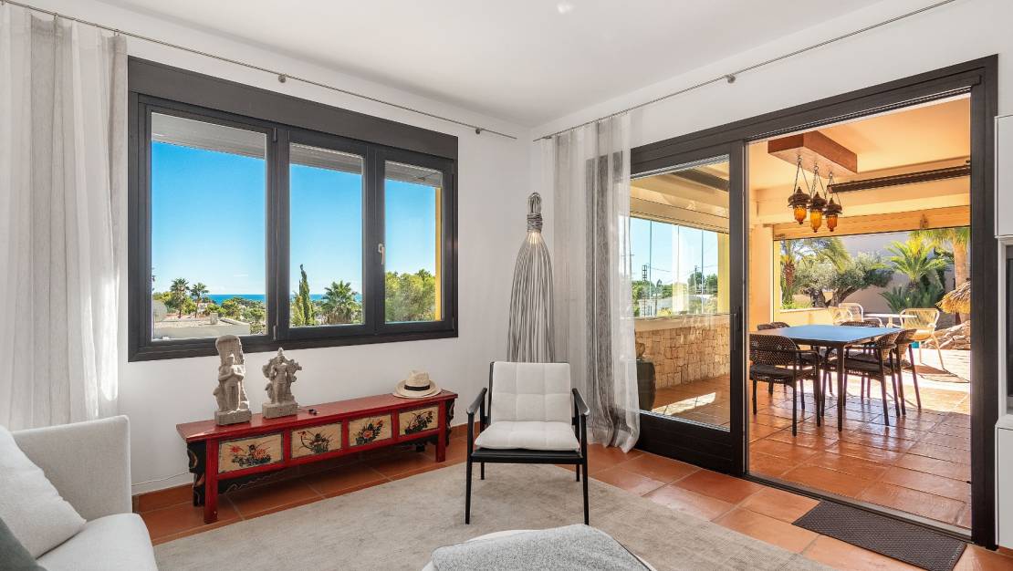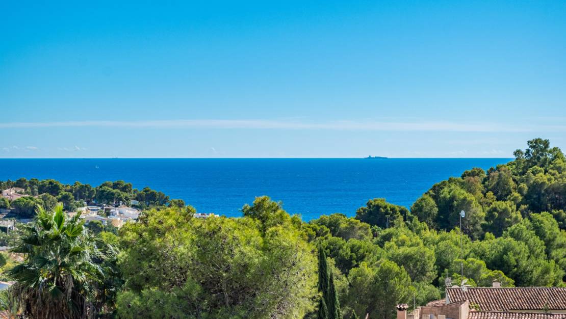 Impressive villa with pool and sea views in a very quiet area. The house has three floors, on the first floor there is the garage and two bedrooms with two bathrooms, the laundry room and the storage room. On the second floor is the living room with beautiful views and the open kitchen with dining room, a beautiful terrace with sliding doors to enjoy the views of the sea and pool at all times. Around the pool there is a beautiful well-kept garden. On the third floor is the master bedroom with bathroom and dressing room, there is also an incredible terrace with panoramic views of the sea. The house is very well maintained and is sold with home and garden furniture included in the price. Just a few minutes by car from the sea and supermarkets.