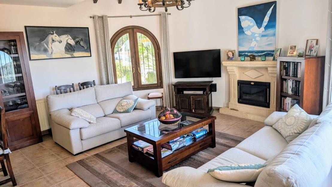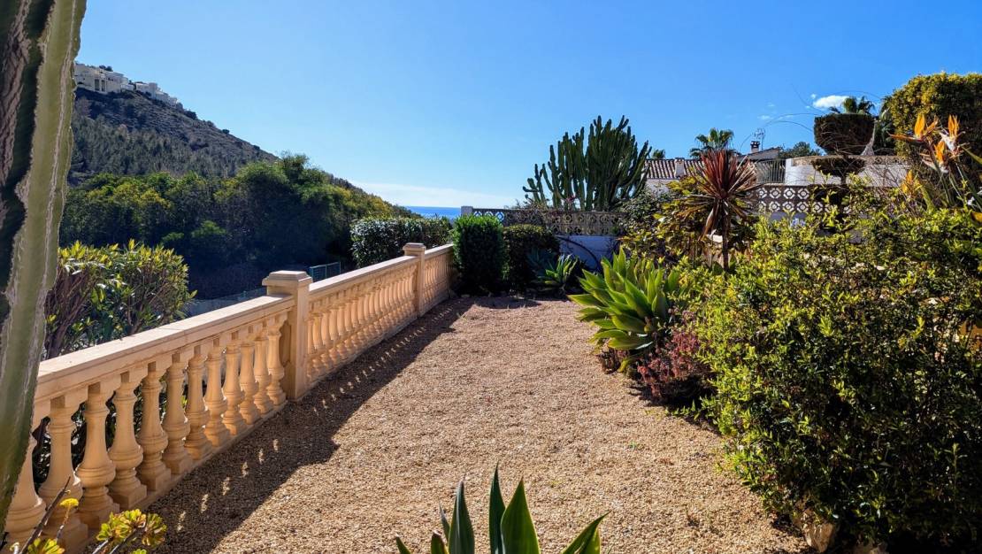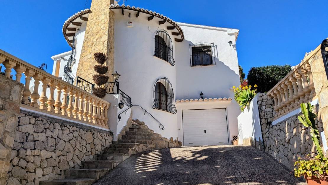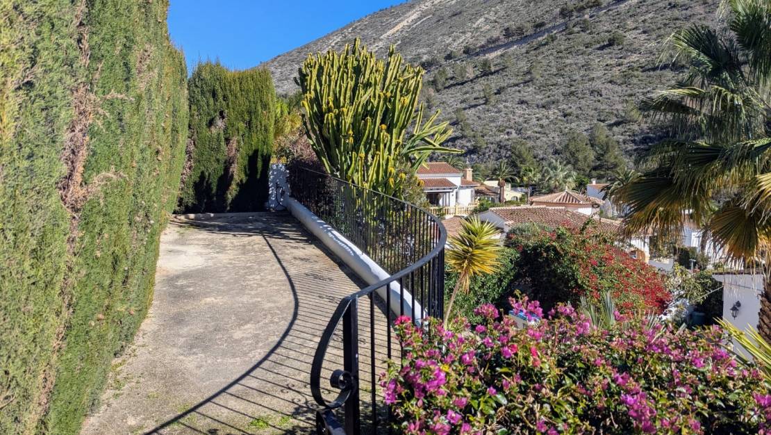 This very well maintained Mediterranean style villa with heated pool and garage is located in Valle del Portet on the outskirts of Moraira, just a short drive to the beach, supermarkets and town centre. The property is distributed over two separate floors and situated on a terraced plot with a beautiful mature garden. The villa is located on a residential street with access through electric gates to a driveway and garage. From here there is a choice of two staircases through the garden taking you to the principal living area on the first floor.  You enter the villa into a glazed naya with lovely views and space for both alfresco dining and relaxing, from here you enter the kitchen which has been fitted with pale wood effect units and golden granite worktops, it includes fridge/freezer, dishwasher, microwave, oven, ceramic hob and chimney extractor. Directly from the kitchen you enter the interior dining area and then the spacious and luminous living room which has an ornate fireplace. Through an opening in the dining area you enter a hallway with two double bedrooms with built-in wardrobes and air conditioning, a house bathroom with shower and vanity unit, and a master suite which includes a spacious bedroom with wardrobes, air conditioning and an en-suite bathroom with bath including shower attachment, vanity unit and a heated towel rail.Down an external staircase you reach the lower floor which is a guest area with a large private terrace. At the entrance there is a utility cupboard and then a spacious open naya. You enter into a small hallway, on the left is a spacious laundry/storage room, on the right is a huge bedroom with wardrobes and a large en-suite bathroom which includes bath, shower and vanity unit, your guests will not want to leave! At the bottom of the external staircase you arrive at the garage which includes the boiler and storage, and at the back of the garage there is a separate storeroom.The garden is special, from the boundary hedge by the road all the way up to the petanque area at the top of the plot the garden is full of plants, colourful flowers, cactii, palms, and lemon and nispero fruit trees. The pool terrace is spacious with plenty of space for sun loungers, a 9 x 4m pool and a pool shower. Off the pool terrace is a barbecue terrace with seating area for all of the family, also on this terrace there is a storeroom and the pool pump room.- Key points:- Built: 1990- Present owners since 2013- Very well maintained- Sea and valley views- Guest apartment- Laundry room- Utility cupboard- Garage with storeroom- Double glazed windows- Shutters and mosquito nets in the bedrooms- Awning outside the glazed naya- Gas central heating- Air conditioning in three upstairs bedrooms- Ornate fireplace with wood-burner- Heated 9 x 4m pool- Fiber optic internet available- Offered furnished- Annual taxes 800€+/- (property tax and rubbish tax)- Distance driving times:- Supermarket 3 minutes- El Portet beach 9 minutes- Moraira beach, marina and town centre 10 minutes- Javea golf 10 minutes- Motorway access in Benissa 15 minutes- If you are looking for a spacious villa with a beautiful garden, look no further, organise your visit today!