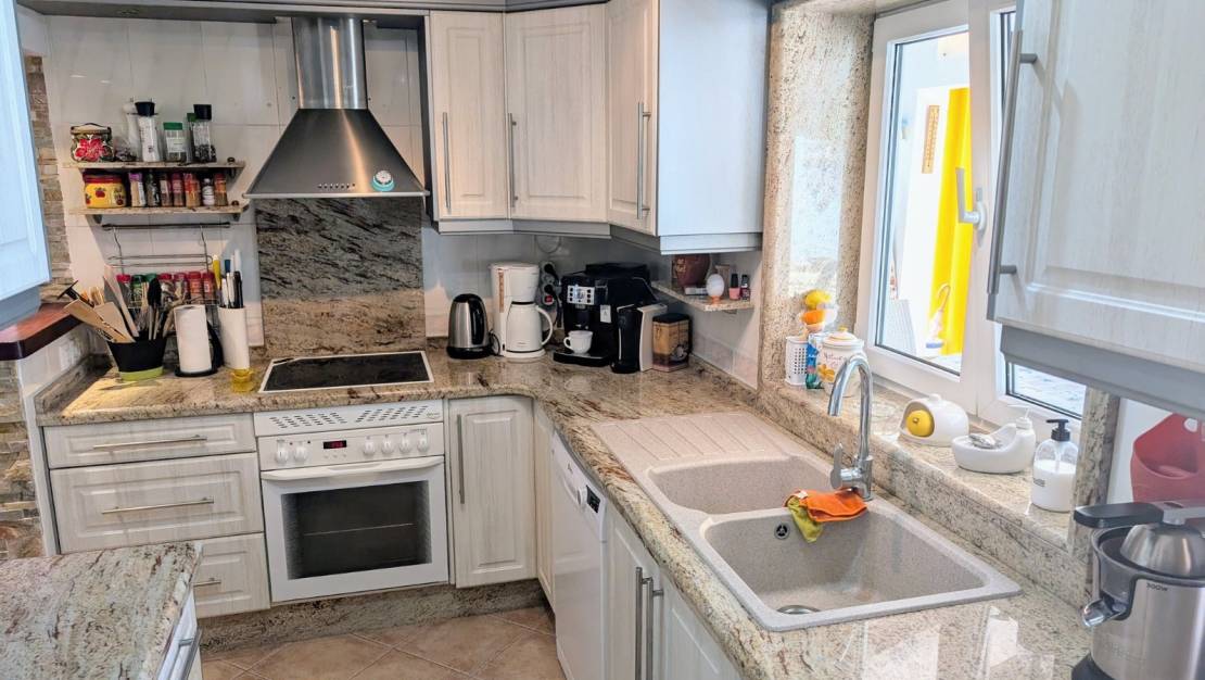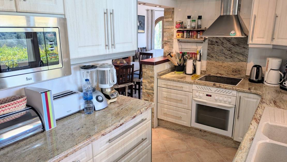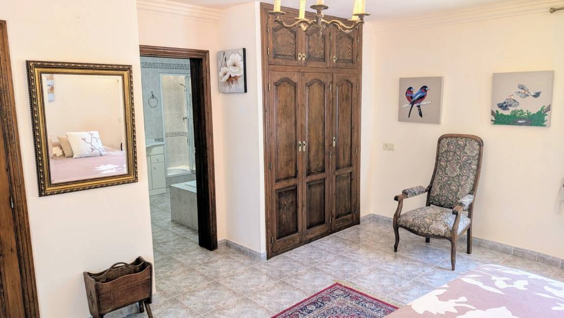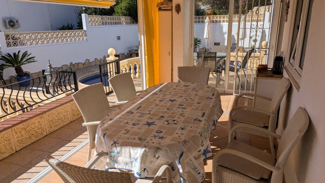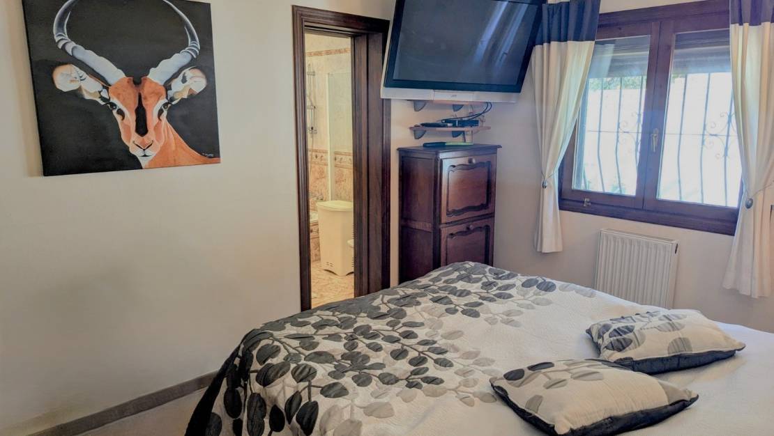 This very well maintained Mediterranean style villa with heated pool and garage is located in Valle del Portet on the outskirts of Moraira, just a short drive to the beach, supermarkets and town centre. The property is distributed over two separate floors and situated on a terraced plot with a beautiful mature garden. The villa is located on a residential street with access through electric gates to a driveway and garage. From here there is a choice of two staircases through the garden taking you to the principal living area on the first floor.  You enter the villa into a glazed naya with lovely views and space for both alfresco dining and relaxing, from here you enter the kitchen which has been fitted with pale wood effect units and golden granite worktops, it includes fridge/freezer, dishwasher, microwave, oven, ceramic hob and chimney extractor. Directly from the kitchen you enter the interior dining area and then the spacious and luminous living room which has an ornate fireplace. Through an opening in the dining area you enter a hallway with two double bedrooms with built-in wardrobes and air conditioning, a house bathroom with shower and vanity unit, and a master suite which includes a spacious bedroom with wardrobes, air conditioning and an en-suite bathroom with bath including shower attachment, vanity unit and a heated towel rail.Down an external staircase you reach the lower floor which is a guest area with a large private terrace. At the entrance there is a utility cupboard and then a spacious open naya. You enter into a small hallway, on the left is a spacious laundry/storage room, on the right is a huge bedroom with wardrobes and a large en-suite bathroom which includes bath, shower and vanity unit, your guests will not want to leave! At the bottom of the external staircase you arrive at the garage which includes the boiler and storage, and at the back of the garage there is a separate storeroom.The garden is special, from the boundary hedge by the road all the way up to the petanque area at the top of the plot the garden is full of plants, colourful flowers, cactii, palms, and lemon and nispero fruit trees. The pool terrace is spacious with plenty of space for sun loungers, a 9 x 4m pool and a pool shower. Off the pool terrace is a barbecue terrace with seating area for all of the family, also on this terrace there is a storeroom and the pool pump room.- Key points:- Built: 1990- Present owners since 2013- Very well maintained- Sea and valley views- Guest apartment- Laundry room- Utility cupboard- Garage with storeroom- Double glazed windows- Shutters and mosquito nets in the bedrooms- Awning outside the glazed naya- Gas central heating- Air conditioning in three upstairs bedrooms- Ornate fireplace with wood-burner- Heated 9 x 4m pool- Fiber optic internet available- Offered furnished- Annual taxes 800€+/- (property tax and rubbish tax)- Distance driving times:- Supermarket 3 minutes- El Portet beach 9 minutes- Moraira beach, marina and town centre 10 minutes- Javea golf 10 minutes- Motorway access in Benissa 15 minutes- If you are looking for a spacious villa with a beautiful garden, look no further, organise your visit today!