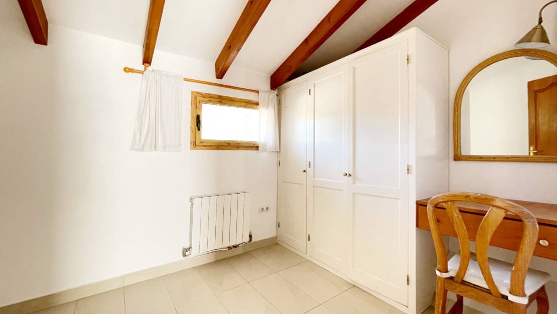 On the upper floor, accessed via an interior staircase, is the generous master bedroom with a walk-in wardrobe and en-suite bathroom. This room offers direct access to a spacious outdoor terrace with stunning views of Montgó and over the beautifully landscaped garden towards the green valley. In addition, there are two full double bedrooms with a shared bathroom, equipped with both bath and shower.