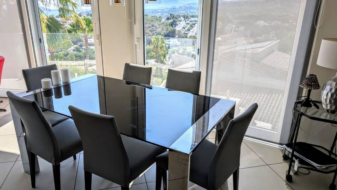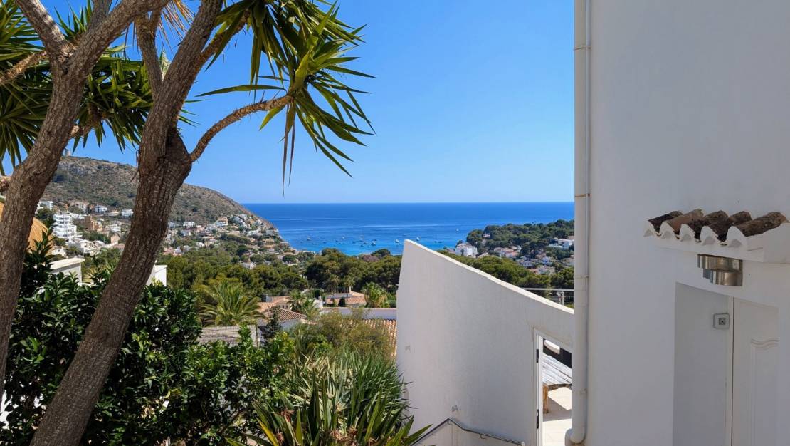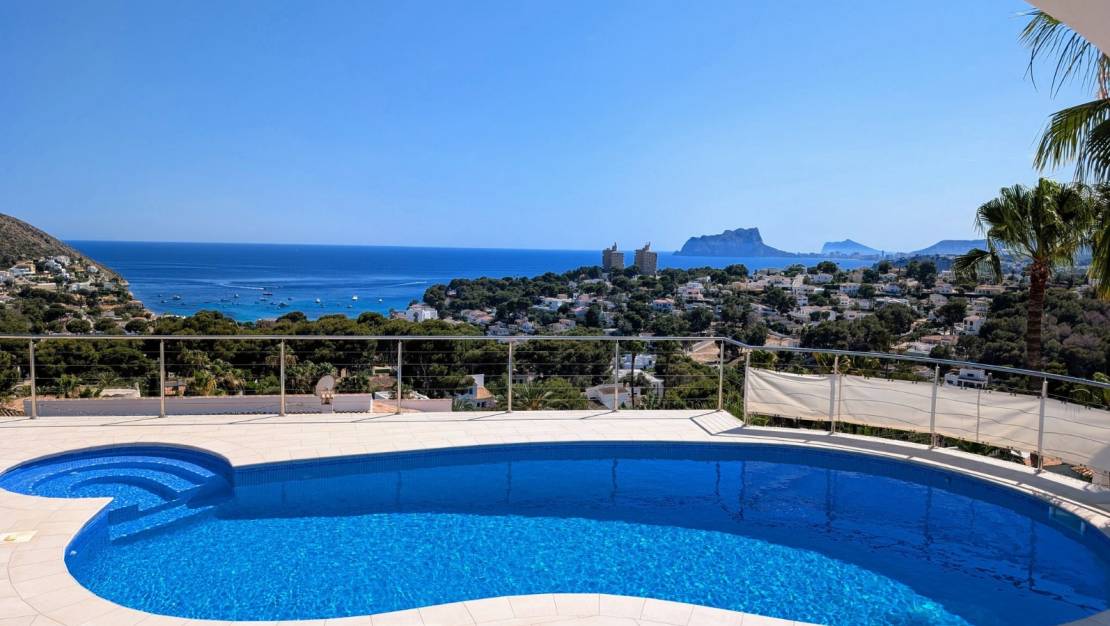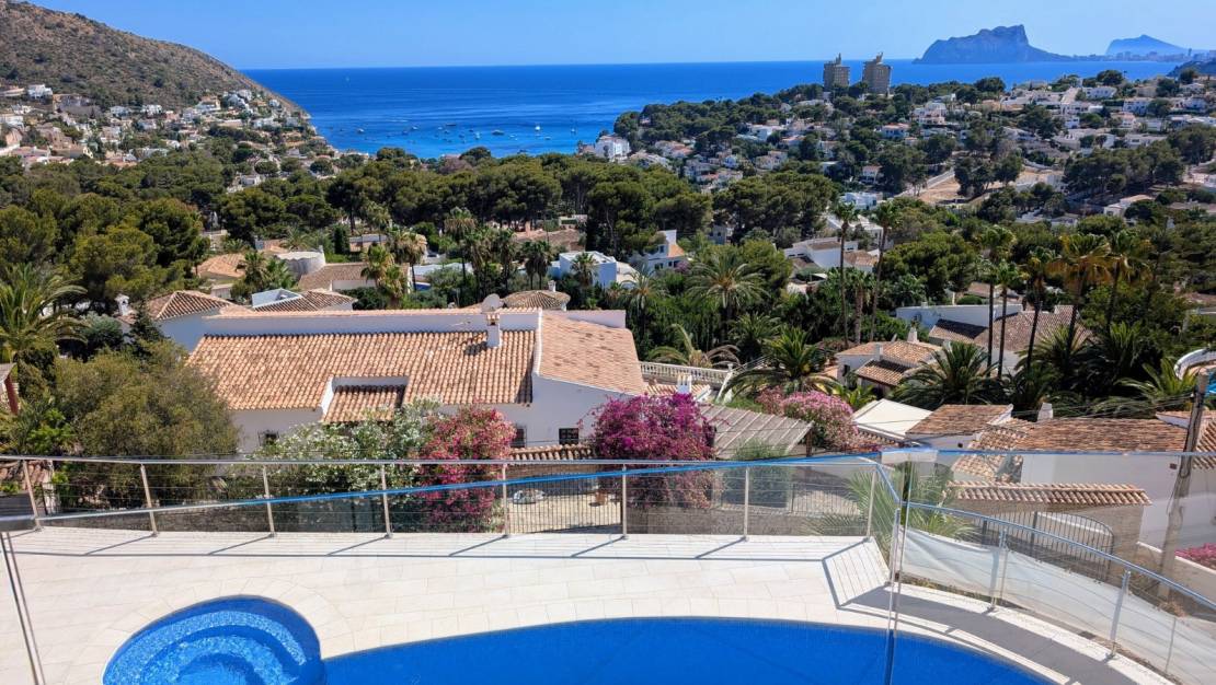 This traditional style villa with a contemporary interior is nestled in the hillside overlooking El Portet bay with the green zone behind. The villa is distributed over three floors, each offering remarkable views, and situated on an inclining plot in a very quiet residential street. There is parking at the top of the plot with steps down to the main living level, at the bottom of the plot there is a garage and off-road parking. You enter into the utility room and then directly into the spacious open plan living/dining/kitchen with wonderful views through the large windows and doors. The luxury kitchen is fully fitted with white gloss units and black Silestone worktops and includes a breakfast bar. There is a dining area and various areas for socialising, sitting and relaxing. The television area has an impressive black silestone fireplace with an integrated wood-burner. Outside there is a circular balcony. Off the living area there is a hallway with a guest toilet and the master bedroom with an en-suite shower room. Up the stairs next to the kitchen you will find a spacious office, a double bedroom with terrace and incredible views and a large roof space storeroom. Down the stairs from the living room you enter the poolside bar/kitchen a spacious room with dining area and a fully fitted kitchen with cream units and black granite worktops, from here there are a few steps down to the pool terrace. Through a door in this room you enter a large guest bedroom with an en-suite shower room and a door out to the open naya by the pool. The open naya has a relaxing area and a guest toilet for the pool. The pool area itself is spacious with a lovely pool, pool shower and plenty of space to enjoy the sun and the views. Through a door on the pool terrace you reach the staircase at the side of the villa which has a mature garden with plants, trees and palms. Up the steps there is a storeroom with the solar equipment, down the steps is a large storeroom with the pool pump equipment.- Key points:- Built 1977- Reformed by present owner since 2012- Aerothermal underfloor heating- Air conditioning- Solar panels with 22km batteries- 600 litre hot water storage- Auto-irrigation- Double glazed windows and doors- Shutters and mosquito screens- Easy maintenance garden- Fibre internet available- Awnings- Modern stainless steel and glass railings- Heated 32m2 pool with salt water- Annual rubbish tax 276€- Annual property tax to follow- Distances:- El Portet beach 1.2km- Town centre and marina 1.9km- Golf 5.7km- Water sports centre  11.5km- Motorway access in Benissa 12km- If you are looking for a villa with amazing views, look no further